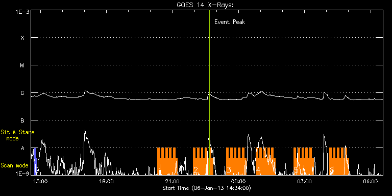 EIS Observation timeline overlay to GOES-Xray curve Code 1" 2" 40" 266" EIS Observations list for this event: STUDY ACRONYM ID DATE OBSERVED DESCRIPTION NOAA# TARGET 0 PRY_slot_context_v3 | 31444 | 2013/01/06 14:43:19 | Active Region Study at W-limb | 1638 | Active Region TIMELINE ID DATE OBSERVED FITS FILE XCEN (+W/-E) YCEN (+N/-S) DUR ----------------------------------------------------------------------------------------------------------------- 31444 | 2013/01/06 14:43:19.000 | eis_l0_20130106_144319.fits.gz | 774.88 | 464.30 | 2m56s 31444 | 2013/01/06 14:46:19.000 | eis_l0_20130106_144619.fits.gz | 775.03 | 464.53 | 2m56s 1 HH_Flare+AR_180x152 | 31467 | 2013/01/06 20:19:33 | Active Region Study at W-limb | 1640 | Flare TIMELINE ID DATE OBSERVED FITS FILE XCEN (+W/-E) YCEN (+N/-S) DUR ----------------------------------------------------------------------------------------------------------------- 31467 | 2013/01/06 20:19:33.000 | eis_l0_20130106_201933.fits.gz | 824.83 | 461.36 | 5m18s 31467 | 2013/01/06 20:24:53.000 | eis_l0_20130106_202453.fits.gz | 824.83 | 461.36 | 5m18s 31467 | 2013/01/06 20:30:14.000 | eis_l0_20130106_203014.fits.gz | 824.83 | 461.36 | 5m18s 31467 | 2013/01/06 20:35:35.000 | eis_l0_20130106_203535.fits.gz | 824.83 | 461.44 | 5m18s 31467 | 2013/01/06 20:40:56.000 | eis_l0_20130106_204056.fits.gz | 824.75 | 461.60 | 5m18s 31467 | 2013/01/06 20:46:17.000 | eis_l0_20130106_204617.fits.gz | 824.83 | 461.36 | 5m18s 31467 | 2013/01/06 20:51:38.000 | eis_l0_20130106_205138.fits.gz | 824.83 | 461.44 | 5m18s 31467 | 2013/01/06 20:56:59.000 | eis_l0_20130106_205659.fits.gz | 824.83 | 461.29 | 5m18s 31467 | 2013/01/06 21:02:20.000 | eis_l0_20130106_210220.fits.gz | 824.83 | 461.36 | 5m17s 31467 | 2013/01/06 21:07:40.000 | eis_l0_20130106_210740.fits.gz | 824.75 | 461.36 | 5m18s 2 HH_Flare+AR_180x152 | 31468 | 2013/01/06 21:56:40 | Active Region Study at W-limb | 1640 | Flare TIMELINE ID DATE OBSERVED FITS FILE XCEN (+W/-E) YCEN (+N/-S) DUR ----------------------------------------------------------------------------------------------------------------- 31468 | 2013/01/06 21:56:40.000 | eis_l0_20130106_215640.fits.gz | 824.75 | 461.36 | 5m18s 31468 | 2013/01/06 22:02:01.000 | eis_l0_20130106_220201.fits.gz | 824.83 | 461.29 | 5m18s 31468 | 2013/01/06 22:07:22.000 | eis_l0_20130106_220722.fits.gz | 824.75 | 461.36 | 5m17s 31468 | 2013/01/06 22:12:42.000 | eis_l0_20130106_221242.fits.gz | 824.83 | 461.44 | 5m18s 31468 | 2013/01/06 22:18:03.000 | eis_l0_20130106_221803.fits.gz | 824.83 | 461.36 | 5m18s 31468 | 2013/01/06 22:23:23.000 | eis_l0_20130106_222323.fits.gz | 824.91 | 461.44 | 5m19s 31468 | 2013/01/06 22:28:45.000 | eis_l0_20130106_222845.fits.gz | 824.83 | 461.44 | 5m18s 31468 | 2013/01/06 22:34:05.000 | eis_l0_20130106_223405.fits.gz | 824.75 | 461.36 | 5m18s 31468 | 2013/01/06 22:39:26.000 | eis_l0_20130106_223926.fits.gz | 824.91 | 461.36 | 5m17s 31468 | 2013/01/06 22:44:46.000 | eis_l0_20130106_224446.fits.gz | 824.83 | 461.29 | 5m18s 3 HH_Flare+AR_180x152 | 31469 | 2013/01/06 23:27:12 | Active Region Study at W-limb | 1640 | Flare TIMELINE ID DATE OBSERVED FITS FILE XCEN (+W/-E) YCEN (+N/-S) DUR ----------------------------------------------------------------------------------------------------------------- 31469 | 2013/01/06 23:27:12.000 | eis_l0_20130106_232712.fits.gz | 824.91 | 461.44 | 5m18s 31469 | 2013/01/06 23:32:33.000 | eis_l0_20130106_233233.fits.gz | 824.83 | 461.44 | 5m18s 31469 | 2013/01/06 23:37:54.000 | eis_l0_20130106_233754.fits.gz | 824.83 | 461.29 | 5m18s 31469 | 2013/01/06 23:43:15.000 | eis_l0_20130106_234315.fits.gz | 824.75 | 461.44 | 5m18s 31469 | 2013/01/06 23:48:35.000 | eis_l0_20130106_234835.fits.gz | 824.83 | 461.36 | 5m19s 31469 | 2013/01/06 23:53:56.000 | eis_l0_20130106_235356.fits.gz | 824.75 | 461.36 | 5m18s 31469 | 2013/01/06 23:59:17.000 | eis_l0_20130106_235917.fits.gz | 824.75 | 461.52 | 5m19s 31469 | 2013/01/07 00:04:38.000 | eis_l0_20130107_000438.fits.gz | 824.83 | 461.36 | 5m18s 31469 | 2013/01/07 00:09:59.000 | eis_l0_20130107_000959.fits.gz | 824.83 | 461.29 | 5m18s 31469 | 2013/01/07 00:15:19.000 | eis_l0_20130107_001519.fits.gz | 824.75 | 461.44 | 5m18s 4 HH_Flare+AR_180x152 | 31470 | 2013/01/07 00:47:13 | Active Region Study at W-limb | 1640 | Flare TIMELINE ID DATE OBSERVED FITS FILE XCEN (+W/-E) YCEN (+N/-S) DUR ----------------------------------------------------------------------------------------------------------------- 31470 | 2013/01/07 00:47:13.000 | eis_l0_20130107_004713.fits.gz | 824.75 | 461.36 | 5m17s 31470 | 2013/01/07 00:52:33.000 | eis_l0_20130107_005233.fits.gz | 824.83 | 461.36 | 5m18s 31470 | 2013/01/07 00:57:53.000 | eis_l0_20130107_005753.fits.gz | 824.83 | 461.44 | 5m18s 31470 | 2013/01/07 01:03:14.000 | eis_l0_20130107_010314.fits.gz | 824.83 | 461.44 | 5m17s 31470 | 2013/01/07 01:08:34.000 | eis_l0_20130107_010834.fits.gz | 824.75 | 461.44 | 5m18s 31470 | 2013/01/07 01:13:55.000 | eis_l0_20130107_011355.fits.gz | 824.83 | 461.29 | 5m18s 31470 | 2013/01/07 01:19:16.000 | eis_l0_20130107_011916.fits.gz | 824.83 | 461.36 | 5m19s 31470 | 2013/01/07 01:24:37.000 | eis_l0_20130107_012437.fits.gz | 824.83 | 461.44 | 5m18s 31470 | 2013/01/07 01:29:58.000 | eis_l0_20130107_012958.fits.gz | 824.83 | 461.36 | 5m18s 31470 | 2013/01/07 01:35:19.000 | eis_l0_20130107_013519.fits.gz | 824.75 | 461.44 | 5m18s 5 HH_Flare+AR_180x152 | 31471 | 2013/01/07 02:30:42 | Active Region Study at W-limb | 1640 | Flare TIMELINE ID DATE OBSERVED FITS FILE XCEN (+W/-E) YCEN (+N/-S) DUR ----------------------------------------------------------------------------------------------------------------- 31471 | 2013/01/07 02:30:42.000 | eis_l0_20130107_023042.fits.gz | 824.83 | 461.36 | 5m18s 31471 | 2013/01/07 02:36:03.000 | eis_l0_20130107_023603.fits.gz | 824.91 | 461.36 | 5m18s 31471 | 2013/01/07 02:41:24.000 | eis_l0_20130107_024124.fits.gz | 824.83 | 461.36 | 5m18s 31471 | 2013/01/07 02:46:45.000 | eis_l0_20130107_024645.
