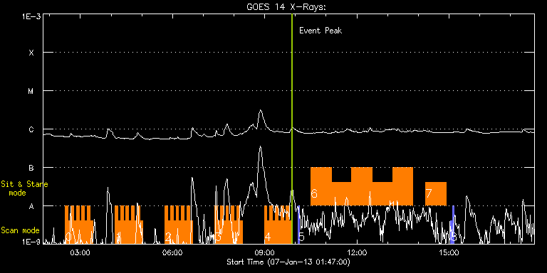 EIS Observation timeline overlay to GOES-Xray curve Code 1" 2" 40" 266" EIS Observations list for this event: STUDY ACRONYM ID DATE OBSERVED DESCRIPTION NOAA# TARGET 0 HH_Flare+AR_180x152 | 31471 | 2013/01/07 02:30:42 | Active Region Study at W-limb | 1640 | Flare TIMELINE ID DATE OBSERVED FITS FILE XCEN (+W/-E) YCEN (+N/-S) DUR ----------------------------------------------------------------------------------------------------------------- 31471 | 2013/01/07 02:30:42.000 | eis_l0_20130107_023042.fits.gz | 824.83 | 461.36 | 5m18s 31471 | 2013/01/07 02:36:03.000 | eis_l0_20130107_023603.fits.gz | 824.91 | 461.36 | 5m18s 31471 | 2013/01/07 02:41:24.000 | eis_l0_20130107_024124.fits.gz | 824.83 | 461.36 | 5m18s 31471 | 2013/01/07 02:46:45.000 | eis_l0_20130107_024645.fits.gz | 824.75 | 461.44 | 5m18s 31471 | 2013/01/07 02:52:06.000 | eis_l0_20130107_025206.fits.gz | 824.91 | 461.29 | 5m18s 31471 | 2013/01/07 02:57:26.000 | eis_l0_20130107_025726.fits.gz | 824.75 | 461.29 | 5m19s 31471 | 2013/01/07 03:02:48.000 | eis_l0_20130107_030248.fits.gz | 824.83 | 461.36 | 5m17s 31471 | 2013/01/07 03:08:08.000 | eis_l0_20130107_030808.fits.gz | 824.83 | 461.36 | 5m17s 31471 | 2013/01/07 03:13:28.000 | eis_l0_20130107_031328.fits.gz | 824.75 | 461.44 | 5m19s 31471 | 2013/01/07 03:18:50.000 | eis_l0_20130107_031850.fits.gz | 824.75 | 461.52 | 5m17s 1 HH_Flare+AR_180x152 | 31472 | 2013/01/07 04:07:42 | Active Region Study at W-limb | 1640 | Flare TIMELINE ID DATE OBSERVED FITS FILE XCEN (+W/-E) YCEN (+N/-S) DUR ----------------------------------------------------------------------------------------------------------------- 31472 | 2013/01/07 04:07:42.000 | eis_l0_20130107_040742.fits.gz | 824.75 | 461.44 | 5m17s 31472 | 2013/01/07 04:13:02.000 | eis_l0_20130107_041302.fits.gz | 824.91 | 461.36 | 5m17s 31472 | 2013/01/07 04:18:22.000 | eis_l0_20130107_041822.fits.gz | 824.83 | 461.44 | 5m18s 31472 | 2013/01/07 04:23:43.000 | eis_l0_20130107_042343.fits.gz | 824.91 | 461.44 | 5m18s 31472 | 2013/01/07 04:29:04.000 | eis_l0_20130107_042904.fits.gz | 824.75 | 461.36 | 5m18s 31472 | 2013/01/07 04:34:25.000 | eis_l0_20130107_043425.fits.gz | 824.83 | 461.36 | 5m18s 31472 | 2013/01/07 04:39:46.000 | eis_l0_20130107_043946.fits.gz | 824.83 | 461.36 | 5m18s 31472 | 2013/01/07 04:45:07.000 | eis_l0_20130107_044507.fits.gz | 824.75 | 461.36 | 5m18s 31472 | 2013/01/07 04:50:28.000 | eis_l0_20130107_045028.fits.gz | 824.83 | 461.36 | 5m18s 31472 | 2013/01/07 04:55:48.000 | eis_l0_20130107_045548.fits.gz | 824.83 | 461.44 | 5m17s 2 HH_Flare+AR_180x152 | 31473 | 2013/01/07 05:45:12 | Active Region Study at W-limb | 1640 | Flare TIMELINE ID DATE OBSERVED FITS FILE XCEN (+W/-E) YCEN (+N/-S) DUR ----------------------------------------------------------------------------------------------------------------- 31473 | 2013/01/07 05:45:12.000 | eis_l0_20130107_054512.fits.gz | 824.75 | 461.44 | 5m18s 31473 | 2013/01/07 05:50:33.000 | eis_l0_20130107_055033.fits.gz | 824.91 | 461.36 | 5m18s 31473 | 2013/01/07 05:55:54.000 | eis_l0_20130107_055554.fits.gz | 824.75 | 461.36 | 5m17s 31473 | 2013/01/07 06:01:14.000 | eis_l0_20130107_060114.fits.gz | 824.83 | 461.36 | 5m18s 31473 | 2013/01/07 06:06:35.000 | eis_l0_20130107_060635.fits.gz | 824.83 | 461.36 | 5m18s 31473 | 2013/01/07 06:11:56.000 | eis_l0_20130107_061156.fits.gz | 824.75 | 461.29 | 5m17s 31473 | 2013/01/07 06:17:16.000 | eis_l0_20130107_061716.fits.gz | 824.83 | 461.44 | 5m19s 31473 | 2013/01/07 06:22:37.000 | eis_l0_20130107_062237.fits.gz | 824.83 | 461.44 | 5m18s 31473 | 2013/01/07 06:27:58.000 | eis_l0_20130107_062758.fits.gz | 824.83 | 461.44 | 5m19s 31473 | 2013/01/07 06:33:19.000 | eis_l0_20130107_063319.fits.gz | 824.75 | 461.44 | 5m18s 3 HH_Flare+AR_180x152 | 31474 | 2013/01/07 07:22:42 | Active Region Study at W-limb | 1640 | Flare TIMELINE ID DATE OBSERVED FITS FILE XCEN (+W/-E) YCEN (+N/-S) DUR ----------------------------------------------------------------------------------------------------------------- 31474 | 2013/01/07 07:22:42.000 | eis_l0_20130107_072242.fits.gz | 824.75 | 461.44 | 5m18s 31474 | 2013/01/07 07:28:03.000 | eis_l0_20130107_072803.fits.gz | 824.91 | 461.44 | 5m18s 31474 | 2013/01/07 07:33:24.000 | eis_l0_20130107_073324.fits.gz | 824.83 | 461.36 | 5m18s 31474 | 2013/01/07 07:38:45.000 | eis_l0_20130107_073845.fits.gz | 824.75 | 461.44 | 5m17s 31474 | 2013/01/07 07:44:05.000 | eis_l0_20130107_074405.fits.gz | 824.75 | 461.44 | 5m18s 31474 | 2013/01/07 07:49:26.000 | eis_l0_20130107_074926.fits.gz | 824.75 | 461.44 | 5m17s 31474 | 2013/01/07 07:54:46.000 | eis_l0_20130107_075446.fits.gz | 824.75 | 461.36 | 5m17s 31474 | 2013/01/07 08:00:06.000 | eis_l0_20130107_080006.fits.gz | 824.83 | 461.36 | 5m18s 31474 | 2013/01/07 08:05:27.000 | eis_l0_20130107_080527.fits.gz | 824.83 | 461.36 | 5m18s 31474 | 2013/01/07 08:10:48.000 | eis_l0_20130107_081048.fits.gz | 824.75 | 461.29 | 5m17s 4 HH_Flare+AR_180x152 | 31475 | 2013/01/07 08:59:12 | Active Region Study at W-limb | 1640 | Flare TIMELINE ID DATE OBSERVED FITS FILE XCEN (+W/-E) YCEN (+N/-S) DUR ----------------------------------------------------------------------------------------------------------------- 31475 | 2013/01/07 08:59:12.000 | eis_l0_20130107_085912.fits.gz | 824.75 | 461.44 | 5m19s 31475 | 2013/01/07 09:04:34.000 | eis_l0_20130107_090434.fits.gz | 824.83 | 461.52 | 5m17s 31475 | 2013/01/07 09:09:54.000 | eis_l0_20130107_090954.fits.gz | 824.83 | 461.36 | 5m18s 31475 | 2013/01/07 09:15:14.000 | eis_l0_20130107_091514.fits.gz | 824.75 | 461.36 | 5m19s 31475 | 2013/01/07 09:20:36.000 | eis_l0_20130107_092036.fits.gz | 824.83 | 461.36 | 5m17s 31475 | 2013/01/07 09:25:56.000 | eis_l0_20130107_092556.fits.gz | 824.83 | 461.36 | 5m18s 31475 | 2013/01/07 09:31:16.000 | eis_l0_20130107_093116.fits.gz | 824.75 | 461.44 | 5m19s 31475 | 2013/01/07 09:36:37.000 | eis_l0_20130107_093637.fits.gz | 824.75 | 461.44 | 5m18s 31475 | 2013/01/07 09:41:58.000 | eis_l0_20130107_094158.fits.gz | 824.