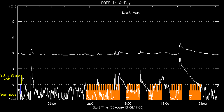 EIS Observation timeline overlay to GOES-Xray curve Code 1" 2" 40" 266" EIS Observations list for this event: STUDY ACRONYM ID DATE OBSERVED DESCRIPTION NOAA# TARGET 0 PRY_slot_contextLITE | 31433 | 2013/01/08 06:29:12 | | 1648 | Active Region TIMELINE ID DATE OBSERVED FITS FILE XCEN (+W/-E) YCEN (+N/-S) DUR ----------------------------------------------------------------------------------------------------------------- 31433 | 2013/01/08 06:29:12.000 | eis_l0_20130108_062912.fits.gz | -15.21 | -0.65 | 2m56s 1 Alignment_266 | 31434 | 2013/01/08 06:32:26 | | 1648 | Quiet Sun TIMELINE ID DATE OBSERVED FITS FILE XCEN (+W/-E) YCEN (+N/-S) DUR ----------------------------------------------------------------------------------------------------------------- 31434 | 2013/01/08 06:32:26.000 | eis_l0_20130108_063226.fits.gz | -132.41 | -0.50 | 1m22s 2 XRT_synop_AIA | 31435 | 2013/01/08 06:34:33 | | 1648 | Quiet Sun TIMELINE ID DATE OBSERVED FITS FILE XCEN (+W/-E) YCEN (+N/-S) DUR ----------------------------------------------------------------------------------------------------------------- 31435 | 2013/01/08 06:34:33.000 | eis_l0_20130108_063433.fits.gz | -132.57 | -0.50 | 11s 3 HH_Flare+AR_180x152 | 31487 | 2013/01/08 11:43:20 | AR and Flare Observations | 1652 | Flare TIMELINE ID DATE OBSERVED FITS FILE XCEN (+W/-E) YCEN (+N/-S) DUR ----------------------------------------------------------------------------------------------------------------- 31487 | 2013/01/08 11:43:20.000 | eis_l0_20130108_114320.fits.gz | -696.06 | 366.35 | 5m18s 31487 | 2013/01/08 11:48:40.000 | eis_l0_20130108_114840.fits.gz | -695.52 | 366.19 | 5m18s 31487 | 2013/01/08 11:54:01.000 | eis_l0_20130108_115401.fits.gz | -694.98 | 366.43 | 5m18s 31487 | 2013/01/08 11:59:22.000 | eis_l0_20130108_115922.fits.gz | -694.51 | 366.43 | 5m18s 31487 | 2013/01/08 12:04:43.000 | eis_l0_20130108_120443.fits.gz | -693.97 | 366.50 | 5m18s 31487 | 2013/01/08 12:10:04.000 | eis_l0_20130108_121004.fits.gz | -693.51 | 366.50 | 5m18s 31487 | 2013/01/08 12:15:25.000 | eis_l0_20130108_121525.fits.gz | -692.89 | 366.58 | 5m18s 31487 | 2013/01/08 12:20:46.000 | eis_l0_20130108_122046.fits.gz | -692.43 | 366.58 | 5m18s 31487 | 2013/01/08 12:26:06.000 | eis_l0_20130108_122606.fits.gz | -691.89 | 366.58 | 5m18s 31487 | 2013/01/08 12:31:26.000 | eis_l0_20130108_123126.fits.gz | -691.50 | 366.66 | 5m19s 31487 | 2013/01/08 12:36:48.000 | eis_l0_20130108_123648.fits.gz | -690.96 | 366.73 | 5m18s 31487 | 2013/01/08 12:42:09.000 | eis_l0_20130108_124209.fits.gz | -690.27 | 366.81 | 5m17s 31487 | 2013/01/08 12:47:29.000 | eis_l0_20130108_124729.fits.gz | -689.88 | 366.97 | 5m18s 31487 | 2013/01/08 12:52:50.000 | eis_l0_20130108_125250.fits.gz | -689.26 | 366.89 | 5m18s 31487 | 2013/01/08 12:58:11.000 | eis_l0_20130108_125811.fits.gz | -688.80 | 367.12 | 5m18s 31487 | 2013/01/08 13:03:31.000 | eis_l0_20130108_130331.fits.gz | -688.26 | 367.12 | 5m19s 31487 | 2013/01/08 13:08:53.000 | eis_l0_20130108_130853.fits.gz | -687.79 | 367.12 | 5m17s 31487 | 2013/01/08 13:14:13.000 | eis_l0_20130108_131413.fits.gz | -687.17 | 367.04 | 5m18s 31487 | 2013/01/08 13:19:34.000 | eis_l0_20130108_131934.fits.gz | -686.71 | 367.20 | 5m18s 31487 | 2013/01/08 13:24:54.000 | eis_l0_20130108_132454.fits.gz | -686.17 | 367.12 | 5m18s 31487 | 2013/01/08 13:30:15.000 | eis_l0_20130108_133015.fits.gz | -685.71 | 367.28 | 5m19s 31487 | 2013/01/08 13:35:37.000 | eis_l0_20130108_133537.fits.gz | -685.09 | 367.20 | 5m17s 31487 | 2013/01/08 13:40:57.000 | eis_l0_20130108_134057.fits.gz | -684.47 | 367.20 | 5m17s 31487 | 2013/01/08 13:46:17.000 | eis_l0_20130108_134617.fits.gz | -684.09 | 367.43 | 5m17s 31487 | 2013/01/08 13:51:37.000 | eis_l0_20130108_135137.fits.gz | -683.54 | 367.35 | 5m18s 31487 | 2013/01/08 13:56:58.000 | eis_l0_20130108_135658.fits.gz | -683.08 | 367.51 | 5m17s 31487 | 2013/01/08 14:02:18.000 | eis_l0_20130108_140218.fits.gz | -682.54 | 367.43 | 5m18s 31487 | 2013/01/08 14:07:38.000 | eis_l0_20130108_140738.fits.gz | -681.92 | 367.51 | 5m19s 31487 | 2013/01/08 14:13:00.000 | eis_l0_20130108_141300.fits.gz | -681.46 | 367.58 | 5m17s 31487 | 2013/01/08 14:18:20.000 | eis_l0_20130108_141820.fits.gz | -680.92 | 367.58 | 5m19s 4 HH_Flare+AR_180x152 | 31490 | 2013/01/08 14:54:44 | AR and Flare Observations | 1652 | Flare TIMELINE ID DATE OBSERVED FITS FILE XCEN (+W/-E) YCEN (+N/-S) DUR ----------------------------------------------------------------------------------------------------------------- 31490 | 2013/01/08 14:54:44.000 | eis_l0_20130108_145444.fits.gz | -677.29 | 367.97 | 5m18s 31490 | 2013/01/08 15:00:05.000 | eis_l0_20130108_150005.fits.gz | -676.75 | 367.89 | 5m17s 31490 | 2013/01/08 15:05:25.000 | eis_l0_20130108_150525.fits.gz | -676.21 | 368.05 | 5m18s 31490 | 2013/01/08 15:10:45.000 | eis_l0_20130108_151045.fits.gz | -675.74 | 368.13 | 5m19s 31490 | 2013/01/08 15:16:07.000 | eis_l0_20130108_151607.fits.gz | -675.28 | 368.13 | 5m18s 31490 | 2013/01/08 15:21:27.000 | eis_l0_20130108_152127.fits.gz | -674.66 | 368.13 | 5m19s 31490 | 2013/01/08 15:26:49.000 | eis_l0_20130108_152649.fits.gz | -674.04 | 368.13 | 5m17s 31490 | 2013/01/08 15:32:09.000 | eis_l0_20130108_153209.fits.gz | -673.58 | 368.13 | 5m17s 31490 | 2013/01/08 15:37:29.000 | eis_l0_20130108_153729.fits.gz | -673.04 | 368.20 | 5m18s 31490 | 2013/01/08 15:42:50.000 | eis_l0_20130108_154250.fits.gz | -672.50 | 368.28 | 5m18s 31490 | 2013/01/08 15:48:11.000 | eis_l0_20130108_154811.fits.gz | -671.96 | 368.36 | 5m18s 31490 | 2013/01/08 15:53:31.000 | eis_l0_20130108_155331.fits.gz | -671.49 | 368.36 | 5m18s 5 HH_Flare+AR_180x152 | 31491 | 2013/01/08 16:41:44 | AR and Flare Observations | 1652 | Flare TIMELINE ID DATE OBSERVED FITS FILE XCEN (+W/-E) YCEN (+N/-S) DUR ----------------------------------------------------------------------------------------------------------------- 31491 | 2013/01/08 16:41:44.000 | eis_l0_20130108_164144.fits.gz | -666.55 | 368.67 | 5m17s 31491 | 2013/01/08 16:47:04.000