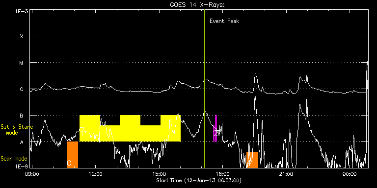EIS Observation timeline overlay to GOES-Xray curve Code 1" 2" 40" 266" EIS Observations list for this event: STUDY ACRONYM ID DATE OBSERVED DESCRIPTION NOAA# TARGET 0 Atlas_30 | 31568 | 2013/01/12 10:38:20 | Spectral Atlas of flaring region. | | Quiet Sun TIMELINE ID DATE OBSERVED FITS FILE XCEN (+W/-E) YCEN (+N/-S) DUR ----------------------------------------------------------------------------------------------------------------- 31568 | 2013/01/12 10:38:20.000 | eis_l0_20130112_103820.fits.gz | -395.09 | 191.98 | 31m39s 1 Flare266_Hunter02 | 31569 | 2013/01/12 11:14:34 | Flare Trigger Observations | 1654 | Flare TIMELINE ID DATE OBSERVED FITS FILE XCEN (+W/-E) YCEN (+N/-S) DUR ----------------------------------------------------------------------------------------------------------------- 31569 | 2013/01/12 11:14:34.000 | eis_l0_20130112_111434.fits.gz | -603.62 | 186.13 | 56m53s 31569 | 2013/01/12 12:11:55.000 | eis_l0_20130112_121155.fits.gz | -595.82 | 186.75 | 56m53s 31569 | 2013/01/12 13:09:15.000 | eis_l0_20130112_130915.fits.gz | -587.78 | 186.90 | 56m53s 31569 | 2013/01/12 14:06:36.000 | eis_l0_20130112_140636.fits.gz | -579.98 | 187.44 | 56m53s 31569 | 2013/01/12 15:03:56.000 | eis_l0_20130112_150356.fits.gz | -571.95 | 187.75 | 56m53s 2 regcal071 | 31526 | 2013/01/12 17:32:42 | Dark exposures, CCD bottom rows (100s | | Engineering TIMELINE ID DATE OBSERVED FITS FILE XCEN (+W/-E) YCEN (+N/-S) DUR ----------------------------------------------------------------------------------------------------------------- 31526 | 2013/01/12 17:32:42.000 | eis_l0_20130112_173242.fits.gz | -404.02 | -116.24 | 3m22s 3 regcal072 | 31527 | 2013/01/12 17:39:02 | Dark exposures, top CCD rows (100s exp | | Engineering TIMELINE ID DATE OBSERVED FITS FILE XCEN (+W/-E) YCEN (+N/-S) DUR ----------------------------------------------------------------------------------------------------------------- 31527 | 2013/01/12 17:39:02.000 | eis_l0_20130112_173902.fits.gz | -403.09 | 394.83 | 3m22s 4 Atlas_30 | 31570 | 2013/01/12 19:08:20 | Spectral Atlas of flaring region. | 1654 | Quiet Sun TIMELINE ID DATE OBSERVED FITS FILE XCEN (+W/-E) YCEN (+N/-S) DUR ----------------------------------------------------------------------------------------------------------------- 31570 | 2013/01/12 19:08:20.000 | eis_l0_20130112_190820.fits.gz | -323.79 | 195.30 | 31m39s : Check study information : Download file : View thumbnails For this event, also check for: