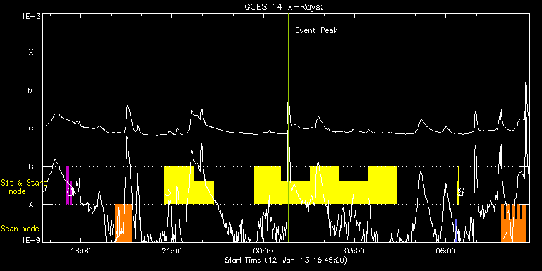 EIS Observation timeline overlay to GOES-Xray curve Code 1" 2" 40" 266" EIS Observations list for this event: STUDY ACRONYM ID DATE OBSERVED DESCRIPTION NOAA# TARGET 0 regcal071 | 31526 | 2013/01/12 17:32:42 | Dark exposures, CCD bottom rows (100s | | Engineering TIMELINE ID DATE OBSERVED FITS FILE XCEN (+W/-E) YCEN (+N/-S) DUR ----------------------------------------------------------------------------------------------------------------- 31526 | 2013/01/12 17:32:42.000 | eis_l0_20130112_173242.fits.gz | -404.02 | -116.24 | 3m22s 1 regcal072 | 31527 | 2013/01/12 17:39:02 | Dark exposures, top CCD rows (100s exp | | Engineering TIMELINE ID DATE OBSERVED FITS FILE XCEN (+W/-E) YCEN (+N/-S) DUR ----------------------------------------------------------------------------------------------------------------- 31527 | 2013/01/12 17:39:02.000 | eis_l0_20130112_173902.fits.gz | -403.09 | 394.83 | 3m22s 2 Atlas_30 | 31570 | 2013/01/12 19:08:20 | Spectral Atlas of flaring region. | 1654 | Quiet Sun TIMELINE ID DATE OBSERVED FITS FILE XCEN (+W/-E) YCEN (+N/-S) DUR ----------------------------------------------------------------------------------------------------------------- 31570 | 2013/01/12 19:08:20.000 | eis_l0_20130112_190820.fits.gz | -323.79 | 195.30 | 31m39s 3 Flare266_Hunter02 | 31571 | 2013/01/12 20:45:34 | Flare Trigger Observations | 1654 | Flare TIMELINE ID DATE OBSERVED FITS FILE XCEN (+W/-E) YCEN (+N/-S) DUR ----------------------------------------------------------------------------------------------------------------- 31571 | 2013/01/12 20:45:34.000 | eis_l0_20130112_204534.fits.gz | -523.52 | 189.91 | 56m53s 31571 | 2013/01/12 21:42:54.000 | eis_l0_20130112_214254.fits.gz | -515.33 | 190.30 | 39m12s 31571 | 2013/01/12 23:42:55.000 | eis_l0_20130112_234255.fits.gz | -497.95 | 191.00 | 51m32s 31571 | 2013/01/13 00:34:54.000 | eis_l0_20130113_003454.fits.gz | -490.38 | 191.07 | 56m54s 31571 | 2013/01/13 01:32:15.000 | eis_l0_20130113_013215.fits.gz | -482.11 | 191.62 | 56m53s 31571 | 2013/01/13 02:29:35.000 | eis_l0_20130113_022935.fits.gz | -473.69 | 191.85 | 56m53s 31571 | 2013/01/13 03:26:55.000 | eis_l0_20130113_032655.fits.gz | -465.19 | 192.08 | 56m54s 4 PRY_slot_contextLITE | 31528 | 2013/01/13 06:18:27 | Change of EIS pointing and alignment w | 1654 | Active Region TIMELINE ID DATE OBSERVED FITS FILE XCEN (+W/-E) YCEN (+N/-S) DUR ----------------------------------------------------------------------------------------------------------------- 31528 | 2013/01/13 06:18:27.000 | eis_l0_20130113_061827.fits.gz | -15.21 | -0.42 | 2m56s 5 Alignment_266 | 31529 | 2013/01/13 06:21:41 | Change of EIS pointing and alignment w | 1654 | Quiet Sun TIMELINE ID DATE OBSERVED FITS FILE XCEN (+W/-E) YCEN (+N/-S) DUR ----------------------------------------------------------------------------------------------------------------- 31529 | 2013/01/13 06:21:41.000 | eis_l0_20130113_062141.fits.gz | -132.49 | -0.35 | 1m22s 6 XRT_synop_AIA | 31530 | 2013/01/13 06:24:16 | Change of EIS pointing and alignment w | 1654 | Quiet Sun TIMELINE ID DATE OBSERVED FITS FILE XCEN (+W/-E) YCEN (+N/-S) DUR ----------------------------------------------------------------------------------------------------------------- 31530 | 2013/01/13 06:24:16.000 | eis_l0_20130113_062416.fits.gz | -132.57 | -0.42 | 10s 7 HH_Flare+AR_180x152 | 31544 | 2013/01/13 07:48:50 | Flare mode observations | 1654 | Flare TIMELINE ID DATE OBSERVED FITS FILE XCEN (+W/-E) YCEN (+N/-S) DUR ----------------------------------------------------------------------------------------------------------------- 31544 | 2013/01/13 07:48:50.000 | eis_l0_20130113_074850.fits.gz | -244.23 | 193.55 | 5m18s 31544 | 2013/01/13 07:54:11.000 | eis_l0_20130113_075411.fits.gz | -243.38 | 193.62 | 5m17s 31544 | 2013/01/13 07:59:31.000 | eis_l0_20130113_075931.fits.gz | -242.61 | 193.55 | 5m18s 31544 | 2013/01/13 08:04:52.000 | eis_l0_20130113_080452.fits.gz | -241.76 | 193.47 | 5m18s 31544 | 2013/01/13 08:10:13.000 | eis_l0_20130113_081013.fits.gz | -240.99 | 193.55 | 5m18s 31544 | 2013/01/13 08:15:34.000 | eis_l0_20130113_081534.fits.gz | -240.14 | 193.47 | 5m18s 31544 | 2013/01/13 08:20:55.000 | eis_l0_20130113_082055.fits.gz | -239.36 | 193.39 | 5m17s 31544 | 2013/01/13 08:26:15.000 | eis_l0_20130113_082615.fits.gz | -238.51 | 193.55 | 5m18s 31544 | 2013/01/13 08:31:36.000 | eis_l0_20130113_083136.fits.gz | -237.82 | 193.62 | 5m18s 31544 | 2013/01/13 08:36:57.000 | eis_l0_20130113_083657.fits.gz | -236.89 | 193.62 | 9s : Check study information : Download file : View thumbnails For this event, also check for: