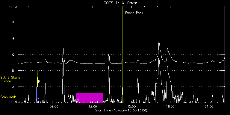 EIS Observation timeline overlay to GOES-Xray curve Code 1" 2" 40" 266" EIS Observations list for this event: STUDY ACRONYM ID DATE OBSERVED DESCRIPTION NOAA# TARGET 0 PRY_slot_contextLITE | 31610 | 2013/01/18 07:37:50 | Change of EIS pointing and alignment w | 1658 | Active Region TIMELINE ID DATE OBSERVED FITS FILE XCEN (+W/-E) YCEN (+N/-S) DUR ----------------------------------------------------------------------------------------------------------------- 31610 | 2013/01/18 07:37:50.000 | eis_l0_20130118_073750.fits.gz | -15.29 | -0.27 | 2m56s 1 Alignment_266 | 31611 | 2013/01/18 07:41:05 | Change of EIS pointing and alignment w | 1658 | Quiet Sun TIMELINE ID DATE OBSERVED FITS FILE XCEN (+W/-E) YCEN (+N/-S) DUR ----------------------------------------------------------------------------------------------------------------- 31611 | 2013/01/18 07:41:05.000 | eis_l0_20130118_074105.fits.gz | -132.57 | -0.27 | 1m22s 2 XRT_synop_AIA | 31612 | 2013/01/18 07:43:12 | Change of EIS pointing and alignment w | 1658 | Quiet Sun TIMELINE ID DATE OBSERVED FITS FILE XCEN (+W/-E) YCEN (+N/-S) DUR ----------------------------------------------------------------------------------------------------------------- 31612 | 2013/01/18 07:43:12.000 | eis_l0_20130118_074312.fits.gz | -132.57 | -0.35 | 10s 3 HPW021_VEL_240x512v1 | 31613 | 2013/01/18 10:42:03 | Diagnostic scan of active region. | 1654 | Active Region TIMELINE ID DATE OBSERVED FITS FILE XCEN (+W/-E) YCEN (+N/-S) DUR ----------------------------------------------------------------------------------------------------------------- 31613 | 2013/01/18 10:42:03.000 | eis_l0_20130118_104203.fits.gz | 797.73 | 128.04 | 2h3m48s : Check study information : Download file : View thumbnails For this event, also check for: