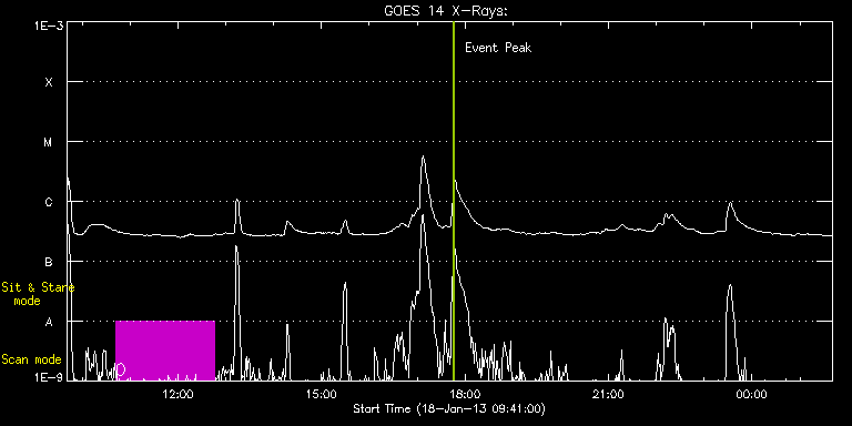 EIS Observation timeline overlay to GOES-Xray curve Code 1" 2" 40" 266" EIS Observations list for this event: STUDY ACRONYM ID DATE OBSERVED DESCRIPTION NOAA# TARGET 0 HPW021_VEL_240x512v1 | 31613 | 2013/01/18 10:42:03 | Diagnostic scan of active region. | 1654 | Active Region TIMELINE ID DATE OBSERVED FITS FILE XCEN (+W/-E) YCEN (+N/-S) DUR ----------------------------------------------------------------------------------------------------------------- 31613 | 2013/01/18 10:42:03.000 | eis_l0_20130118_104203.fits.gz | 797.73 | 128.04 | 2h3m48s : Check study information : Download file : View thumbnails For this event, also check for: