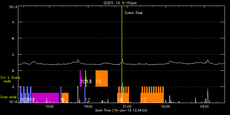 EIS Observation timeline overlay to GOES-Xray curve Code 1" 2" 40" 266" EIS Observations list for this event: STUDY ACRONYM ID DATE OBSERVED DESCRIPTION NOAA# TARGET 0 full_sun_slot_scan_1 | 31633 | 2013/01/19 12:42:14 | HOP130 12t/15 | | Quiet Sun TIMELINE ID DATE OBSERVED FITS FILE XCEN (+W/-E) YCEN (+N/-S) DUR ----------------------------------------------------------------------------------------------------------------- 31633 | 2013/01/19 12:42:14.000 | eis_l0_20130119_124214.fits.gz | 395.90 | -661.52 | 5m27s 1 full_sun_slot_scan_1 | 31634 | 2013/01/19 12:48:44 | HOP130 12b/15 | | Quiet Sun TIMELINE ID DATE OBSERVED FITS FILE XCEN (+W/-E) YCEN (+N/-S) DUR ----------------------------------------------------------------------------------------------------------------- 31634 | 2013/01/19 12:48:44.000 | eis_l0_20130119_124844.fits.gz | 395.82 | -1133.67 | 5m26s 2 full_sun_slot_scan_1 | 31635 | 2013/01/19 12:58:14 | HOP130 13t/15 | | Quiet Sun TIMELINE ID DATE OBSERVED FITS FILE XCEN (+W/-E) YCEN (+N/-S) DUR ----------------------------------------------------------------------------------------------------------------- 31635 | 2013/01/19 12:58:14.000 | eis_l0_20130119_125814.fits.gz | -15.29 | -755.53 | 5m27s 3 full_sun_slot_scan_1 | 31636 | 2013/01/19 13:04:43 | HOP130 13b/15 | | Quiet Sun TIMELINE ID DATE OBSERVED FITS FILE XCEN (+W/-E) YCEN (+N/-S) DUR ----------------------------------------------------------------------------------------------------------------- 31636 | 2013/01/19 13:04:43.000 | eis_l0_20130119_130443.fits.gz | -15.21 | -1227.53 | 5m27s 4 full_sun_slot_scan_1 | 31638 | 2013/01/19 13:14:14 | HOP130 14t/15 | | Quiet Sun TIMELINE ID DATE OBSERVED FITS FILE XCEN (+W/-E) YCEN (+N/-S) DUR ----------------------------------------------------------------------------------------------------------------- 31638 | 2013/01/19 13:14:14.000 | eis_l0_20130119_131414.fits.gz | -426.40 | -661.44 | 5m27s 5 full_sun_slot_scan_1 | 31639 | 2013/01/19 13:20:44 | HOP130 14b/15 | | Quiet Sun TIMELINE ID DATE OBSERVED FITS FILE XCEN (+W/-E) YCEN (+N/-S) DUR ----------------------------------------------------------------------------------------------------------------- 31639 | 2013/01/19 13:20:44.000 | eis_l0_20130119_132044.fits.gz | -426.00 | -1133.52 | 5m26s 6 full_sun_slot_scan_1 | 31640 | 2013/01/19 13:30:13 | HOP130 15b/15 | | Quiet Sun TIMELINE ID DATE OBSERVED FITS FILE XCEN (+W/-E) YCEN (+N/-S) DUR ----------------------------------------------------------------------------------------------------------------- 31640 | 2013/01/19 13:30:13.000 | eis_l0_20130119_133013.fits.gz | -830.25 | -757.17 | 5m27s 7 HPW021_VEL_240x512v1 | 31655 | 2013/01/19 13:39:20 | AR 11654 obs | 1654 | Active Region TIMELINE ID DATE OBSERVED FITS FILE XCEN (+W/-E) YCEN (+N/-S) DUR ----------------------------------------------------------------------------------------------------------------- 31655 | 2013/01/19 13:39:20.000 | eis_l0_20130119_133920.fits.gz | 913.68 | 159.19 | 2h3m48s 8 PRY_slot_context_v3 | 31656 | 2013/01/19 15:51:34 | EIS spectral atrals (AR) | 1654 | Active Region TIMELINE ID DATE OBSERVED FITS FILE XCEN (+W/-E) YCEN (+N/-S) DUR ----------------------------------------------------------------------------------------------------------------- 31656 | 2013/01/19 15:51:34.000 | eis_l0_20130119_155134.fits.gz | 905.89 | 159.57 | 2m56s 9 Atlas_30 | 31661 | 2013/01/19 15:56:34 | EIS spectral atlas (AR) | 1654 | Quiet Sun TIMELINE ID DATE OBSERVED FITS FILE XCEN (+W/-E) YCEN (+N/-S) DUR ----------------------------------------------------------------------------------------------------------------- 31661 | 2013/01/19 15:56:34.000 | eis_l0_20130119_155634.fits.gz | 920.86 | 159.57 | 31m39s 10 regcal071 | 31663 | 2013/01/19 17:21:12 | Dark exposures, CCD bottom rows (100s | | Engineering TIMELINE ID DATE OBSERVED FITS FILE XCEN (+W/-E) YCEN (+N/-S) DUR ----------------------------------------------------------------------------------------------------------------- 31663 | 2013/01/19 17:21:12.000 | eis_l0_20130119_172112.fits.gz | 940.09 | -198.43 | 3m22s 11 regcal072 | 31664 | 2013/01/19 17:25:42 | Dark exposures, top CCD rows (100s exp | | Engineering TIMELINE ID DATE OBSERVED FITS FILE XCEN (+W/-E) YCEN (+N/-S) DUR ----------------------------------------------------------------------------------------------------------------- 31664 | 2013/01/19 17:25:42.000 | eis_l0_20130119_172542.fits.gz | 940.32 | 312.57 | 3m22s 12 PRY_slot_contextLITE | 31641 | 2013/01/19 17:42:51 | EIS-AIA alignment | 1658 | Active Region TIMELINE ID DATE OBSERVED FITS FILE XCEN (+W/-E) YCEN (+N/-S) DUR ----------------------------------------------------------------------------------------------------------------- 31641 | 2013/01/19 17:42:51.000 | eis_l0_20130119_174251.fits.gz | -15.68 | -0.50 | 2m56s 13 Alignment_266 | 31642 | 2013/01/19 17:46:37 | EIS-AIA alignment | | Quiet Sun TIMELINE ID DATE OBSERVED FITS FILE XCEN (+W/-E) YCEN (+N/-S) DUR ----------------------------------------------------------------------------------------------------------------- 31642 | 2013/01/19 17:46:37.000 | eis_l0_20130119_174637.fits.gz | -132.57 | -0.58 | 1m22s 14 XRT_synop_AIA | 31643 | 2013/01/19 17:49:35 | | | Quiet Sun TIMELINE ID DATE OBSERVED FITS FILE XCEN (+W/-E) YCEN (+N/-S) DUR ----------------------------------------------------------------------------------------------------------------- 31643 | 2013/01/19 17:49:35.000 | eis_l0_20130119_174935.fits.gz | -132.49 | -0.58 | 10s 15 FLAREDOP_EIS | 31666 | 2013/01/19 18:33:50 | AR 11654 obs on W-limb | | Flare TIMELINE ID DATE OBSERVED FITS FILE XCEN (+W/-E) YCEN (+N/-S) DUR ----------------------------------------------------------------------------------------------------------------- 31666 | 2013/01/19 18:33:50.000 | eis_l0_20130119_183350.fits.gz | 928.43 | 159.56 | 55m53s 16 IUU_SCAN_STEPS_002 | 31667 | 2013/01/19 20:14:51 | AR 11654 obs on W-limb | 1654 | Active Region TI