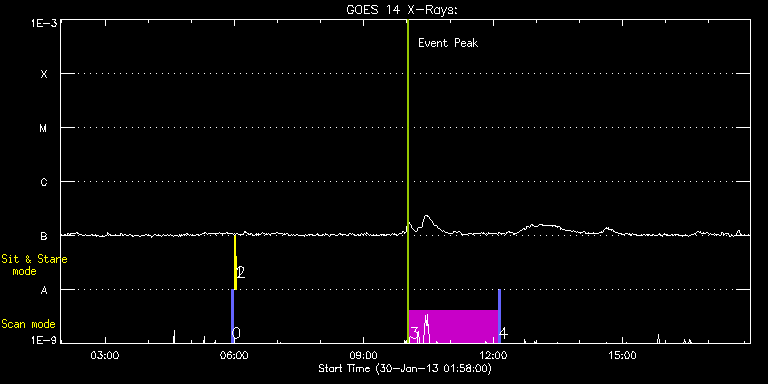 EIS Observation timeline overlay to GOES-Xray curve Code 1" 2" 40" 266" EIS Observations list for this event: STUDY ACRONYM ID DATE OBSERVED DESCRIPTION NOAA# TARGET 0 PRY_slot_contextLITE | 31776 | 2013/01/30 05:56:26 | Change of EIS pointing and alignment w | 1663 | Active Region TIMELINE ID DATE OBSERVED FITS FILE XCEN (+W/-E) YCEN (+N/-S) DUR ----------------------------------------------------------------------------------------------------------------- 31776 | 2013/01/30 05:56:26.000 | eis_l0_20130130_055626.fits.gz | -15.21 | -0.42 | 2m56s 1 Alignment_266 | 31777 | 2013/01/30 05:59:41 | Change of EIS pointing and alignment w | 1663 | Quiet Sun TIMELINE ID DATE OBSERVED FITS FILE XCEN (+W/-E) YCEN (+N/-S) DUR ----------------------------------------------------------------------------------------------------------------- 31777 | 2013/01/30 05:59:41.000 | eis_l0_20130130_055941.fits.gz | -132.57 | -0.42 | 1m22s 2 XRT_synop_AIA | 31778 | 2013/01/30 06:02:15 | Change of EIS pointing and alignment w | 1663 | Quiet Sun TIMELINE ID DATE OBSERVED FITS FILE XCEN (+W/-E) YCEN (+N/-S) DUR ----------------------------------------------------------------------------------------------------------------- 31778 | 2013/01/30 06:02:15.000 | eis_l0_20130130_060215.fits.gz | -132.49 | -0.42 | 10s 3 HPW021_VEL_240x512v1 | 31791 | 2013/01/30 10:03:33 | AR Studies | 1663 | Active Region TIMELINE ID DATE OBSERVED FITS FILE XCEN (+W/-E) YCEN (+N/-S) DUR ----------------------------------------------------------------------------------------------------------------- 31791 | 2013/01/30 10:03:33.000 | eis_l0_20130130_100333.fits.gz | -29.67 | -87.40 | 2h3m48s 4 PRY_slot_contextLITE | 31792 | 2013/01/30 12:07:46 | AR Studies | 1663 | Active Region TIMELINE ID DATE OBSERVED FITS FILE XCEN (+W/-E) YCEN (+N/-S) DUR ----------------------------------------------------------------------------------------------------------------- 31792 | 2013/01/30 12:07:46.000 | eis_l0_20130130_120746.fits.gz | -25.41 | -87.25 | 2m56s : Check study information : Download file : View thumbnails For this event, also check for: