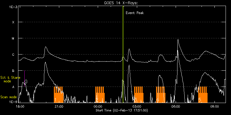 EIS Observation timeline overlay to GOES-Xray curve Code 1" 2" 40" 266" EIS Observations list for this event: STUDY ACRONYM ID DATE OBSERVED DESCRIPTION NOAA# TARGET 0 regcal077 | 31873 | 2013/02/02 18:20:14 | Flatfield, 2 exposures, led 80ms, full | | Engineering TIMELINE ID DATE OBSERVED FITS FILE XCEN (+W/-E) YCEN (+N/-S) DUR ----------------------------------------------------------------------------------------------------------------- 31873 | 2013/02/02 18:20:14.000 | eis_l0_20130202_182014.fits.gz | 14.51 | -50.27 | 4s 1 HH_Flare_162x152 | 31834 | 2013/02/02 20:37:05 | Returning previously AR11652 | 1667 | Flare TIMELINE ID DATE OBSERVED FITS FILE XCEN (+W/-E) YCEN (+N/-S) DUR ----------------------------------------------------------------------------------------------------------------- 31834 | 2013/02/02 20:37:05.000 | eis_l0_20130202_203705.fits.gz | -760.55 | 406.60 | 4m11s 31834 | 2013/02/02 20:41:19.000 | eis_l0_20130202_204119.fits.gz | -760.24 | 406.67 | 4m10s 31834 | 2013/02/02 20:45:32.000 | eis_l0_20130202_204532.fits.gz | -759.93 | 406.60 | 4m11s 31834 | 2013/02/02 20:49:46.000 | eis_l0_20130202_204946.fits.gz | -759.54 | 406.75 | 4m10s 31834 | 2013/02/02 20:53:59.000 | eis_l0_20130202_205359.fits.gz | -759.23 | 406.90 | 4m11s 31834 | 2013/02/02 20:58:13.000 | eis_l0_20130202_205813.fits.gz | -758.93 | 406.83 | 4m10s 31834 | 2013/02/02 21:02:26.000 | eis_l0_20130202_210226.fits.gz | -758.62 | 406.98 | 4m11s 31834 | 2013/02/02 21:06:40.000 | eis_l0_20130202_210640.fits.gz | -758.15 | 406.90 | 4m10s 31834 | 2013/02/02 21:10:53.000 | eis_l0_20130202_211053.fits.gz | -757.84 | 407.06 | 4m10s 31834 | 2013/02/02 21:15:06.000 | eis_l0_20130202_211506.fits.gz | -757.54 | 407.06 | 4m11s 2 HH_Flare_162x152 | 31836 | 2013/02/02 23:48:39 | Returning previously AR11652 | 1667 | Flare TIMELINE ID DATE OBSERVED FITS FILE XCEN (+W/-E) YCEN (+N/-S) DUR ----------------------------------------------------------------------------------------------------------------- 31836 | 2013/02/02 23:48:39.000 | eis_l0_20130202_234839.fits.gz | -745.18 | 409.22 | 4m11s 31836 | 2013/02/02 23:52:53.000 | eis_l0_20130202_235253.fits.gz | -744.87 | 409.22 | 4m10s 31836 | 2013/02/02 23:57:06.000 | eis_l0_20130202_235706.fits.gz | -744.56 | 409.30 | 4m11s 31836 | 2013/02/03 00:01:20.000 | eis_l0_20130203_000120.fits.gz | -744.09 | 409.30 | 4m10s 31836 | 2013/02/03 00:05:33.000 | eis_l0_20130203_000533.fits.gz | -743.79 | 409.30 | 4m10s 31836 | 2013/02/03 00:09:46.000 | eis_l0_20130203_000946.fits.gz | -743.48 | 409.45 | 4m11s 31836 | 2013/02/03 00:13:59.000 | eis_l0_20130203_001359.fits.gz | -743.17 | 409.45 | 4m11s 31836 | 2013/02/03 00:18:13.000 | eis_l0_20130203_001813.fits.gz | -742.70 | 409.61 | 4m11s 31836 | 2013/02/03 00:22:27.000 | eis_l0_20130203_002227.fits.gz | -742.40 | 409.53 | 4m11s 31836 | 2013/02/03 00:26:41.000 | eis_l0_20130203_002641.fits.gz | -742.01 | 409.68 | 4m10s 3 HH_Flare_162x152 | 31838 | 2013/02/03 02:47:47 | Returning previously AR11652 | 1667 | Flare TIMELINE ID DATE OBSERVED FITS FILE XCEN (+W/-E) YCEN (+N/-S) DUR ----------------------------------------------------------------------------------------------------------------- 31838 | 2013/02/03 02:47:47.000 | eis_l0_20130203_024747.fits.gz | -730.19 | 411.46 | 4m11s 31838 | 2013/02/03 02:52:01.000 | eis_l0_20130203_025201.fits.gz | -729.80 | 411.46 | 4m11s 31838 | 2013/02/03 02:56:14.000 | eis_l0_20130203_025614.fits.gz | -729.42 | 411.77 | 4m11s 31838 | 2013/02/03 03:00:28.000 | eis_l0_20130203_030028.fits.gz | -729.03 | 411.77 | 4m10s 31838 | 2013/02/03 03:04:41.000 | eis_l0_20130203_030441.fits.gz | -728.72 | 411.69 | 4m11s 31838 | 2013/02/03 03:08:55.000 | eis_l0_20130203_030855.fits.gz | -728.34 | 411.77 | 4m10s 31838 | 2013/02/03 03:13:08.000 | eis_l0_20130203_031308.fits.gz | -728.03 | 411.85 | 4m10s 31838 | 2013/02/03 03:17:21.000 | eis_l0_20130203_031721.fits.gz | -727.64 | 411.85 | 4m11s 31838 | 2013/02/03 03:21:35.000 | eis_l0_20130203_032135.fits.gz | -727.33 | 412.08 | 4m10s 31838 | 2013/02/03 03:25:48.000 | eis_l0_20130203_032548.fits.gz | -726.95 | 411.92 | 4m11s 4 HH_Flare_162x152 | 31860 | 2013/02/03 04:29:47 | Returning previously AR11652 | 1667 | Flare TIMELINE ID DATE OBSERVED FITS FILE XCEN (+W/-E) YCEN (+N/-S) DUR ----------------------------------------------------------------------------------------------------------------- 31860 | 2013/02/03 04:29:47.000 | eis_l0_20130203_042947.fits.gz | -721.38 | 412.85 | 4m11s 31860 | 2013/02/03 04:34:01.000 | eis_l0_20130203_043401.fits.gz | -721.08 | 412.93 | 4m11s 31860 | 2013/02/03 04:38:14.000 | eis_l0_20130203_043814.fits.gz | -720.77 | 413.08 | 4m11s 31860 | 2013/02/03 04:42:28.000 | eis_l0_20130203_044228.fits.gz | -720.30 | 412.93 | 4m10s 31860 | 2013/02/03 04:46:41.000 | eis_l0_20130203_044641.fits.gz | -719.84 | 413.01 | 4m11s 31860 | 2013/02/03 04:50:55.000 | eis_l0_20130203_045055.fits.gz | -719.53 | 413.08 | 4m11s 31860 | 2013/02/03 04:55:09.000 | eis_l0_20130203_045509.fits.gz | -719.22 | 413.16 | 4m11s 31860 | 2013/02/03 04:59:23.000 | eis_l0_20130203_045923.fits.gz | -718.84 | 413.16 | 4m10s 31860 | 2013/02/03 05:03:36.000 | eis_l0_20130203_050336.fits.gz | -718.37 | 413.24 | 4m11s 31860 | 2013/02/03 05:07:49.000 | eis_l0_20130203_050749.fits.gz | -717.98 | 413.24 | 4m11s 5 HH_Flare_162x152 | 31849 | 2013/02/03 07:43:51 | Returning previously AR11652 | 1667 | Flare TIMELINE ID DATE OBSERVED FITS FILE XCEN (+W/-E) YCEN (+N/-S) DUR ----------------------------------------------------------------------------------------------------------------- 31849 | 2013/02/03 07:43:51.000 | eis_l0_20130203_074351.fits.gz | -704.16 | 415.17 | 4m11s 31849 | 2013/02/03 07:48:05.000 | eis_l0_20130203_074805.fits.gz | -703.77 | 415.48 | 4m10s 31849 | 2013/02/03 07:52:18.000 | eis_l0_20130203_075218.fits.gz | -703.31 | 415.40 | 4m11s 31849 | 2013/02/03 07:56:32.000 | eis_l0_20130203_075632.fits.gz | -703.08 | 415.48 | 4m10s 31849 | 2013/02/03 08:00:45.000 | eis_l0_2013