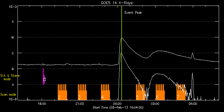 EIS Observation timeline overlay to GOES-Xray curve Code 1" 2" 40" 266" EIS Observations list for this event: STUDY ACRONYM ID DATE OBSERVED DESCRIPTION NOAA# TARGET 0 regcal071 | 31904 | 2013/02/05 18:04:42 | Dark exposures, CCD bottom rows (100s | | Engineering TIMELINE ID DATE OBSERVED FITS FILE XCEN (+W/-E) YCEN (+N/-S) DUR ----------------------------------------------------------------------------------------------------------------- 31904 | 2013/02/05 18:04:42.000 | eis_l0_20130205_180442.fits.gz | -312.71 | -305.81 | 3m22s 1 regcal072 | 31905 | 2013/02/05 18:09:07 | Dark exposures, top CCD rows (100s exp | | Engineering TIMELINE ID DATE OBSERVED FITS FILE XCEN (+W/-E) YCEN (+N/-S) DUR ----------------------------------------------------------------------------------------------------------------- 31905 | 2013/02/05 18:09:07.000 | eis_l0_20130205_180907.fits.gz | 14.59 | 205.50 | 3m22s 2 HH_Flare_162x152 | 31912 | 2013/02/05 19:16:26 | former AR11564 | 1669 | Flare TIMELINE ID DATE OBSERVED FITS FILE XCEN (+W/-E) YCEN (+N/-S) DUR ----------------------------------------------------------------------------------------------------------------- 31912 | 2013/02/05 19:16:26.000 | eis_l0_20130205_191626.fits.gz | -829.07 | 161.72 | 4m10s 31912 | 2013/02/05 19:20:39.000 | eis_l0_20130205_192039.fits.gz | -828.68 | 161.64 | 4m11s 31912 | 2013/02/05 19:24:52.000 | eis_l0_20130205_192452.fits.gz | -828.37 | 161.64 | 4m11s 31912 | 2013/02/05 19:29:06.000 | eis_l0_20130205_192906.fits.gz | -828.06 | 161.87 | 4m10s 31912 | 2013/02/05 19:33:19.000 | eis_l0_20130205_193319.fits.gz | -827.68 | 161.80 | 4m11s 31912 | 2013/02/05 19:37:33.000 | eis_l0_20130205_193733.fits.gz | -827.37 | 162.03 | 4m10s 31912 | 2013/02/05 19:41:46.000 | eis_l0_20130205_194146.fits.gz | -827.06 | 161.95 | 4m11s 31912 | 2013/02/05 19:45:59.000 | eis_l0_20130205_194559.fits.gz | -826.67 | 161.95 | 4m11s 31912 | 2013/02/05 19:50:13.000 | eis_l0_20130205_195013.fits.gz | -826.36 | 162.03 | 4m10s 31912 | 2013/02/05 19:54:26.000 | eis_l0_20130205_195426.fits.gz | -825.98 | 162.26 | 4m11s 3 HH_Flare_162x152 | 31926 | 2013/02/05 20:51:24 | former AR11564 | 1669 | Flare TIMELINE ID DATE OBSERVED FITS FILE XCEN (+W/-E) YCEN (+N/-S) DUR ----------------------------------------------------------------------------------------------------------------- 31926 | 2013/02/05 20:51:24.000 | eis_l0_20130205_205124.fits.gz | -821.34 | 163.03 | 4m10s 31926 | 2013/02/05 20:55:37.000 | eis_l0_20130205_205537.fits.gz | -820.96 | 163.11 | 4m10s 31926 | 2013/02/05 20:59:50.000 | eis_l0_20130205_205950.fits.gz | -820.65 | 163.11 | 4m11s 31926 | 2013/02/05 21:04:04.000 | eis_l0_20130205_210404.fits.gz | -820.26 | 163.19 | 4m10s 31926 | 2013/02/05 21:08:17.000 | eis_l0_20130205_210817.fits.gz | -819.95 | 163.26 | 4m11s 31926 | 2013/02/05 21:12:30.000 | eis_l0_20130205_211230.fits.gz | -819.64 | 163.34 | 4m11s 31926 | 2013/02/05 21:16:44.000 | eis_l0_20130205_211644.fits.gz | -819.18 | 163.50 | 4m10s 31926 | 2013/02/05 21:20:57.000 | eis_l0_20130205_212057.fits.gz | -818.87 | 163.57 | 4m11s 31926 | 2013/02/05 21:25:11.000 | eis_l0_20130205_212511.fits.gz | -818.41 | 163.42 | 4m10s 31926 | 2013/02/05 21:29:24.000 | eis_l0_20130205_212924.fits.gz | -818.17 | 163.50 | 4m11s 4 HH_Flare_162x152 | 31913 | 2013/02/05 22:41:54 | former AR11654 | 1669 | Flare TIMELINE ID DATE OBSERVED FITS FILE XCEN (+W/-E) YCEN (+N/-S) DUR ----------------------------------------------------------------------------------------------------------------- 31913 | 2013/02/05 22:41:54.000 | eis_l0_20130205_224154.fits.gz | -811.99 | 164.73 | 4m10s 31913 | 2013/02/05 22:46:07.000 | eis_l0_20130205_224607.fits.gz | -811.69 | 164.65 | 4m10s 31913 | 2013/02/05 22:50:20.000 | eis_l0_20130205_225020.fits.gz | -811.30 | 164.73 | 4m11s 31913 | 2013/02/05 22:54:34.000 | eis_l0_20130205_225434.fits.gz | -810.91 | 164.96 | 4m10s 31913 | 2013/02/05 22:58:47.000 | eis_l0_20130205_225847.fits.gz | -810.53 | 164.96 | 4m11s 31913 | 2013/02/05 23:03:01.000 | eis_l0_20130205_230301.fits.gz | -810.22 | 165.04 | 4m10s 31913 | 2013/02/05 23:07:14.000 | eis_l0_20130205_230714.fits.gz | -809.83 | 164.96 | 4m11s 31913 | 2013/02/05 23:11:27.000 | eis_l0_20130205_231127.fits.gz | -809.45 | 165.12 | 4m11s 31913 | 2013/02/05 23:15:41.000 | eis_l0_20130205_231541.fits.gz | -809.14 | 165.27 | 4m10s 31913 | 2013/02/05 23:19:54.000 | eis_l0_20130205_231954.fits.gz | -808.75 | 165.12 | 4m11s 5 HH_Flare_162x152 | 31919 | 2013/02/06 01:29:18 | former AR11654 | 1669 | Flare TIMELINE ID DATE OBSERVED FITS FILE XCEN (+W/-E) YCEN (+N/-S) DUR ----------------------------------------------------------------------------------------------------------------- 31919 | 2013/02/06 01:29:18.000 | eis_l0_20130206_012918.fits.gz | -797.40 | 167.36 | 4m10s 31919 | 2013/02/06 01:33:31.000 | eis_l0_20130206_013331.fits.gz | -797.01 | 167.36 | 4m11s 31919 | 2013/02/06 01:37:44.000 | eis_l0_20130206_013744.fits.gz | -796.62 | 167.36 | 4m11s 31919 | 2013/02/06 01:41:58.000 | eis_l0_20130206_014158.fits.gz | -796.31 | 167.44 | 4m10s 31919 | 2013/02/06 01:46:11.000 | eis_l0_20130206_014611.fits.gz | -795.93 | 167.51 | 4m11s 31919 | 2013/02/06 01:50:25.000 | eis_l0_20130206_015025.fits.gz | -795.54 | 167.36 | 4m10s 31919 | 2013/02/06 01:54:38.000 | eis_l0_20130206_015438.fits.gz | -795.23 | 167.59 | 4m11s 31919 | 2013/02/06 01:58:52.000 | eis_l0_20130206_015852.fits.gz | -794.69 | 167.51 | 4m10s 31919 | 2013/02/06 02:03:05.000 | eis_l0_20130206_020305.fits.gz | -794.46 | 167.59 | 4m11s 31919 | 2013/02/06 02:07:18.000 | eis_l0_20130206_020718.fits.gz | -794.00 | 167.82 | 4m11s 6 HH_Flare_162x152 | 31927 | 2013/02/06 03:03:01 | former AR11564 | 1669 | Flare TIMELINE ID DATE OBSERVED FITS FILE XCEN (+W/-E) YCEN (+N/-S) DUR ----------------------------------------------------------------------------------------------------------------- 31927 | 2013/02/06 03:03:01.000 | eis_l0_20130206_030301.fits.gz | -788.98 | 168.60 | 4m11s 31927 | 2013/02/0
