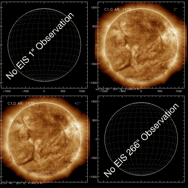 EIS Observation timeline overlay to GOES-Xray curve Code 1" 2" 40" 266" EIS Observations list for this event: STUDY ACRONYM ID DATE OBSERVED DESCRIPTION NOAA# TARGET 0 PRY_slot_context_v3 | 32022 | 2013/02/14 09:46:34 | Spectral atlas at east limb (quiet) | | Active Region TIMELINE ID DATE OBSERVED FITS FILE XCEN (+W/-E) YCEN (+N/-S) DUR ----------------------------------------------------------------------------------------------------------------- 32022 | 2013/02/14 09:46:34.000 | eis_l0_20130214_094634.fits.gz | -9884.69 | -9963.20 | 2m57s 1 Atlas_60 | 32023 | 2013/02/14 09:49:56 | EIS spectral atlas at east limb (quiet | | Quiet Sun TIMELINE ID DATE OBSERVED FITS FILE XCEN (+W/-E) YCEN (+N/-S) DUR ----------------------------------------------------------------------------------------------------------------- 32023 | 2013/02/14 09:49:56.000 | eis_l0_20130214_094956.fits.gz | -9924.86 | -9963.20 | 1h1m40s : Check study information : Download file : View thumbnails For this event, also check for: