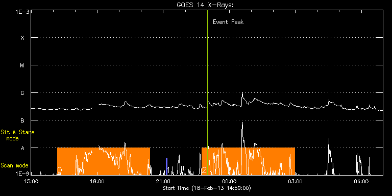 EIS Observation timeline overlay to GOES-Xray curve Code 1" 2" 40" 266" EIS Observations list for this event: STUDY ACRONYM ID DATE OBSERVED DESCRIPTION NOAA# TARGET 0 YKK_EqCHab_01W | 32058 | 2013/02/16 16:10:41 | HOP217 Formation of photospheric netwo | | Coronal Hole TIMELINE ID DATE OBSERVED FITS FILE XCEN (+W/-E) YCEN (+N/-S) DUR ----------------------------------------------------------------------------------------------------------------- 32058 | 2013/02/16 16:10:41.000 | eis_l0_20130216_161041.fits.gz | 94.23 | 9.54 | 4h12m46s 1 PRY_slot_context_v3 | 32059 | 2013/02/16 21:07:07 | HOP217 Formation of photospheric netwo | 1672 | Active Region TIMELINE ID DATE OBSERVED FITS FILE XCEN (+W/-E) YCEN (+N/-S) DUR ----------------------------------------------------------------------------------------------------------------- 32059 | 2013/02/16 21:07:07.000 | eis_l0_20130216_210707.fits.gz | 125.53 | 8.85 | 2m56s 2 YKK_EqCHab_01W | 32060 | 2013/02/16 22:45:05 | HOP217 Formation of photospheric netwo | | Coronal Hole TIMELINE ID DATE OBSERVED FITS FILE XCEN (+W/-E) YCEN (+N/-S) DUR ----------------------------------------------------------------------------------------------------------------- 32060 | 2013/02/16 22:45:05.000 | eis_l0_20130216_224505.fits.gz | 155.49 | 8.62 | 4h12m48s : Check study information : Download file : View thumbnails For this event, also check for: