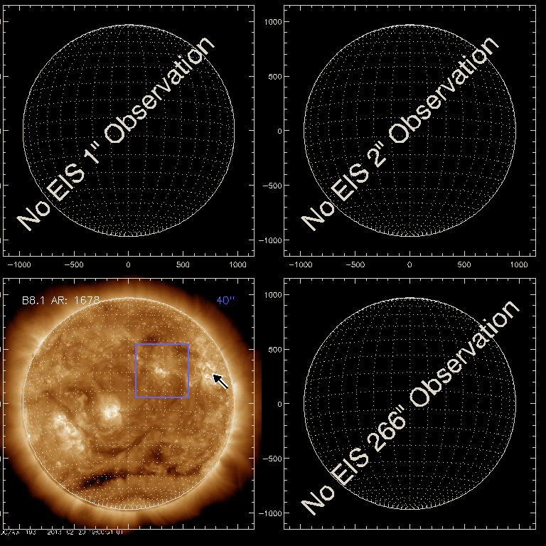 EIS Observation timeline overlay to GOES-Xray curve Code 1" 2" 40" 266" EIS Observations list for this event: STUDY ACRONYM ID DATE OBSERVED DESCRIPTION NOAA# TARGET 0 PRY_slot_context_v3 | 32147 | 2013/02/20 23:32:47 | Flare watch AR 11675 | 1675 | Active Region TIMELINE ID DATE OBSERVED FITS FILE XCEN (+W/-E) YCEN (+N/-S) DUR ----------------------------------------------------------------------------------------------------------------- 32147 | 2013/02/20 23:32:47.000 | eis_l0_20130220_233247.fits.gz | 310.62 | 297.52 | 2m56s : Check study information : Download file : View thumbnails For this event, also check for: