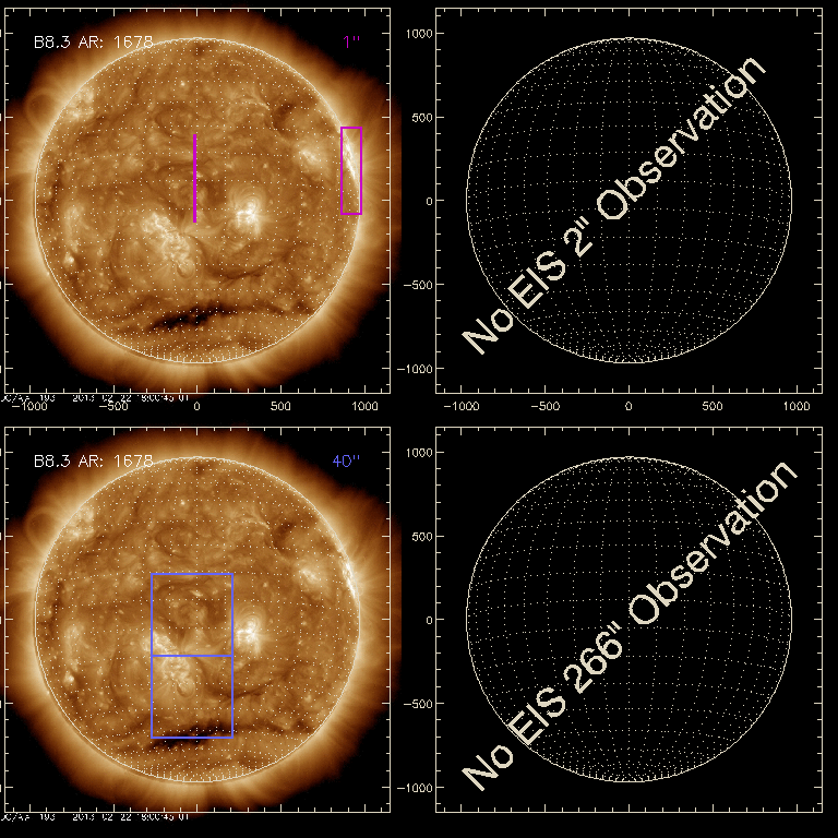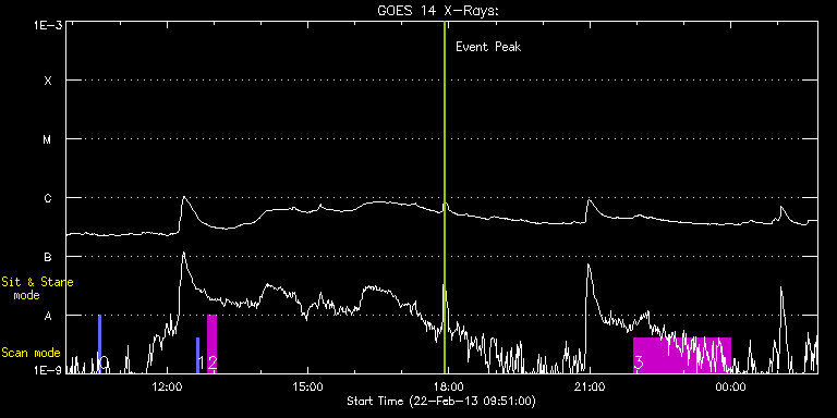 EIS Observation timeline overlay to GOES-Xray curve Code 1" 2" 40" 266" EIS Observations list for this event: STUDY ACRONYM ID DATE OBSERVED DESCRIPTION NOAA# TARGET 0 PRY_slot_contextLITE | 32166 | 2013/02/22 10:32:53 | HOP 79 Synoptic Irradiance Scans | | Active Region TIMELINE ID DATE OBSERVED FITS FILE XCEN (+W/-E) YCEN (+N/-S) DUR ----------------------------------------------------------------------------------------------------------------- 32166 | 2013/02/22 10:32:53.000 | eis_l0_20130222_103253.fits.gz | -30.28 | -462.36 | 2m56s 1 PRY_slot_contextLITE | 32176 | 2013/02/22 12:37:53 | HOP 79 Synoptic Irradiance Scans | 1673 | Active Region TIMELINE ID DATE OBSERVED FITS FILE XCEN (+W/-E) YCEN (+N/-S) DUR ----------------------------------------------------------------------------------------------------------------- 32176 | 2013/02/22 12:37:53.000 | eis_l0_20130222_123753.fits.gz | -30.35 | 27.62 | 2m56s 2 SK_DEEP_5x512_SLIT1 | 32177 | 2013/02/22 12:52:19 | HOP 79 Synoptic Irradiance Scans | | Quiet Sun TIMELINE ID DATE OBSERVED FITS FILE XCEN (+W/-E) YCEN (+N/-S) DUR ----------------------------------------------------------------------------------------------------------------- 32177 | 2013/02/22 12:52:19.000 | eis_l0_20130222_125219.fits.gz | -15.05 | 127.73 | 10m8s 3 HPW021_VEL_240x512v1 | 32208 | 2013/02/22 21:55:40 | Active region studies AR 11678 | 1671 | Active Region TIMELINE ID DATE OBSERVED FITS FILE XCEN (+W/-E) YCEN (+N/-S) DUR ----------------------------------------------------------------------------------------------------------------- 32208 | 2013/02/22 21:55:40.000 | eis_l0_20130222_215540.fits.gz | 919.86 | 174.77 | 2h3m47s : Check study information : Download file : View thumbnails For this event, also check for: