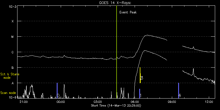 EIS Observation timeline overlay to GOES-Xray curve Code 1" 2" 40" 266" EIS Observations list for this event: STUDY ACRONYM ID DATE OBSERVED DESCRIPTION NOAA# TARGET 0 PRY_slot_contextLITE | 32484 | 2013/03/14 23:40:36 | Obs of returning AR complex (AR11692) | 1692 | Active Region TIMELINE ID DATE OBSERVED FITS FILE XCEN (+W/-E) YCEN (+N/-S) DUR ----------------------------------------------------------------------------------------------------------------- 32484 | 2013/03/14 23:40:36.000 | eis_l0_20130314_234036.fits.gz | -216.60 | 253.41 | 2m56s 1 PRY_slot_contextLITE | 32467 | 2013/03/15 06:21:40 | EIS/AIA alignment synoptic obs | 1696 | Active Region TIMELINE ID DATE OBSERVED FITS FILE XCEN (+W/-E) YCEN (+N/-S) DUR ----------------------------------------------------------------------------------------------------------------- 32467 | 2013/03/15 06:21:40.000 | eis_l0_20130315_062140.fits.gz | -15.14 | -0.42 | 2m56s 2 Alignment_266 | 32468 | 2013/03/15 06:24:55 | EIS/AIA synoptic obs | | Quiet Sun TIMELINE ID DATE OBSERVED FITS FILE XCEN (+W/-E) YCEN (+N/-S) DUR ----------------------------------------------------------------------------------------------------------------- 32468 | 2013/03/15 06:24:55.000 | eis_l0_20130315_062455.fits.gz | -132.49 | -0.50 | 1m22s 3 XRT_synop_AIA | 32469 | 2013/03/15 06:27:02 | EIS/AIA synoptic obs | | Quiet Sun TIMELINE ID DATE OBSERVED FITS FILE XCEN (+W/-E) YCEN (+N/-S) DUR ----------------------------------------------------------------------------------------------------------------- 32469 | 2013/03/15 06:27:02.000 | eis_l0_20130315_062702.fits.gz | -132.49 | -0.50 | 10s 4 PRY_slot_contextLITE | 32485 | 2013/03/15 09:30:55 | Obs of returning AR complex (AR11692) | 1692 | Active Region TIMELINE ID DATE OBSERVED FITS FILE XCEN (+W/-E) YCEN (+N/-S) DUR ----------------------------------------------------------------------------------------------------------------- 32485 | 2013/03/15 09:30:55.000 | eis_l0_20130315_093055.fits.gz | -126.60 | 255.11 | 2m56s : Check study information : Download file : View thumbnails For this event, also check for: