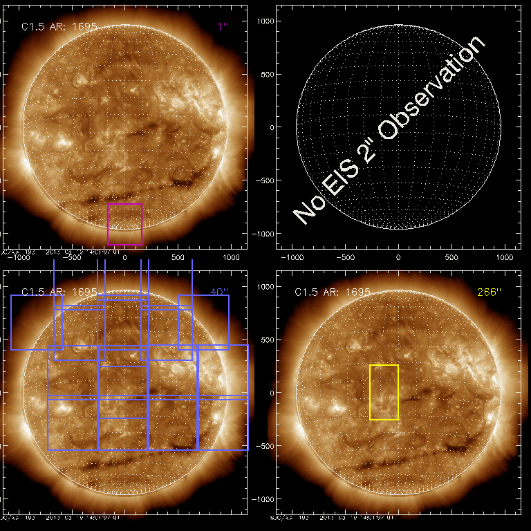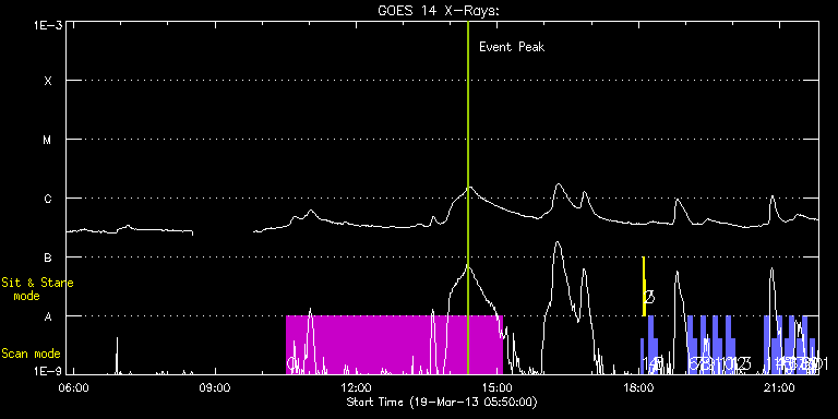 EIS Observation timeline overlay to GOES-Xray curve Code 1" 2" 40" 266" EIS Observations list for this event: STUDY ACRONYM ID DATE OBSERVED DESCRIPTION NOAA# TARGET 0 SK_CH_DIAG_320x384 | 32579 | 2013/03/19 10:31:34 | HOP 206 | | Coronal Hole TIMELINE ID DATE OBSERVED FITS FILE XCEN (+W/-E) YCEN (+N/-S) DUR ----------------------------------------------------------------------------------------------------------------- 32579 | 2013/03/19 10:31:34.000 | eis_l0_20130319_103134.fits.gz | 0.12 | -920.67 | 4h35m37s 1 PRY_slot_contextLITE | 32541 | 2013/03/19 18:02:34 | EIS/AIA alignment synoptic obs | | Active Region TIMELINE ID DATE OBSERVED FITS FILE XCEN (+W/-E) YCEN (+N/-S) DUR ----------------------------------------------------------------------------------------------------------------- 32541 | 2013/03/19 18:02:34.000 | eis_l0_20130319_180234.fits.gz | -15.06 | -0.27 | 2m45s 2 Alignment_266 | 32542 | 2013/03/19 18:05:58 | EIS/AIA synoptic obs | | Quiet Sun TIMELINE ID DATE OBSERVED FITS FILE XCEN (+W/-E) YCEN (+N/-S) DUR ----------------------------------------------------------------------------------------------------------------- 32542 | 2013/03/19 18:05:58.000 | eis_l0_20130319_180558.fits.gz | -132.64 | -0.42 | 1m22s 3 XRT_synop_AIA | 32543 | 2013/03/19 18:08:20 | EIS/AIA synoptic obs | | Quiet Sun TIMELINE ID DATE OBSERVED FITS FILE XCEN (+W/-E) YCEN (+N/-S) DUR ----------------------------------------------------------------------------------------------------------------- 32543 | 2013/03/19 18:08:20.000 | eis_l0_20130319_180820.fits.gz | -132.57 | -0.50 | 10s 4 full_sun_slot_scan_2 | 32553 | 2013/03/19 18:12:27 | HOP 130 | 1696 | Quiet Sun TIMELINE ID DATE OBSERVED FITS FILE XCEN (+W/-E) YCEN (+N/-S) DUR ----------------------------------------------------------------------------------------------------------------- 32553 | 2013/03/19 18:12:27.000 | eis_l0_20130319_181227.fits.gz | 920.80 | 185.58 | 5m27s 5 full_sun_slot_scan_2 | 32554 | 2013/03/19 18:18:49 | HOP 130 | 1698 | Quiet Sun TIMELINE ID DATE OBSERVED FITS FILE XCEN (+W/-E) YCEN (+N/-S) DUR ----------------------------------------------------------------------------------------------------------------- 32554 | 2013/03/19 18:18:49.000 | eis_l0_20130319_181849.fits.gz | 920.72 | -286.50 | 5m26s 6 full_sun_slot_scan_2 | 32555 | 2013/03/19 19:03:41 | HOP 130 | 1692 | Quiet Sun TIMELINE ID DATE OBSERVED FITS FILE XCEN (+W/-E) YCEN (+N/-S) DUR ----------------------------------------------------------------------------------------------------------------- 32555 | 2013/03/19 19:03:41.000 | eis_l0_20130319_190341.fits.gz | 452.68 | 185.58 | 5m5s 7 full_sun_slot_scan_2 | 32556 | 2013/03/19 19:09:21 | HOP 130 | | Quiet Sun TIMELINE ID DATE OBSERVED FITS FILE XCEN (+W/-E) YCEN (+N/-S) DUR ----------------------------------------------------------------------------------------------------------------- 32556 | 2013/03/19 19:09:21.000 | eis_l0_20130319_190921.fits.gz | 452.75 | -286.42 | 5m27s 8 full_sun_slot_scan_2 | 32557 | 2013/03/19 19:19:13 | HOP 130 | | Quiet Sun TIMELINE ID DATE OBSERVED FITS FILE XCEN (+W/-E) YCEN (+N/-S) DUR ----------------------------------------------------------------------------------------------------------------- 32557 | 2013/03/19 19:19:13.000 | eis_l0_20130319_191913.fits.gz | -15.29 | 185.42 | 5m27s 9 full_sun_slot_scan_2 | 32558 | 2013/03/19 19:25:21 | HOP 130 | | Quiet Sun TIMELINE ID DATE OBSERVED FITS FILE XCEN (+W/-E) YCEN (+N/-S) DUR ----------------------------------------------------------------------------------------------------------------- 32558 | 2013/03/19 19:25:21.000 | eis_l0_20130319_192521.fits.gz | -15.29 | -286.27 | 5m27s 10 full_sun_slot_scan_2 | 32559 | 2013/03/19 19:35:13 | HOP 130 | | Quiet Sun TIMELINE ID DATE OBSERVED FITS FILE XCEN (+W/-E) YCEN (+N/-S) DUR ----------------------------------------------------------------------------------------------------------------- 32559 | 2013/03/19 19:35:13.000 | eis_l0_20130319_193513.fits.gz | -483.26 | 185.50 | 5m27s 11 full_sun_slot_scan_2 | 32560 | 2013/03/19 19:41:21 | HOP 130 | 1700 | Quiet Sun TIMELINE ID DATE OBSERVED FITS FILE XCEN (+W/-E) YCEN (+N/-S) DUR ----------------------------------------------------------------------------------------------------------------- 32560 | 2013/03/19 19:41:21.000 | eis_l0_20130319_194121.fits.gz | -483.26 | -286.35 | 5m27s 12 full_sun_slot_scan_2 | 32561 | 2013/03/19 19:51:13 | HOP 130 | | Quiet Sun TIMELINE ID DATE OBSERVED FITS FILE XCEN (+W/-E) YCEN (+N/-S) DUR ----------------------------------------------------------------------------------------------------------------- 32561 | 2013/03/19 19:51:13.000 | eis_l0_20130319_195113.fits.gz | -9884.69 | -9777.20 | 5m27s 13 full_sun_slot_scan_2 | 32562 | 2013/03/19 19:57:21 | HOP 130 | | Quiet Sun TIMELINE ID DATE OBSERVED FITS FILE XCEN (+W/-E) YCEN (+N/-S) DUR ----------------------------------------------------------------------------------------------------------------- 32562 | 2013/03/19 19:57:21.000 | eis_l0_20130319_195721.fits.gz | -9884.69 | -10249.20 | 5m27s 14 full_sun_slot_scan_2 | 32563 | 2013/03/19 20:40:43 | HOP 130 | | Quiet Sun TIMELINE ID DATE OBSERVED FITS FILE XCEN (+W/-E) YCEN (+N/-S) DUR ----------------------------------------------------------------------------------------------------------------- 32563 | 2013/03/19 20:40:43.000 | eis_l0_20130319_204043.fits.gz | 742.90 | 655.63 | 5m28s 15 full_sun_slot_scan_2 | 32564 | 2013/03/19 20:50:43 | HOP 130 | | Quiet Sun TIMELINE ID DATE OBSERVED FITS FILE XCEN (+W/-E) YCEN (+N/-S) DUR ----------------------------------------------------------------------------------------------------------------- 32564 | 2013/03/19 20:50:43.000 | eis_l0_20130319_205043.fits.gz | 395.90 | 1032.75 | 5m28s 16 full_sun_slot_scan_2 | 32565 | 2013/03/19 20:56:51 | HOP 130 | | Quiet Sun TIMELINE ID DATE OBSERVED FITS FILE XCEN (+W/-E) YCEN (+N/-S) DUR ------------------------------------------