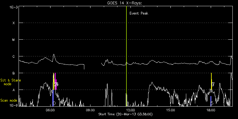 EIS Observation timeline overlay to GOES-Xray curve Code 1" 2" 40" 266" EIS Observations list for this event: STUDY ACRONYM ID DATE OBSERVED DESCRIPTION NOAA# TARGET 0 PRY_slot_contextLITE | 32544 | 2013/03/20 06:10:20 | EIS/AIA alignment synoptic obs | 1700 | Active Region TIMELINE ID DATE OBSERVED FITS FILE XCEN (+W/-E) YCEN (+N/-S) DUR ----------------------------------------------------------------------------------------------------------------- 32544 | 2013/03/20 06:10:20.000 | eis_l0_20130320_061020.fits.gz | -15.37 | -0.58 | 2m56s 1 Alignment_266 | 32545 | 2013/03/20 06:13:57 | EIS/AIA synoptic obs | 1700 | Quiet Sun TIMELINE ID DATE OBSERVED FITS FILE XCEN (+W/-E) YCEN (+N/-S) DUR ----------------------------------------------------------------------------------------------------------------- 32545 | 2013/03/20 06:13:57.000 | eis_l0_20130320_061357.fits.gz | -132.57 | -0.58 | 1m22s 2 XRT_synop_AIA | 32546 | 2013/03/20 06:16:19 | EIS/AIA synoptic obs | 1700 | Quiet Sun TIMELINE ID DATE OBSERVED FITS FILE XCEN (+W/-E) YCEN (+N/-S) DUR ----------------------------------------------------------------------------------------------------------------- 32546 | 2013/03/20 06:16:19.000 | eis_l0_20130320_061619.fits.gz | -132.49 | -0.50 | 10s 3 regcal071 | 32590 | 2013/03/20 06:20:12 | Dark exposures, CCD bottom rows (100s | | Engineering TIMELINE ID DATE OBSERVED FITS FILE XCEN (+W/-E) YCEN (+N/-S) DUR ----------------------------------------------------------------------------------------------------------------- 32590 | 2013/03/20 06:20:12.000 | eis_l0_20130320_062012.fits.gz | -0.71 | -1242.67 | 3m21s 4 regcal072 | 32591 | 2013/03/20 06:24:36 | Dark exposures, top CCD rows (100s exp | | Engineering TIMELINE ID DATE OBSERVED FITS FILE XCEN (+W/-E) YCEN (+N/-S) DUR ----------------------------------------------------------------------------------------------------------------- 32591 | 2013/03/20 06:24:36.000 | eis_l0_20130320_062436.fits.gz | -0.47 | -731.51 | 3m22s 5 PRY_slot_contextLITE | 32547 | 2013/03/20 17:58:57 | EIS/AIA alignment synoptic obs | 1700 | Active Region TIMELINE ID DATE OBSERVED FITS FILE XCEN (+W/-E) YCEN (+N/-S) DUR ----------------------------------------------------------------------------------------------------------------- 32547 | 2013/03/20 17:58:57.000 | eis_l0_20130320_175857.fits.gz | -15.06 | -0.35 | 2m56s 6 Alignment_266 | 32548 | 2013/03/20 18:02:28 | EIS/AIA synoptic obs | 1700 | Quiet Sun TIMELINE ID DATE OBSERVED FITS FILE XCEN (+W/-E) YCEN (+N/-S) DUR ----------------------------------------------------------------------------------------------------------------- 32548 | 2013/03/20 18:02:28.000 | eis_l0_20130320_180228.fits.gz | -132.57 | -0.42 | 1m22s 7 XRT_synop_AIA | 32549 | 2013/03/20 18:05:16 | EIS/AIA synoptic obs | 1700 | Quiet Sun TIMELINE ID DATE OBSERVED FITS FILE XCEN (+W/-E) YCEN (+N/-S) DUR ----------------------------------------------------------------------------------------------------------------- 32549 | 2013/03/20 18:05:16.000 | eis_l0_20130320_180516.fits.gz | -132.57 | -0.42 | 11s : Check study information : Download file : View thumbnails For this event, also check for: