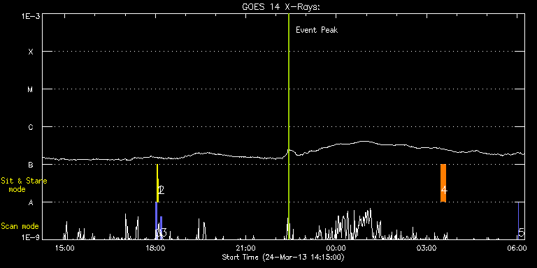 EIS Observation timeline overlay to GOES-Xray curve Code 1" 2" 40" 266" EIS Observations list for this event: STUDY ACRONYM ID DATE OBSERVED DESCRIPTION NOAA# TARGET 0 PRY_slot_contextLITE | 32629 | 2013/03/24 17:59:49 | Measurements during XRT Synoptic | | Active Region TIMELINE ID DATE OBSERVED FITS FILE XCEN (+W/-E) YCEN (+N/-S) DUR ----------------------------------------------------------------------------------------------------------------- 32629 | 2013/03/24 17:59:49.000 | eis_l0_20130324_175949.fits.gz | -15.14 | -0.35 | 2m56s 1 Alignment_266 | 32630 | 2013/03/24 18:03:04 | Measurements during XRT Synoptic | | Quiet Sun TIMELINE ID DATE OBSERVED FITS FILE XCEN (+W/-E) YCEN (+N/-S) DUR ----------------------------------------------------------------------------------------------------------------- 32630 | 2013/03/24 18:03:04.000 | eis_l0_20130324_180304.fits.gz | -132.57 | -0.42 | 1m22s 2 XRT_synop_AIA | 32631 | 2013/03/24 18:05:11 | Measurements during XRT Synoptic | | Quiet Sun TIMELINE ID DATE OBSERVED FITS FILE XCEN (+W/-E) YCEN (+N/-S) DUR ----------------------------------------------------------------------------------------------------------------- 32631 | 2013/03/24 18:05:11.000 | eis_l0_20130324_180511.fits.gz | -132.57 | -0.42 | 10s 3 PRY_slot_contextLITE | 32658 | 2013/03/24 18:10:26 | | 1695 | Active Region TIMELINE ID DATE OBSERVED FITS FILE XCEN (+W/-E) YCEN (+N/-S) DUR ----------------------------------------------------------------------------------------------------------------- 32658 | 2013/03/24 18:10:26.000 | eis_l0_20130324_181026.fits.gz | 894.92 | 149.75 | 2m57s 4 EL_WHI_CH_limb | 32664 | 2013/03/25 03:28:17 | CME watch | | Coronal Hole TIMELINE ID DATE OBSERVED FITS FILE XCEN (+W/-E) YCEN (+N/-S) DUR ----------------------------------------------------------------------------------------------------------------- 32664 | 2013/03/25 03:28:17.000 | eis_l0_20130325_032817.fits.gz | 1029.31 | 269.67 | 10m 5 PRY_slot_contextLITE | 32632 | 2013/03/25 06:02:19 | Measurements during XRT Synoptic | | Active Region TIMELINE ID DATE OBSERVED FITS FILE XCEN (+W/-E) YCEN (+N/-S) DUR ----------------------------------------------------------------------------------------------------------------- 32632 | 2013/03/25 06:02:19.000 | eis_l0_20130325_060219.fits.gz | -15.37 | -0.58 | 21s : Check study information : Download file : View thumbnails For this event, also check for: