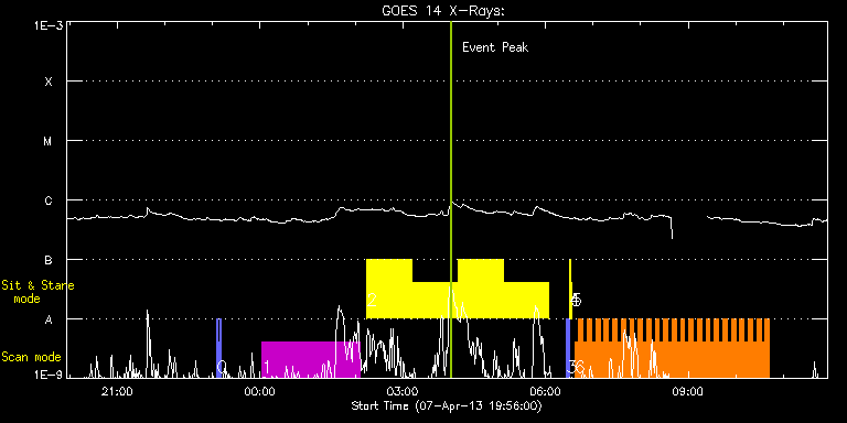 EIS Observation timeline overlay to GOES-Xray curve Code 1" 2" 40" 266" EIS Observations list for this event: STUDY ACRONYM ID DATE OBSERVED DESCRIPTION NOAA# TARGET 0 eis_eitwave_context | 32864 | 2013/04/07 23:05:32 | Dynamics and physical properties of la | | Quiet Sun TIMELINE ID DATE OBSERVED FITS FILE XCEN (+W/-E) YCEN (+N/-S) DUR ----------------------------------------------------------------------------------------------------------------- 32864 | 2013/04/07 23:05:32.000 | eis_l0_20130407_230532.fits.gz | -814.80 | 381.40 | 1m32s 32864 | 2013/04/07 23:07:08.000 | eis_l0_20130407_230708.fits.gz | -814.64 | 381.32 | 1m32s 32864 | 2013/04/07 23:08:43.000 | eis_l0_20130407_230843.fits.gz | -814.57 | 381.40 | 1m32s 1 HPW021_VEL_240x512v1 | 32868 | 2013/04/08 00:02:19 | Diagnostic scan of returning AR. | 1719 | Active Region TIMELINE ID DATE OBSERVED FITS FILE XCEN (+W/-E) YCEN (+N/-S) DUR ----------------------------------------------------------------------------------------------------------------- 32868 | 2013/04/08 00:02:19.000 | eis_l0_20130408_000219.fits.gz | -790.87 | 177.32 | 2h3m47s 2 Flare266_Hunter03 | 32869 | 2013/04/08 02:14:49 | Flare Hunting... | | Flare TIMELINE ID DATE OBSERVED FITS FILE XCEN (+W/-E) YCEN (+N/-S) DUR ----------------------------------------------------------------------------------------------------------------- 32869 | 2013/04/08 02:14:49.000 | eis_l0_20130408_021449.fits.gz | -973.93 | 178.95 | 56m54s 32869 | 2013/04/08 03:12:10.000 | eis_l0_20130408_031210.fits.gz | -968.76 | 179.72 | 56m53s 32869 | 2013/04/08 04:09:30.000 | eis_l0_20130408_040930.fits.gz | -963.66 | 180.41 | 56m54s 32869 | 2013/04/08 05:06:51.000 | eis_l0_20130408_050651.fits.gz | -958.48 | 181.26 | 56m53s 3 PRY_slot_contextLITE | 32853 | 2013/04/08 06:26:56 | EIS/AIA Alignment Check | 1716 | Active Region TIMELINE ID DATE OBSERVED FITS FILE XCEN (+W/-E) YCEN (+N/-S) DUR ----------------------------------------------------------------------------------------------------------------- 32853 | 2013/04/08 06:26:56.000 | eis_l0_20130408_062656.fits.gz | -15.21 | -0.42 | 2m56s 4 Alignment_266 | 32854 | 2013/04/08 06:30:11 | EIS/AIA Alignment Check | 1716 | Quiet Sun TIMELINE ID DATE OBSERVED FITS FILE XCEN (+W/-E) YCEN (+N/-S) DUR ----------------------------------------------------------------------------------------------------------------- 32854 | 2013/04/08 06:30:11.000 | eis_l0_20130408_063011.fits.gz | -132.41 | -0.42 | 1m22s 5 XRT_synop_AIA | 32855 | 2013/04/08 06:32:45 | EIS/AIA Alignment Check | 1716 | Quiet Sun TIMELINE ID DATE OBSERVED FITS FILE XCEN (+W/-E) YCEN (+N/-S) DUR ----------------------------------------------------------------------------------------------------------------- 32855 | 2013/04/08 06:32:45.000 | eis_l0_20130408_063245.fits.gz | -132.64 | -0.27 | 10s 6 HH_Flare+AR_180x152 | 32879 | 2013/04/08 06:36:49 | Flare Mode Observations | 1719 | Flare TIMELINE ID DATE OBSERVED FITS FILE XCEN (+W/-E) YCEN (+N/-S) DUR ----------------------------------------------------------------------------------------------------------------- 32879 | 2013/04/08 06:36:49.000 | eis_l0_20130408_063649.fits.gz | -757.47 | 182.58 | 5m18s 32879 | 2013/04/08 06:42:10.000 | eis_l0_20130408_064210.fits.gz | -756.93 | 182.35 | 5m18s 32879 | 2013/04/08 06:47:31.000 | eis_l0_20130408_064731.fits.gz | -756.47 | 182.50 | 5m17s 32879 | 2013/04/08 06:52:51.000 | eis_l0_20130408_065251.fits.gz | -756.00 | 182.65 | 5m18s 32879 | 2013/04/08 06:58:12.000 | eis_l0_20130408_065812.fits.gz | -755.46 | 182.58 | 5m18s 32879 | 2013/04/08 07:03:32.000 | eis_l0_20130408_070332.fits.gz | -755.00 | 182.65 | 5m19s 32879 | 2013/04/08 07:08:54.000 | eis_l0_20130408_070854.fits.gz | -754.46 | 182.73 | 5m17s 32879 | 2013/04/08 07:14:14.000 | eis_l0_20130408_071414.fits.gz | -753.99 | 182.81 | 5m18s 32879 | 2013/04/08 07:19:35.000 | eis_l0_20130408_071935.fits.gz | -753.38 | 182.89 | 5m18s 32879 | 2013/04/08 07:24:55.000 | eis_l0_20130408_072455.fits.gz | -752.91 | 183.04 | 5m18s 32879 | 2013/04/08 07:30:16.000 | eis_l0_20130408_073016.fits.gz | -752.45 | 183.04 | 5m18s 32879 | 2013/04/08 07:35:37.000 | eis_l0_20130408_073537.fits.gz | -751.83 | 183.04 | 5m18s 32879 | 2013/04/08 07:40:58.000 | eis_l0_20130408_074058.fits.gz | -751.37 | 183.20 | 5m17s 32879 | 2013/04/08 07:46:18.000 | eis_l0_20130408_074618.fits.gz | -750.91 | 183.43 | 5m18s 32879 | 2013/04/08 07:51:38.000 | eis_l0_20130408_075138.fits.gz | -750.29 | 183.27 | 5m19s 32879 | 2013/04/08 07:56:59.000 | eis_l0_20130408_075659.fits.gz | -749.90 | 183.43 | 5m18s 32879 | 2013/04/08 08:02:20.000 | eis_l0_20130408_080220.fits.gz | -749.36 | 183.43 | 5m17s 32879 | 2013/04/08 08:07:40.000 | eis_l0_20130408_080740.fits.gz | -748.82 | 183.58 | 5m18s 32879 | 2013/04/08 08:13:01.000 | eis_l0_20130408_081301.fits.gz | -748.35 | 183.58 | 5m18s 32879 | 2013/04/08 08:18:22.000 | eis_l0_20130408_081822.fits.gz | -747.82 | 183.66 | 5m18s 32879 | 2013/04/08 08:23:43.000 | eis_l0_20130408_082343.fits.gz | -747.27 | 183.66 | 5m18s 32879 | 2013/04/08 08:29:03.000 | eis_l0_20130408_082903.fits.gz | -746.81 | 183.81 | 5m18s 32879 | 2013/04/08 08:34:24.000 | eis_l0_20130408_083424.fits.gz | -746.27 | 183.81 | 5m18s 32879 | 2013/04/08 08:39:45.000 | eis_l0_20130408_083945.fits.gz | -745.81 | 183.81 | 5m18s 32879 | 2013/04/08 08:45:06.000 | eis_l0_20130408_084506.fits.gz | -745.27 | 183.89 | 5m17s 32879 | 2013/04/08 08:50:26.000 | eis_l0_20130408_085026.fits.gz | -744.72 | 183.89 | 5m17s 32879 | 2013/04/08 08:55:46.000 | eis_l0_20130408_085546.fits.gz | -744.34 | 184.04 | 5m18s 32879 | 2013/04/08 09:01:07.000 | eis_l0_20130408_090107.fits.gz | -743.72 | 184.12 | 5m18s 32879 | 2013/04/08 09:06:27.000 | eis_l0_20130408_090627.fits.gz | -743.18 | 184.20 | 5m18s 32879 | 2013/04/08 09:11:48.000 | eis_l0_20130408_091148.fits.gz | -742.72 | 184.28 | 5m19s 32879 | 2013/04/08 09:17:10.000 | eis_l0_20130408_091710.fits.gz | -742.10 | 184.35 | 5m17s 32879 | 2013/04/08 09:22:30.000 | ei