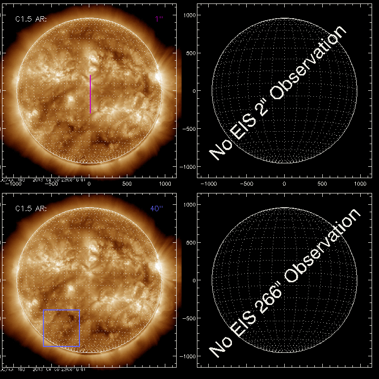 EIS Observation timeline overlay to GOES-Xray curve Code 1" 2" 40" 266" EIS Observations list for this event: STUDY ACRONYM ID DATE OBSERVED DESCRIPTION NOAA# TARGET 0 regcal076 | 32883 | 2013/04/09 18:02:12 | Flatfield, 1 exposure, led 100ms, ccd | | Engineering TIMELINE ID DATE OBSERVED FITS FILE XCEN (+W/-E) YCEN (+N/-S) DUR ----------------------------------------------------------------------------------------------------------------- 32883 | 2013/04/09 18:02:12.000 | eis_l0_20130409_180212.fits.gz | 14.67 | -50.35 | 1s 1 PRY_slot_context_v3 | 32891 | 2013/04/09 18:12:20 | Context image for HOP-229. | | Active Region TIMELINE ID DATE OBSERVED FITS FILE XCEN (+W/-E) YCEN (+N/-S) DUR ----------------------------------------------------------------------------------------------------------------- 32891 | 2013/04/09 18:12:20.000 | eis_l0_20130409_181220.fits.gz | -364.37 | -635.94 | 2m56s : Check study information : Download file : View thumbnails For this event, also check for: