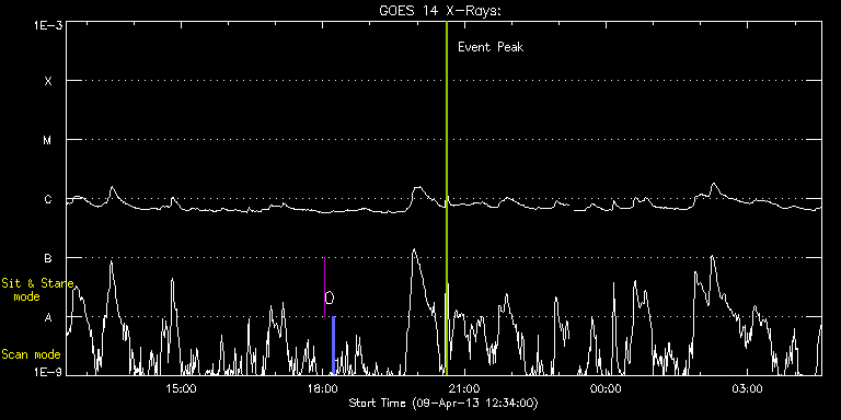 EIS Observation timeline overlay to GOES-Xray curve Code 1" 2" 40" 266" EIS Observations list for this event: STUDY ACRONYM ID DATE OBSERVED DESCRIPTION NOAA# TARGET 0 regcal076 | 32883 | 2013/04/09 18:02:12 | Flatfield, 1 exposure, led 100ms, ccd | | Engineering TIMELINE ID DATE OBSERVED FITS FILE XCEN (+W/-E) YCEN (+N/-S) DUR ----------------------------------------------------------------------------------------------------------------- 32883 | 2013/04/09 18:02:12.000 | eis_l0_20130409_180212.fits.gz | 14.67 | -50.35 | 1s 1 PRY_slot_context_v3 | 32891 | 2013/04/09 18:12:20 | Context image for HOP-229. | | Active Region TIMELINE ID DATE OBSERVED FITS FILE XCEN (+W/-E) YCEN (+N/-S) DUR ----------------------------------------------------------------------------------------------------------------- 32891 | 2013/04/09 18:12:20.000 | eis_l0_20130409_181220.fits.gz | -364.37 | -635.94 | 2m56s : Check study information : Download file : View thumbnails For this event, also check for: