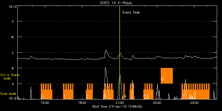 EIS Observation timeline overlay to GOES-Xray curve Code 1" 2" 40" 266" EIS Observations list for this event: STUDY ACRONYM ID DATE OBSERVED DESCRIPTION NOAA# TARGET 0 IUU_SCAN_STEPS_002 | 32970 | 2013/04/13 14:40:13 | emerging AR 11721 obs | | Active Region TIMELINE ID DATE OBSERVED FITS FILE XCEN (+W/-E) YCEN (+N/-S) DUR ----------------------------------------------------------------------------------------------------------------- 32970 | 2013/04/13 14:40:13.000 | eis_l0_20130413_144013.fits.gz | 1.08 | -249.39 | 5m24s 32970 | 2013/04/13 14:45:41.000 | eis_l0_20130413_144541.fits.gz | 1.93 | -249.32 | 5m23s 32970 | 2013/04/13 14:51:07.000 | eis_l0_20130413_145107.fits.gz | 2.62 | -249.32 | 5m24s 32970 | 2013/04/13 14:56:34.000 | eis_l0_20130413_145634.fits.gz | 3.39 | -249.24 | 5m24s 32970 | 2013/04/13 15:02:01.000 | eis_l0_20130413_150201.fits.gz | 4.09 | -249.39 | 5m23s 32970 | 2013/04/13 15:07:28.000 | eis_l0_20130413_150728.fits.gz | 4.94 | -249.32 | 5m23s 32970 | 2013/04/13 15:12:54.000 | eis_l0_20130413_151254.fits.gz | 5.71 | -249.55 | 5m24s 32970 | 2013/04/13 15:18:21.000 | eis_l0_20130413_151821.fits.gz | 6.48 | -249.39 | 5m24s 32970 | 2013/04/13 15:23:48.000 | eis_l0_20130413_152348.fits.gz | 7.33 | -249.39 | 5m23s 32970 | 2013/04/13 15:29:15.000 | eis_l0_20130413_152915.fits.gz | 8.11 | -249.24 | 5m23s 1 IUU_SCAN_STEPS_002 | 32971 | 2013/04/13 16:28:13 | emerging AR 11721 obs | | Active Region TIMELINE ID DATE OBSERVED FITS FILE XCEN (+W/-E) YCEN (+N/-S) DUR ----------------------------------------------------------------------------------------------------------------- 32971 | 2013/04/13 16:28:13.000 | eis_l0_20130413_162813.fits.gz | 16.45 | -249.39 | 5m24s 32971 | 2013/04/13 16:33:40.000 | eis_l0_20130413_163340.fits.gz | 17.22 | -249.62 | 5m24s 32971 | 2013/04/13 16:39:07.000 | eis_l0_20130413_163907.fits.gz | 17.99 | -249.39 | 5m24s 32971 | 2013/04/13 16:44:34.000 | eis_l0_20130413_164434.fits.gz | 18.69 | -249.55 | 5m24s 32971 | 2013/04/13 16:50:01.000 | eis_l0_20130413_165001.fits.gz | 19.54 | -249.70 | 5m24s 32971 | 2013/04/13 16:55:28.000 | eis_l0_20130413_165528.fits.gz | 20.39 | -249.55 | 5m24s 32971 | 2013/04/13 17:00:55.000 | eis_l0_20130413_170055.fits.gz | 21.16 | -249.55 | 5m23s 32971 | 2013/04/13 17:06:22.000 | eis_l0_20130413_170622.fits.gz | 21.86 | -249.47 | 5m23s 32971 | 2013/04/13 17:11:48.000 | eis_l0_20130413_171148.fits.gz | 22.63 | -249.55 | 5m24s 2 HH_Flare+AR_180x152 | 32984 | 2013/04/13 18:17:46 | AR 11718 obs | 1718 | Flare TIMELINE ID DATE OBSERVED FITS FILE XCEN (+W/-E) YCEN (+N/-S) DUR ----------------------------------------------------------------------------------------------------------------- 32984 | 2013/04/13 18:17:46.000 | eis_l0_20130413_181746.fits.gz | 721.59 | 385.97 | 5m19s 32984 | 2013/04/13 18:23:07.000 | eis_l0_20130413_182307.fits.gz | 721.98 | 385.82 | 5m18s 32984 | 2013/04/13 18:28:28.000 | eis_l0_20130413_182828.fits.gz | 722.52 | 385.74 | 5m17s 32984 | 2013/04/13 18:33:48.000 | eis_l0_20130413_183348.fits.gz | 722.90 | 385.58 | 5m18s 32984 | 2013/04/13 18:39:09.000 | eis_l0_20130413_183909.fits.gz | 723.44 | 385.66 | 5m17s 32984 | 2013/04/13 18:44:29.000 | eis_l0_20130413_184429.fits.gz | 723.83 | 385.51 | 5m18s 3 HH_Flare+AR_180x152 | 33006 | 2013/04/13 19:41:43 | AR 11718 obs | 1718 | Flare TIMELINE ID DATE OBSERVED FITS FILE XCEN (+W/-E) YCEN (+N/-S) DUR ----------------------------------------------------------------------------------------------------------------- 33006 | 2013/04/13 19:41:43.000 | eis_l0_20130413_194143.fits.gz | 728.62 | 384.89 | 5m19s 33006 | 2013/04/13 19:47:05.000 | eis_l0_20130413_194705.fits.gz | 729.01 | 384.89 | 5m17s 33006 | 2013/04/13 19:52:25.000 | eis_l0_20130413_195225.fits.gz | 729.47 | 384.81 | 5m18s 33006 | 2013/04/13 19:57:46.000 | eis_l0_20130413_195746.fits.gz | 729.93 | 384.66 | 5m18s 33006 | 2013/04/13 20:03:07.000 | eis_l0_20130413_200307.fits.gz | 730.40 | 384.42 | 5m17s 33006 | 2013/04/13 20:08:27.000 | eis_l0_20130413_200827.fits.gz | 730.71 | 384.50 | 5m18s 33006 | 2013/04/13 20:13:48.000 | eis_l0_20130413_201348.fits.gz | 731.24 | 384.42 | 5m18s 33006 | 2013/04/13 20:19:09.000 | eis_l0_20130413_201909.fits.gz | 731.63 | 384.27 | 5m17s 33006 | 2013/04/13 20:24:29.000 | eis_l0_20130413_202429.fits.gz | 732.17 | 384.35 | 5m18s 4 HH_Flare+AR_180x152 | 33007 | 2013/04/13 21:19:13 | AR 11718 obs | 1718 | Flare TIMELINE ID DATE OBSERVED FITS FILE XCEN (+W/-E) YCEN (+N/-S) DUR ----------------------------------------------------------------------------------------------------------------- 33007 | 2013/04/13 21:19:13.000 | eis_l0_20130413_211913.fits.gz | 736.50 | 383.58 | 4m14s 33007 | 2013/04/13 21:47:54.000 | eis_l0_20130413_214754.fits.gz | 738.82 | 383.27 | 3m20s 33007 | 2013/04/13 21:51:17.000 | eis_l0_20130413_215117.fits.gz | 739.12 | 383.19 | 5m18s 33007 | 2013/04/13 21:56:38.000 | eis_l0_20130413_215638.fits.gz | 739.51 | 383.27 | 5m18s 33007 | 2013/04/13 22:01:59.000 | eis_l0_20130413_220159.fits.gz | 739.97 | 383.19 | 5m17s 5 HH_Flare+AR_180x152 | 33008 | 2013/04/13 22:54:13 | AR 11718 obs | 1718 | Flare TIMELINE ID DATE OBSERVED FITS FILE XCEN (+W/-E) YCEN (+N/-S) DUR ----------------------------------------------------------------------------------------------------------------- 33008 | 2013/04/13 22:54:13.000 | eis_l0_20130413_225413.fits.gz | 744.15 | 382.42 | 5m17s 33008 | 2013/04/13 22:59:33.000 | eis_l0_20130413_225933.fits.gz | 744.46 | 382.42 | 5m19s 33008 | 2013/04/13 23:04:54.000 | eis_l0_20130413_230454.fits.gz | 744.92 | 382.26 | 5m18s 33008 | 2013/04/13 23:10:15.000 | eis_l0_20130413_231015.fits.gz | 745.30 | 382.34 | 5m18s 33008 | 2013/04/13 23:15:36.000 | eis_l0_20130413_231536.fits.gz | 745.69 | 382.42 | 5m18s 33008 | 2013/04/13 23:20:57.000 | eis_l0_20130413_232057.fits.gz | 746.23 | 382.18 | 5m17s 33008 | 2013/04/13 23:26:17.000 | eis_l0_20130413_232617.fits.gz | 746.62 | 382.03 | 5m19s 33008 | 2013/04/13 23:31:38.000 | eis_l0_20130413_233138.fits.gz