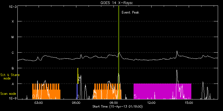 EIS Observation timeline overlay to GOES-Xray curve Code 1" 2" 40" 266" EIS Observations list for this event: STUDY ACRONYM ID DATE OBSERVED DESCRIPTION NOAA# TARGET 0 HH_Flare+AR_180x152 | 32986 | 2013/04/15 02:29:42 | AR 11718 obs | 1718 | Flare TIMELINE ID DATE OBSERVED FITS FILE XCEN (+W/-E) YCEN (+N/-S) DUR ----------------------------------------------------------------------------------------------------------------- 32986 | 2013/04/15 02:29:42.000 | eis_l0_20130415_022942.fits.gz | 870.73 | 359.63 | 5m18s 32986 | 2013/04/15 02:35:03.000 | eis_l0_20130415_023503.fits.gz | 870.81 | 359.55 | 5m18s 32986 | 2013/04/15 02:40:24.000 | eis_l0_20130415_024024.fits.gz | 870.81 | 359.55 | 5m17s 32986 | 2013/04/15 02:45:44.000 | eis_l0_20130415_024544.fits.gz | 870.73 | 359.40 | 5m18s 32986 | 2013/04/15 02:51:05.000 | eis_l0_20130415_025105.fits.gz | 870.89 | 359.55 | 5m18s 32986 | 2013/04/15 02:56:26.000 | eis_l0_20130415_025626.fits.gz | 870.73 | 359.55 | 5m18s 32986 | 2013/04/15 03:01:46.000 | eis_l0_20130415_030146.fits.gz | 870.81 | 359.55 | 5m18s 32986 | 2013/04/15 03:07:06.000 | eis_l0_20130415_030706.fits.gz | 870.81 | 359.55 | 5m19s 32986 | 2013/04/15 03:12:28.000 | eis_l0_20130415_031228.fits.gz | 870.73 | 359.55 | 5m17s 32986 | 2013/04/15 03:17:48.000 | eis_l0_20130415_031748.fits.gz | 870.81 | 359.55 | 5m18s 32986 | 2013/04/15 03:23:09.000 | eis_l0_20130415_032309.fits.gz | 870.73 | 359.63 | 5m17s 32986 | 2013/04/15 03:28:29.000 | eis_l0_20130415_032829.fits.gz | 870.81 | 359.63 | 5m18s 32986 | 2013/04/15 03:33:50.000 | eis_l0_20130415_033350.fits.gz | 870.81 | 359.47 | 5m18s 32986 | 2013/04/15 03:39:11.000 | eis_l0_20130415_033911.fits.gz | 870.81 | 359.47 | 5m18s 32986 | 2013/04/15 03:44:32.000 | eis_l0_20130415_034432.fits.gz | 870.81 | 359.40 | 5m18s 32986 | 2013/04/15 03:49:53.000 | eis_l0_20130415_034953.fits.gz | 870.81 | 359.32 | 5m17s 32986 | 2013/04/15 03:55:13.000 | eis_l0_20130415_035513.fits.gz | 870.73 | 359.55 | 5m18s 32986 | 2013/04/15 04:00:33.000 | eis_l0_20130415_040033.fits.gz | 870.81 | 359.55 | 5m18s 32986 | 2013/04/15 04:05:54.000 | eis_l0_20130415_040554.fits.gz | 870.81 | 359.55 | 5m18s 32986 | 2013/04/15 04:11:15.000 | eis_l0_20130415_041115.fits.gz | 870.81 | 359.47 | 5m18s 32986 | 2013/04/15 04:14:05.000 | eis_l0_20130415_041405.fits.gz | 870.81 | 359.47 | 2m28s 32986 | 2013/04/15 04:16:35.000 | eis_l0_20130415_041635.fits.gz | 870.73 | 359.63 | 5m19s 32986 | 2013/04/15 04:21:57.000 | eis_l0_20130415_042157.fits.gz | 870.73 | 359.55 | 5m18s 32986 | 2013/04/15 04:27:17.000 | eis_l0_20130415_042717.fits.gz | 870.81 | 359.47 | 5m19s 32986 | 2013/04/15 04:32:38.000 | eis_l0_20130415_043238.fits.gz | 870.89 | 359.47 | 5m19s 32986 | 2013/04/15 04:37:59.000 | eis_l0_20130415_043759.fits.gz | 870.81 | 359.47 | 5m18s 1 PRY_slot_contextLITE | 32993 | 2013/04/15 06:03:19 | EIS AIA alignment | | Active Region TIMELINE ID DATE OBSERVED FITS FILE XCEN (+W/-E) YCEN (+N/-S) DUR ----------------------------------------------------------------------------------------------------------------- 32993 | 2013/04/15 06:03:19.000 | eis_l0_20130415_060319.fits.gz | -15.29 | -0.50 | 2m57s 2 Alignment_266 | 32994 | 2013/04/15 06:07:01 | EIS AIA alignment | | Quiet Sun TIMELINE ID DATE OBSERVED FITS FILE XCEN (+W/-E) YCEN (+N/-S) DUR ----------------------------------------------------------------------------------------------------------------- 32994 | 2013/04/15 06:07:01.000 | eis_l0_20130415_060701.fits.gz | -132.41 | -0.58 | 1m21s 3 XRT_synop_AIA | 32995 | 2013/04/15 06:09:27 | EIS AIA alignment | | Quiet Sun TIMELINE ID DATE OBSERVED FITS FILE XCEN (+W/-E) YCEN (+N/-S) DUR ----------------------------------------------------------------------------------------------------------------- 32995 | 2013/04/15 06:09:27.000 | eis_l0_20130415_060927.fits.gz | -132.49 | -0.58 | 10s 4 HH_Flare+AR_180x152 | 32987 | 2013/04/15 07:22:19 | AR 11718 obs | 1718 | Flare TIMELINE ID DATE OBSERVED FITS FILE XCEN (+W/-E) YCEN (+N/-S) DUR ----------------------------------------------------------------------------------------------------------------- 32987 | 2013/04/15 07:22:19.000 | eis_l0_20130415_072219.fits.gz | 870.81 | 359.55 | 5m18s 32987 | 2013/04/15 07:27:40.000 | eis_l0_20130415_072740.fits.gz | 870.66 | 359.55 | 5m17s 32987 | 2013/04/15 07:33:00.000 | eis_l0_20130415_073300.fits.gz | 870.81 | 359.63 | 5m18s 32987 | 2013/04/15 07:38:21.000 | eis_l0_20130415_073821.fits.gz | 870.73 | 359.86 | 5m18s 32987 | 2013/04/15 07:43:42.000 | eis_l0_20130415_074342.fits.gz | 870.73 | 359.55 | 5m17s 32987 | 2013/04/15 07:49:02.000 | eis_l0_20130415_074902.fits.gz | 870.73 | 359.55 | 5m18s 32987 | 2013/04/15 07:54:23.000 | eis_l0_20130415_075423.fits.gz | 870.81 | 359.47 | 5m17s 32987 | 2013/04/15 07:59:43.000 | eis_l0_20130415_075943.fits.gz | 870.81 | 359.55 | 5m18s 32987 | 2013/04/15 08:05:04.000 | eis_l0_20130415_080504.fits.gz | 870.73 | 359.40 | 5m18s 32987 | 2013/04/15 08:10:24.000 | eis_l0_20130415_081024.fits.gz | 870.73 | 359.55 | 5m18s 32987 | 2013/04/15 08:15:45.000 | eis_l0_20130415_081545.fits.gz | 870.73 | 359.63 | 5m18s 32987 | 2013/04/15 08:21:06.000 | eis_l0_20130415_082106.fits.gz | 870.81 | 359.55 | 5m18s 32987 | 2013/04/15 08:26:27.000 | eis_l0_20130415_082627.fits.gz | 870.89 | 359.40 | 5m18s 32987 | 2013/04/15 08:31:48.000 | eis_l0_20130415_083148.fits.gz | 870.81 | 359.63 | 5m18s 32987 | 2013/04/15 08:37:09.000 | eis_l0_20130415_083709.fits.gz | 870.81 | 359.55 | 5m18s 32987 | 2013/04/15 08:42:29.000 | eis_l0_20130415_084229.fits.gz | 870.81 | 359.47 | 5m18s 32987 | 2013/04/15 08:47:50.000 | eis_l0_20130415_084750.fits.gz | 870.81 | 359.55 | 5m18s 32987 | 2013/04/15 08:53:11.000 | eis_l0_20130415_085311.fits.gz | 870.73 | 359.55 | 5m18s 32987 | 2013/04/15 08:58:32.000 | eis_l0_20130415_085832.fits.gz | 870.81 | 359.55 | 5m18s 32987 | 2013/04/15 09:03:53.000 | eis_l0_20130415_090353.fits.gz | 870.73 | 359.40 | 5m18s 32987 | 2013/04/15 09:09:14.000 | eis_l0_20130415_090914.fits.g