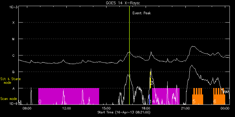 EIS Observation timeline overlay to GOES-Xray curve Code 1" 2" 40" 266" EIS Observations list for this event: STUDY ACRONYM ID DATE OBSERVED DESCRIPTION NOAA# TARGET 0 SK_CH_DIAG_320x384 | 33009 | 2013/04/16 09:51:35 | HOP 81 (north pole) | | Coronal Hole TIMELINE ID DATE OBSERVED FITS FILE XCEN (+W/-E) YCEN (+N/-S) DUR ----------------------------------------------------------------------------------------------------------------- 33009 | 2013/04/16 09:51:35.000 | eis_l0_20130416_095135.fits.gz | -14.88 | 879.27 | 4h35m38s 1 PRY_slot_contextLITE | 33023 | 2013/04/16 18:15:24 | EIS alignment with AIA, IRIS | 1723 | Active Region TIMELINE ID DATE OBSERVED FITS FILE XCEN (+W/-E) YCEN (+N/-S) DUR ----------------------------------------------------------------------------------------------------------------- 33023 | 2013/04/16 18:15:24.000 | eis_l0_20130416_181524.fits.gz | -15.29 | -0.58 | 2m56s 2 Alignment_266 | 33024 | 2013/04/16 18:18:57 | EIS alignment with AIA, IRIS | 1723 | Quiet Sun TIMELINE ID DATE OBSERVED FITS FILE XCEN (+W/-E) YCEN (+N/-S) DUR ----------------------------------------------------------------------------------------------------------------- 33024 | 2013/04/16 18:18:57.000 | eis_l0_20130416_181857.fits.gz | -132.49 | -0.50 | 1m22s 3 XRT_synop_AIA | 33025 | 2013/04/16 18:21:54 | EIS alignment with AIA, IRIS | 1723 | Quiet Sun TIMELINE ID DATE OBSERVED FITS FILE XCEN (+W/-E) YCEN (+N/-S) DUR ----------------------------------------------------------------------------------------------------------------- 33025 | 2013/04/16 18:21:54.000 | eis_l0_20130416_182154.fits.gz | -132.49 | -0.50 | 10s 4 HPW021_VEL_240x512v1 | 33019 | 2013/04/16 18:29:27 | AR 11719 | 1718 | Active Region TIMELINE ID DATE OBSERVED FITS FILE XCEN (+W/-E) YCEN (+N/-S) DUR ----------------------------------------------------------------------------------------------------------------- 33019 | 2013/04/16 18:29:27.000 | eis_l0_20130416_182927.fits.gz | 844.08 | 175.78 | 2h3m47s 5 HH_Flare+AR_180x152 | 33022 | 2013/04/16 21:31:57 | AR 11719 | 1719 | Flare TIMELINE ID DATE OBSERVED FITS FILE XCEN (+W/-E) YCEN (+N/-S) DUR ----------------------------------------------------------------------------------------------------------------- 33022 | 2013/04/16 21:31:57.000 | eis_l0_20130416_213157.fits.gz | 874.27 | 173.23 | 5m18s 33022 | 2013/04/16 21:37:18.000 | eis_l0_20130416_213718.fits.gz | 874.73 | 173.00 | 5m18s 33022 | 2013/04/16 21:42:38.000 | eis_l0_20130416_214238.fits.gz | 874.96 | 173.07 | 5m18s 33022 | 2013/04/16 21:47:59.000 | eis_l0_20130416_214759.fits.gz | 875.35 | 173.00 | 5m19s 33022 | 2013/04/16 21:53:21.000 | eis_l0_20130416_215321.fits.gz | 875.66 | 173.00 | 5m18s 33022 | 2013/04/16 21:58:41.000 | eis_l0_20130416_215841.fits.gz | 876.05 | 172.69 | 5m18s 33022 | 2013/04/16 22:04:02.000 | eis_l0_20130416_220402.fits.gz | 876.28 | 172.61 | 5m18s 33022 | 2013/04/16 22:09:23.000 | eis_l0_20130416_220923.fits.gz | 876.74 | 172.77 | 5m18s 33022 | 2013/04/16 22:14:43.000 | eis_l0_20130416_221443.fits.gz | 877.05 | 172.46 | 5m19s 6 HH_Flare+AR_180x152 | 33026 | 2013/04/16 23:06:43 | AR 11719 | 1719 | Flare TIMELINE ID DATE OBSERVED FITS FILE XCEN (+W/-E) YCEN (+N/-S) DUR ----------------------------------------------------------------------------------------------------------------- 33026 | 2013/04/16 23:06:43.000 | eis_l0_20130416_230643.fits.gz | 880.29 | 171.84 | 5m18s 33026 | 2013/04/16 23:12:04.000 | eis_l0_20130416_231204.fits.gz | 880.68 | 171.76 | 5m17s 33026 | 2013/04/16 23:17:24.000 | eis_l0_20130416_231724.fits.gz | 881.07 | 171.76 | 5m18s 33026 | 2013/04/16 23:22:45.000 | eis_l0_20130416_232245.fits.gz | 881.38 | 171.68 | 5m19s 33026 | 2013/04/16 23:28:06.000 | eis_l0_20130416_232806.fits.gz | 881.61 | 171.61 | 5m17s 33026 | 2013/04/16 23:33:26.000 | eis_l0_20130416_233326.fits.gz | 881.99 | 171.38 | 5m17s 33026 | 2013/04/16 23:38:46.000 | eis_l0_20130416_233846.fits.gz | 882.30 | 171.38 | 5m19s 33026 | 2013/04/16 23:44:07.000 | eis_l0_20130416_234407.fits.gz | 882.61 | 171.45 | 5m18s 33026 | 2013/04/16 23:49:28.000 | eis_l0_20130416_234928.fits.gz | 883.08 | 171.22 | 5m19s 33026 | 2013/04/16 23:54:50.000 | eis_l0_20130416_235450.fits.gz | 883.38 | 171.07 | 5m17s : Check study information : Download file : View thumbnails For this event, also check for: