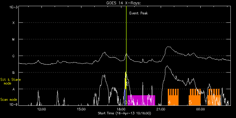 EIS Observation timeline overlay to GOES-Xray curve Code 1" 2" 40" 266" EIS Observations list for this event: STUDY ACRONYM ID DATE OBSERVED DESCRIPTION NOAA# TARGET 0 PRY_slot_contextLITE | 33023 | 2013/04/16 18:15:24 | EIS alignment with AIA, IRIS | 1723 | Active Region TIMELINE ID DATE OBSERVED FITS FILE XCEN (+W/-E) YCEN (+N/-S) DUR ----------------------------------------------------------------------------------------------------------------- 33023 | 2013/04/16 18:15:24.000 | eis_l0_20130416_181524.fits.gz | -15.29 | -0.58 | 2m56s 1 Alignment_266 | 33024 | 2013/04/16 18:18:57 | EIS alignment with AIA, IRIS | 1723 | Quiet Sun TIMELINE ID DATE OBSERVED FITS FILE XCEN (+W/-E) YCEN (+N/-S) DUR ----------------------------------------------------------------------------------------------------------------- 33024 | 2013/04/16 18:18:57.000 | eis_l0_20130416_181857.fits.gz | -132.49 | -0.50 | 1m22s 2 XRT_synop_AIA | 33025 | 2013/04/16 18:21:54 | EIS alignment with AIA, IRIS | 1723 | Quiet Sun TIMELINE ID DATE OBSERVED FITS FILE XCEN (+W/-E) YCEN (+N/-S) DUR ----------------------------------------------------------------------------------------------------------------- 33025 | 2013/04/16 18:21:54.000 | eis_l0_20130416_182154.fits.gz | -132.49 | -0.50 | 10s 3 HPW021_VEL_240x512v1 | 33019 | 2013/04/16 18:29:27 | AR 11719 | 1718 | Active Region TIMELINE ID DATE OBSERVED FITS FILE XCEN (+W/-E) YCEN (+N/-S) DUR ----------------------------------------------------------------------------------------------------------------- 33019 | 2013/04/16 18:29:27.000 | eis_l0_20130416_182927.fits.gz | 844.08 | 175.78 | 2h3m47s 4 HH_Flare+AR_180x152 | 33022 | 2013/04/16 21:31:57 | AR 11719 | 1719 | Flare TIMELINE ID DATE OBSERVED FITS FILE XCEN (+W/-E) YCEN (+N/-S) DUR ----------------------------------------------------------------------------------------------------------------- 33022 | 2013/04/16 21:31:57.000 | eis_l0_20130416_213157.fits.gz | 874.27 | 173.23 | 5m18s 33022 | 2013/04/16 21:37:18.000 | eis_l0_20130416_213718.fits.gz | 874.73 | 173.00 | 5m18s 33022 | 2013/04/16 21:42:38.000 | eis_l0_20130416_214238.fits.gz | 874.96 | 173.07 | 5m18s 33022 | 2013/04/16 21:47:59.000 | eis_l0_20130416_214759.fits.gz | 875.35 | 173.00 | 5m19s 33022 | 2013/04/16 21:53:21.000 | eis_l0_20130416_215321.fits.gz | 875.66 | 173.00 | 5m18s 33022 | 2013/04/16 21:58:41.000 | eis_l0_20130416_215841.fits.gz | 876.05 | 172.69 | 5m18s 33022 | 2013/04/16 22:04:02.000 | eis_l0_20130416_220402.fits.gz | 876.28 | 172.61 | 5m18s 33022 | 2013/04/16 22:09:23.000 | eis_l0_20130416_220923.fits.gz | 876.74 | 172.77 | 5m18s 33022 | 2013/04/16 22:14:43.000 | eis_l0_20130416_221443.fits.gz | 877.05 | 172.46 | 5m19s 5 HH_Flare+AR_180x152 | 33026 | 2013/04/16 23:06:43 | AR 11719 | 1719 | Flare TIMELINE ID DATE OBSERVED FITS FILE XCEN (+W/-E) YCEN (+N/-S) DUR ----------------------------------------------------------------------------------------------------------------- 33026 | 2013/04/16 23:06:43.000 | eis_l0_20130416_230643.fits.gz | 880.29 | 171.84 | 5m18s 33026 | 2013/04/16 23:12:04.000 | eis_l0_20130416_231204.fits.gz | 880.68 | 171.76 | 5m17s 33026 | 2013/04/16 23:17:24.000 | eis_l0_20130416_231724.fits.gz | 881.07 | 171.76 | 5m18s 33026 | 2013/04/16 23:22:45.000 | eis_l0_20130416_232245.fits.gz | 881.38 | 171.68 | 5m19s 33026 | 2013/04/16 23:28:06.000 | eis_l0_20130416_232806.fits.gz | 881.61 | 171.61 | 5m17s 33026 | 2013/04/16 23:33:26.000 | eis_l0_20130416_233326.fits.gz | 881.99 | 171.38 | 5m17s 33026 | 2013/04/16 23:38:46.000 | eis_l0_20130416_233846.fits.gz | 882.30 | 171.38 | 5m19s 33026 | 2013/04/16 23:44:07.000 | eis_l0_20130416_234407.fits.gz | 882.61 | 171.45 | 5m18s 33026 | 2013/04/16 23:49:28.000 | eis_l0_20130416_234928.fits.gz | 883.08 | 171.22 | 5m19s 33026 | 2013/04/16 23:54:50.000 | eis_l0_20130416_235450.fits.gz | 883.38 | 171.07 | 5m17s 6 HH_Flare+AR_180x152 | 33029 | 2013/04/17 00:31:43 | AR 11719 | 1719 | Flare TIMELINE ID DATE OBSERVED FITS FILE XCEN (+W/-E) YCEN (+N/-S) DUR ----------------------------------------------------------------------------------------------------------------- 33029 | 2013/04/17 00:31:43.000 | eis_l0_20130417_003143.fits.gz | 885.55 | 170.53 | 5m19s 33029 | 2013/04/17 00:37:05.000 | eis_l0_20130417_003705.fits.gz | 885.86 | 170.68 | 5m18s 33029 | 2013/04/17 00:42:25.000 | eis_l0_20130417_004225.fits.gz | 886.16 | 170.53 | 5m18s 33029 | 2013/04/17 00:47:46.000 | eis_l0_20130417_004746.fits.gz | 886.55 | 170.60 | 5m18s 33029 | 2013/04/17 00:53:07.000 | eis_l0_20130417_005307.fits.gz | 886.86 | 170.37 | 5m18s 33029 | 2013/04/17 00:58:28.000 | eis_l0_20130417_005828.fits.gz | 887.25 | 170.29 | 5m17s 33029 | 2013/04/17 01:03:48.000 | eis_l0_20130417_010348.fits.gz | 887.48 | 170.29 | 5m18s 33029 | 2013/04/17 01:09:09.000 | eis_l0_20130417_010909.fits.gz | 887.86 | 170.06 | 5m18s 33029 | 2013/04/17 01:14:30.000 | eis_l0_20130417_011430.fits.gz | 888.17 | 169.91 | 5m18s 33029 | 2013/04/17 01:19:51.000 | eis_l0_20130417_011951.fits.gz | 888.48 | 170.06 | 5m18s 33029 | 2013/04/17 01:25:12.000 | eis_l0_20130417_012512.fits.gz | 888.79 | 169.99 | 5m18s : Check study information : Download file : View thumbnails For this event, also check for: