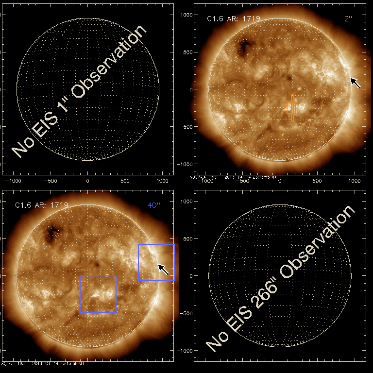 EIS Observation timeline overlay to GOES-Xray curve Code 1" 2" 40" 266" EIS Observations list for this event: STUDY ACRONYM ID DATE OBSERVED DESCRIPTION NOAA# TARGET 0 PRY_slot_context_v3 | 33046 | 2013/04/18 00:02:34 | Limb AR 11719 | 1719 | Active Region TIMELINE ID DATE OBSERVED FITS FILE XCEN (+W/-E) YCEN (+N/-S) DUR ----------------------------------------------------------------------------------------------------------------- 33046 | 2013/04/18 00:02:34.000 | eis_l0_20130418_000234.fits.gz | 919.77 | 174.77 | 57s 1 PRY_slot_context_v3 | 33047 | 2013/04/18 12:31:08 | EIS spectral atlas (AR11723) | 1723 | Active Region TIMELINE ID DATE OBSERVED FITS FILE XCEN (+W/-E) YCEN (+N/-S) DUR ----------------------------------------------------------------------------------------------------------------- 33047 | 2013/04/18 12:31:08.000 | eis_l0_20130418_123108.fits.gz | 138.97 | -250.71 | 2m56s 2 Atlas_60 | 33048 | 2013/04/18 12:39:46 | EIS spectral atlas (AR11723) | | Quiet Sun TIMELINE ID DATE OBSERVED FITS FILE XCEN (+W/-E) YCEN (+N/-S) DUR ----------------------------------------------------------------------------------------------------------------- 33048 | 2013/04/18 12:39:46.000 | eis_l0_20130418_123946.fits.gz | 154.95 | -250.63 | 1h1m39s 3 IUU_SCAN_STEPS_002 | 33049 | 2013/04/18 14:28:40 | emergin gAR 11723 | | Active Region TIMELINE ID DATE OBSERVED FITS FILE XCEN (+W/-E) YCEN (+N/-S) DUR ----------------------------------------------------------------------------------------------------------------- 33049 | 2013/04/18 14:28:40.000 | eis_l0_20130418_142840.fits.gz | 169.24 | -251.09 | 5m24s 33049 | 2013/04/18 14:34:07.000 | eis_l0_20130418_143407.fits.gz | 170.02 | -251.17 | 5m24s 33049 | 2013/04/18 14:39:34.000 | eis_l0_20130418_143934.fits.gz | 170.71 | -251.25 | 5m23s 33049 | 2013/04/18 14:45:01.000 | eis_l0_20130418_144501.fits.gz | 171.41 | -251.17 | 5m23s 33049 | 2013/04/18 14:50:28.000 | eis_l0_20130418_145028.fits.gz | 172.18 | -251.17 | 5m23s 33049 | 2013/04/18 14:55:54.000 | eis_l0_20130418_145554.fits.gz | 172.88 | -251.17 | 5m24s 33049 | 2013/04/18 15:01:21.000 | eis_l0_20130418_150121.fits.gz | 173.65 | -251.25 | 5m23s 33049 | 2013/04/18 15:06:48.000 | eis_l0_20130418_150648.fits.gz | 174.58 | -251.17 | 5m23s 33049 | 2013/04/18 15:12:15.000 | eis_l0_20130418_151215.fits.gz | 175.27 | -251.32 | 5m23s 33049 | 2013/04/18 15:17:42.000 | eis_l0_20130418_151742.fits.gz | 176.12 | -251.48 | 5m23s : Check study information : Download file : View thumbnails For this event, also check for: