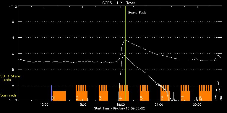 EIS Observation timeline overlay to GOES-Xray curve Code 1" 2" 40" 266" EIS Observations list for this event: STUDY ACRONYM ID DATE OBSERVED DESCRIPTION NOAA# TARGET 0 PRY_slot_context_v3 | 33047 | 2013/04/18 12:31:08 | EIS spectral atlas (AR11723) | 1723 | Active Region TIMELINE ID DATE OBSERVED FITS FILE XCEN (+W/-E) YCEN (+N/-S) DUR ----------------------------------------------------------------------------------------------------------------- 33047 | 2013/04/18 12:31:08.000 | eis_l0_20130418_123108.fits.gz | 138.97 | -250.71 | 2m56s 1 Atlas_60 | 33048 | 2013/04/18 12:39:46 | EIS spectral atlas (AR11723) | | Quiet Sun TIMELINE ID DATE OBSERVED FITS FILE XCEN (+W/-E) YCEN (+N/-S) DUR ----------------------------------------------------------------------------------------------------------------- 33048 | 2013/04/18 12:39:46.000 | eis_l0_20130418_123946.fits.gz | 154.95 | -250.63 | 1h1m39s 2 IUU_SCAN_STEPS_002 | 33049 | 2013/04/18 14:28:40 | emergin gAR 11723 | | Active Region TIMELINE ID DATE OBSERVED FITS FILE XCEN (+W/-E) YCEN (+N/-S) DUR ----------------------------------------------------------------------------------------------------------------- 33049 | 2013/04/18 14:28:40.000 | eis_l0_20130418_142840.fits.gz | 169.24 | -251.09 | 5m24s 33049 | 2013/04/18 14:34:07.000 | eis_l0_20130418_143407.fits.gz | 170.02 | -251.17 | 5m24s 33049 | 2013/04/18 14:39:34.000 | eis_l0_20130418_143934.fits.gz | 170.71 | -251.25 | 5m23s 33049 | 2013/04/18 14:45:01.000 | eis_l0_20130418_144501.fits.gz | 171.41 | -251.17 | 5m23s 33049 | 2013/04/18 14:50:28.000 | eis_l0_20130418_145028.fits.gz | 172.18 | -251.17 | 5m23s 33049 | 2013/04/18 14:55:54.000 | eis_l0_20130418_145554.fits.gz | 172.88 | -251.17 | 5m24s 33049 | 2013/04/18 15:01:21.000 | eis_l0_20130418_150121.fits.gz | 173.65 | -251.25 | 5m23s 33049 | 2013/04/18 15:06:48.000 | eis_l0_20130418_150648.fits.gz | 174.58 | -251.17 | 5m23s 33049 | 2013/04/18 15:12:15.000 | eis_l0_20130418_151215.fits.gz | 175.27 | -251.32 | 5m23s 33049 | 2013/04/18 15:17:42.000 | eis_l0_20130418_151742.fits.gz | 176.12 | -251.48 | 5m23s 3 IUU_SCAN_STEPS_002 | 33050 | 2013/04/18 16:17:13 | emerging AR 11723 | | Active Region TIMELINE ID DATE OBSERVED FITS FILE XCEN (+W/-E) YCEN (+N/-S) DUR ----------------------------------------------------------------------------------------------------------------- 33050 | 2013/04/18 16:17:13.000 | eis_l0_20130418_161713.fits.gz | 184.39 | -251.55 | 5m24s 33050 | 2013/04/18 16:22:40.000 | eis_l0_20130418_162240.fits.gz | 185.16 | -251.55 | 5m24s 33050 | 2013/04/18 16:28:07.000 | eis_l0_20130418_162807.fits.gz | 185.85 | -251.63 | 5m23s 33050 | 2013/04/18 16:33:34.000 | eis_l0_20130418_163334.fits.gz | 186.63 | -251.55 | 5m23s 33050 | 2013/04/18 16:39:00.000 | eis_l0_20130418_163900.fits.gz | 187.40 | -251.63 | 5m24s 33050 | 2013/04/18 16:44:27.000 | eis_l0_20130418_164427.fits.gz | 188.09 | -251.63 | 5m24s 33050 | 2013/04/18 16:49:54.000 | eis_l0_20130418_164954.fits.gz | 188.87 | -251.55 | 5m23s 33050 | 2013/04/18 16:55:21.000 | eis_l0_20130418_165521.fits.gz | 189.72 | -251.71 | 5m23s 4 IUU_SCAN_STEPS_002 | 33051 | 2013/04/18 17:53:43 | emerging AR 11723 | | Active Region TIMELINE ID DATE OBSERVED FITS FILE XCEN (+W/-E) YCEN (+N/-S) DUR ----------------------------------------------------------------------------------------------------------------- 33051 | 2013/04/18 17:53:43.000 | eis_l0_20130418_175343.fits.gz | 197.75 | -251.86 | 5m24s 33051 | 2013/04/18 17:59:10.000 | eis_l0_20130418_175910.fits.gz | 198.45 | -251.71 | 5m24s 33051 | 2013/04/18 18:04:37.000 | eis_l0_20130418_180437.fits.gz | 199.29 | -251.94 | 5m23s 33051 | 2013/04/18 18:10:04.000 | eis_l0_20130418_181004.fits.gz | 199.99 | -251.94 | 5m23s 33051 | 2013/04/18 18:15:31.000 | eis_l0_20130418_181531.fits.gz | 200.76 | -251.86 | 5m23s 33051 | 2013/04/18 18:20:57.000 | eis_l0_20130418_182057.fits.gz | 201.46 | -252.02 | 5m24s 33051 | 2013/04/18 18:26:24.000 | eis_l0_20130418_182624.fits.gz | 202.15 | -251.94 | 5m23s 33051 | 2013/04/18 18:31:51.000 | eis_l0_20130418_183151.fits.gz | 203.08 | -252.17 | 5m23s 5 HH_Flare+AR_180x152 | 33065 | 2013/04/18 19:30:43 | AR 11723 raster scan obs | 1723 | Flare TIMELINE ID DATE OBSERVED FITS FILE XCEN (+W/-E) YCEN (+N/-S) DUR ----------------------------------------------------------------------------------------------------------------- 33065 | 2013/04/18 19:30:43.000 | eis_l0_20130418_193043.fits.gz | 210.44 | -202.33 | 5m18s 33065 | 2013/04/18 19:36:04.000 | eis_l0_20130418_193604.fits.gz | 211.21 | -202.25 | 5m18s 33065 | 2013/04/18 19:41:25.000 | eis_l0_20130418_194125.fits.gz | 211.91 | -202.33 | 5m18s 33065 | 2013/04/18 19:46:46.000 | eis_l0_20130418_194646.fits.gz | 212.68 | -202.40 | 5m18s 33065 | 2013/04/18 19:52:07.000 | eis_l0_20130418_195207.fits.gz | 213.38 | -202.40 | 5m17s 33065 | 2013/04/18 19:57:27.000 | eis_l0_20130418_195727.fits.gz | 214.15 | -202.33 | 5m17s 33065 | 2013/04/18 20:02:47.000 | eis_l0_20130418_200247.fits.gz | 214.92 | -202.25 | 5m18s 33065 | 2013/04/18 20:08:08.000 | eis_l0_20130418_200808.fits.gz | 215.62 | -202.40 | 5m17s 6 HH_Flare+AR_180x152 | 33066 | 2013/04/18 21:08:13 | AR 11723 raster scan obs | 1723 | Flare TIMELINE ID DATE OBSERVED FITS FILE XCEN (+W/-E) YCEN (+N/-S) DUR ----------------------------------------------------------------------------------------------------------------- 33066 | 2013/04/18 21:08:13.000 | eis_l0_20130418_210813.fits.gz | 223.88 | -202.71 | 5m18s 33066 | 2013/04/18 21:13:34.000 | eis_l0_20130418_211334.fits.gz | 224.58 | -202.64 | 5m17s 33066 | 2013/04/18 21:18:54.000 | eis_l0_20130418_211854.fits.gz | 225.35 | -202.71 | 5m18s 33066 | 2013/04/18 21:24:14.000 | eis_l0_20130418_212414.fits.gz | 226.05 | -202.71 | 5m18s 33066 | 2013/04/18 21:29:35.000 | eis_l0_20130418_212935.fits.gz | 226.82 | -202.64 | 5m18s 33066 | 2013/04/18 21:34:56.000 | eis_l0_20130418_213456.fits.gz | 227.59 | -202.95 | 5m19s 33066 | 2013/04/18 21:40:17.000 | eis_l0_20130418_214017.fits