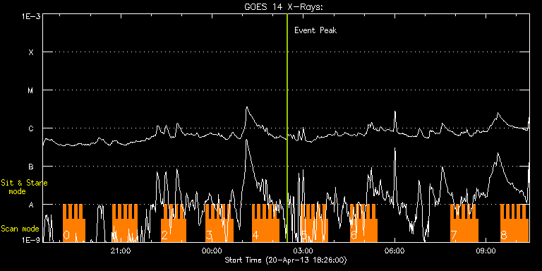 EIS Observation timeline overlay to GOES-Xray curve Code 1" 2" 40" 266" EIS Observations list for this event: STUDY ACRONYM ID DATE OBSERVED DESCRIPTION NOAA# TARGET 0 HH_Flare+AR_180x152 | 33111 | 2013/04/20 19:06:50 | AR 11723 Raster Scan Obs | 1723 | Flare TIMELINE ID DATE OBSERVED FITS FILE XCEN (+W/-E) YCEN (+N/-S) DUR ----------------------------------------------------------------------------------------------------------------- 33111 | 2013/04/20 19:06:50.000 | eis_l0_20130420_190650.fits.gz | 583.55 | -250.78 | 5m19s 33111 | 2013/04/20 19:12:11.000 | eis_l0_20130420_191211.fits.gz | 584.17 | -250.94 | 5m18s 33111 | 2013/04/20 19:17:32.000 | eis_l0_20130420_191732.fits.gz | 584.79 | -251.09 | 5m18s 33111 | 2013/04/20 19:22:53.000 | eis_l0_20130420_192253.fits.gz | 585.33 | -251.09 | 5m18s 33111 | 2013/04/20 19:28:14.000 | eis_l0_20130420_192814.fits.gz | 585.79 | -251.01 | 5m17s 33111 | 2013/04/20 19:33:34.000 | eis_l0_20130420_193334.fits.gz | 586.41 | -251.17 | 5m18s 33111 | 2013/04/20 19:38:54.000 | eis_l0_20130420_193854.fits.gz | 586.95 | -251.25 | 5m18s 33111 | 2013/04/20 19:44:15.000 | eis_l0_20130420_194415.fits.gz | 587.49 | -251.17 | 5m18s 1 HH_Flare+AR_180x152 | 33110 | 2013/04/20 20:44:14 | AR 11723 Raster Scan Obs | 1723 | Flare TIMELINE ID DATE OBSERVED FITS FILE XCEN (+W/-E) YCEN (+N/-S) DUR ----------------------------------------------------------------------------------------------------------------- 33110 | 2013/04/20 20:44:14.000 | eis_l0_20130420_204414.fits.gz | 593.75 | -251.71 | 5m18s 33110 | 2013/04/20 20:49:35.000 | eis_l0_20130420_204935.fits.gz | 594.29 | -251.86 | 5m18s 33110 | 2013/04/20 20:54:55.000 | eis_l0_20130420_205455.fits.gz | 594.91 | -251.94 | 5m18s 33110 | 2013/04/20 21:00:16.000 | eis_l0_20130420_210016.fits.gz | 595.37 | -251.94 | 5m18s 33110 | 2013/04/20 21:05:37.000 | eis_l0_20130420_210537.fits.gz | 596.06 | -252.17 | 5m18s 33110 | 2013/04/20 21:10:58.000 | eis_l0_20130420_211058.fits.gz | 596.45 | -252.02 | 5m18s 33110 | 2013/04/20 21:16:19.000 | eis_l0_20130420_211619.fits.gz | 597.07 | -252.17 | 5m18s 33110 | 2013/04/20 21:21:40.000 | eis_l0_20130420_212140.fits.gz | 597.69 | -252.17 | 5m18s 33110 | 2013/04/20 21:27:01.000 | eis_l0_20130420_212701.fits.gz | 598.15 | -252.25 | 5m17s 2 HH_Flare+AR_180x152 | 33109 | 2013/04/20 22:20:13 | AR 11723 Raster Scan Obs | 1723 | Flare TIMELINE ID DATE OBSERVED FITS FILE XCEN (+W/-E) YCEN (+N/-S) DUR ----------------------------------------------------------------------------------------------------------------- 33109 | 2013/04/20 22:20:13.000 | eis_l0_20130420_222013.fits.gz | 603.64 | -252.79 | 5m17s 33109 | 2013/04/20 22:25:33.000 | eis_l0_20130420_222533.fits.gz | 604.17 | -252.79 | 5m18s 33109 | 2013/04/20 22:30:54.000 | eis_l0_20130420_223054.fits.gz | 604.72 | -252.87 | 5m18s 33109 | 2013/04/20 22:36:15.000 | eis_l0_20130420_223615.fits.gz | 605.26 | -252.95 | 5m18s 33109 | 2013/04/20 22:41:36.000 | eis_l0_20130420_224136.fits.gz | 605.80 | -253.02 | 5m18s 33109 | 2013/04/20 22:46:57.000 | eis_l0_20130420_224657.fits.gz | 606.34 | -252.95 | 5m18s 33109 | 2013/04/20 22:52:18.000 | eis_l0_20130420_225218.fits.gz | 606.88 | -253.10 | 5m17s 33109 | 2013/04/20 22:57:38.000 | eis_l0_20130420_225738.fits.gz | 607.42 | -253.02 | 5m18s 33109 | 2013/04/20 23:02:59.000 | eis_l0_20130420_230259.fits.gz | 608.04 | -253.33 | 5m18s 3 HH_Flare+AR_180x152 | 33108 | 2013/04/20 23:47:41 | AR 11723 Raster Scan Obs | 1723 | Flare TIMELINE ID DATE OBSERVED FITS FILE XCEN (+W/-E) YCEN (+N/-S) DUR ----------------------------------------------------------------------------------------------------------------- 33108 | 2013/04/20 23:47:41.000 | eis_l0_20130420_234741.fits.gz | 612.44 | -253.56 | 5m18s 33108 | 2013/04/20 23:53:02.000 | eis_l0_20130420_235302.fits.gz | 612.98 | -253.56 | 5m18s 33108 | 2013/04/20 23:58:23.000 | eis_l0_20130420_235823.fits.gz | 613.60 | -253.79 | 5m17s 33108 | 2013/04/21 00:03:43.000 | eis_l0_20130421_000343.fits.gz | 613.99 | -253.64 | 5m17s 33108 | 2013/04/21 00:09:03.000 | eis_l0_20130421_000903.fits.gz | 614.60 | -253.87 | 5m19s 33108 | 2013/04/21 00:14:25.000 | eis_l0_20130421_001425.fits.gz | 615.22 | -253.79 | 5m18s 33108 | 2013/04/21 00:19:46.000 | eis_l0_20130421_001946.fits.gz | 615.76 | -254.03 | 5m17s 33108 | 2013/04/21 00:25:06.000 | eis_l0_20130421_002506.fits.gz | 616.23 | -254.03 | 5m19s 33108 | 2013/04/21 00:30:28.000 | eis_l0_20130421_003028.fits.gz | 616.77 | -254.03 | 5m18s 33108 | 2013/04/21 00:35:49.000 | eis_l0_20130421_003549.fits.gz | 617.31 | -254.18 | 5m18s 4 HH_Flare+AR_180x152 | 33105 | 2013/04/21 01:18:43 | AR 11723 Raster Scan Obs | 1723 | Flare TIMELINE ID DATE OBSERVED FITS FILE XCEN (+W/-E) YCEN (+N/-S) DUR ----------------------------------------------------------------------------------------------------------------- 33105 | 2013/04/21 01:18:43.000 | eis_l0_20130421_011843.fits.gz | 621.63 | -254.57 | 5m19s 33105 | 2013/04/21 01:24:05.000 | eis_l0_20130421_012405.fits.gz | 622.02 | -254.57 | 5m18s 33105 | 2013/04/21 01:29:26.000 | eis_l0_20130421_012926.fits.gz | 622.64 | -254.57 | 5m18s 33105 | 2013/04/21 01:34:47.000 | eis_l0_20130421_013447.fits.gz | 623.26 | -254.65 | 5m18s 33105 | 2013/04/21 01:40:08.000 | eis_l0_20130421_014008.fits.gz | 623.64 | -254.65 | 5m18s 33105 | 2013/04/21 01:45:29.000 | eis_l0_20130421_014529.fits.gz | 624.26 | -254.72 | 5m18s 33105 | 2013/04/21 01:50:50.000 | eis_l0_20130421_015050.fits.gz | 624.72 | -254.72 | 5m18s 33105 | 2013/04/21 01:56:11.000 | eis_l0_20130421_015611.fits.gz | 625.26 | -255.03 | 5m18s 33105 | 2013/04/21 02:01:32.000 | eis_l0_20130421_020132.fits.gz | 625.80 | -254.95 | 5m17s 33105 | 2013/04/21 02:06:52.000 | eis_l0_20130421_020652.fits.gz | 626.27 | -255.03 | 5m18s 5 HH_Flare+AR_180x152 | 33106 | 2013/04/21 02:55:13 | AR 11723 Raster Scan Obs | 1723 | Flare TIMELINE ID DATE OBSERVED FITS FILE XCEN (+W/-E) YCEN (+N/-S) DUR ------------------------------------------------------------------------