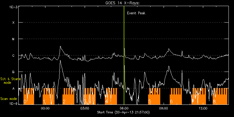 EIS Observation timeline overlay to GOES-Xray curve Code 1" 2" 40" 266" EIS Observations list for this event: STUDY ACRONYM ID DATE OBSERVED DESCRIPTION NOAA# TARGET 0 HH_Flare+AR_180x152 | 33109 | 2013/04/20 22:20:13 | AR 11723 Raster Scan Obs | 1723 | Flare TIMELINE ID DATE OBSERVED FITS FILE XCEN (+W/-E) YCEN (+N/-S) DUR ----------------------------------------------------------------------------------------------------------------- 33109 | 2013/04/20 22:20:13.000 | eis_l0_20130420_222013.fits.gz | 603.64 | -252.79 | 5m17s 33109 | 2013/04/20 22:25:33.000 | eis_l0_20130420_222533.fits.gz | 604.17 | -252.79 | 5m18s 33109 | 2013/04/20 22:30:54.000 | eis_l0_20130420_223054.fits.gz | 604.72 | -252.87 | 5m18s 33109 | 2013/04/20 22:36:15.000 | eis_l0_20130420_223615.fits.gz | 605.26 | -252.95 | 5m18s 33109 | 2013/04/20 22:41:36.000 | eis_l0_20130420_224136.fits.gz | 605.80 | -253.02 | 5m18s 33109 | 2013/04/20 22:46:57.000 | eis_l0_20130420_224657.fits.gz | 606.34 | -252.95 | 5m18s 33109 | 2013/04/20 22:52:18.000 | eis_l0_20130420_225218.fits.gz | 606.88 | -253.10 | 5m17s 33109 | 2013/04/20 22:57:38.000 | eis_l0_20130420_225738.fits.gz | 607.42 | -253.02 | 5m18s 33109 | 2013/04/20 23:02:59.000 | eis_l0_20130420_230259.fits.gz | 608.04 | -253.33 | 5m18s 1 HH_Flare+AR_180x152 | 33108 | 2013/04/20 23:47:41 | AR 11723 Raster Scan Obs | 1723 | Flare TIMELINE ID DATE OBSERVED FITS FILE XCEN (+W/-E) YCEN (+N/-S) DUR ----------------------------------------------------------------------------------------------------------------- 33108 | 2013/04/20 23:47:41.000 | eis_l0_20130420_234741.fits.gz | 612.44 | -253.56 | 5m18s 33108 | 2013/04/20 23:53:02.000 | eis_l0_20130420_235302.fits.gz | 612.98 | -253.56 | 5m18s 33108 | 2013/04/20 23:58:23.000 | eis_l0_20130420_235823.fits.gz | 613.60 | -253.79 | 5m17s 33108 | 2013/04/21 00:03:43.000 | eis_l0_20130421_000343.fits.gz | 613.99 | -253.64 | 5m17s 33108 | 2013/04/21 00:09:03.000 | eis_l0_20130421_000903.fits.gz | 614.60 | -253.87 | 5m19s 33108 | 2013/04/21 00:14:25.000 | eis_l0_20130421_001425.fits.gz | 615.22 | -253.79 | 5m18s 33108 | 2013/04/21 00:19:46.000 | eis_l0_20130421_001946.fits.gz | 615.76 | -254.03 | 5m17s 33108 | 2013/04/21 00:25:06.000 | eis_l0_20130421_002506.fits.gz | 616.23 | -254.03 | 5m19s 33108 | 2013/04/21 00:30:28.000 | eis_l0_20130421_003028.fits.gz | 616.77 | -254.03 | 5m18s 33108 | 2013/04/21 00:35:49.000 | eis_l0_20130421_003549.fits.gz | 617.31 | -254.18 | 5m18s 2 HH_Flare+AR_180x152 | 33105 | 2013/04/21 01:18:43 | AR 11723 Raster Scan Obs | 1723 | Flare TIMELINE ID DATE OBSERVED FITS FILE XCEN (+W/-E) YCEN (+N/-S) DUR ----------------------------------------------------------------------------------------------------------------- 33105 | 2013/04/21 01:18:43.000 | eis_l0_20130421_011843.fits.gz | 621.63 | -254.57 | 5m19s 33105 | 2013/04/21 01:24:05.000 | eis_l0_20130421_012405.fits.gz | 622.02 | -254.57 | 5m18s 33105 | 2013/04/21 01:29:26.000 | eis_l0_20130421_012926.fits.gz | 622.64 | -254.57 | 5m18s 33105 | 2013/04/21 01:34:47.000 | eis_l0_20130421_013447.fits.gz | 623.26 | -254.65 | 5m18s 33105 | 2013/04/21 01:40:08.000 | eis_l0_20130421_014008.fits.gz | 623.64 | -254.65 | 5m18s 33105 | 2013/04/21 01:45:29.000 | eis_l0_20130421_014529.fits.gz | 624.26 | -254.72 | 5m18s 33105 | 2013/04/21 01:50:50.000 | eis_l0_20130421_015050.fits.gz | 624.72 | -254.72 | 5m18s 33105 | 2013/04/21 01:56:11.000 | eis_l0_20130421_015611.fits.gz | 625.26 | -255.03 | 5m18s 33105 | 2013/04/21 02:01:32.000 | eis_l0_20130421_020132.fits.gz | 625.80 | -254.95 | 5m17s 33105 | 2013/04/21 02:06:52.000 | eis_l0_20130421_020652.fits.gz | 626.27 | -255.03 | 5m18s 3 HH_Flare+AR_180x152 | 33106 | 2013/04/21 02:55:13 | AR 11723 Raster Scan Obs | 1723 | Flare TIMELINE ID DATE OBSERVED FITS FILE XCEN (+W/-E) YCEN (+N/-S) DUR ----------------------------------------------------------------------------------------------------------------- 33106 | 2013/04/21 02:55:13.000 | eis_l0_20130421_025513.fits.gz | 631.06 | -255.18 | 5m18s 33106 | 2013/04/21 03:00:34.000 | eis_l0_20130421_030034.fits.gz | 631.60 | -255.49 | 5m19s 33106 | 2013/04/21 03:05:56.000 | eis_l0_20130421_030556.fits.gz | 632.06 | -255.42 | 5m18s 33106 | 2013/04/21 03:11:16.000 | eis_l0_20130421_031116.fits.gz | 632.60 | -255.65 | 5m18s 33106 | 2013/04/21 03:16:37.000 | eis_l0_20130421_031637.fits.gz | 633.22 | -255.65 | 5m18s 33106 | 2013/04/21 03:21:58.000 | eis_l0_20130421_032158.fits.gz | 633.68 | -255.88 | 5m18s 33106 | 2013/04/21 03:27:19.000 | eis_l0_20130421_032719.fits.gz | 634.15 | -255.80 | 5m18s 33106 | 2013/04/21 03:32:40.000 | eis_l0_20130421_033240.fits.gz | 634.61 | -255.96 | 5m17s 33106 | 2013/04/21 03:38:00.000 | eis_l0_20130421_033800.fits.gz | 635.15 | -255.80 | 5m17s 33106 | 2013/04/21 03:43:20.000 | eis_l0_20130421_034320.fits.gz | 635.69 | -255.80 | 5m18s 4 HH_Flare+AR_180x152 | 33107 | 2013/04/21 04:32:43 | AR 11723 Raster Scan Obs | 1723 | Flare TIMELINE ID DATE OBSERVED FITS FILE XCEN (+W/-E) YCEN (+N/-S) DUR ----------------------------------------------------------------------------------------------------------------- 33107 | 2013/04/21 04:32:43.000 | eis_l0_20130421_043243.fits.gz | 640.48 | -256.34 | 5m19s 33107 | 2013/04/21 04:38:05.000 | eis_l0_20130421_043805.fits.gz | 640.95 | -256.34 | 5m17s 33107 | 2013/04/21 04:43:25.000 | eis_l0_20130421_044325.fits.gz | 641.49 | -256.50 | 5m18s 33107 | 2013/04/21 04:48:46.000 | eis_l0_20130421_044846.fits.gz | 642.03 | -256.50 | 5m18s 33107 | 2013/04/21 04:54:07.000 | eis_l0_20130421_045407.fits.gz | 642.57 | -256.65 | 5m18s 33107 | 2013/04/21 04:59:28.000 | eis_l0_20130421_045928.fits.gz | 642.95 | -256.58 | 5m18s 33107 | 2013/04/21 05:04:49.000 | eis_l0_20130421_050449.fits.gz | 643.49 | -256.81 | 5m17s 33107 | 2013/04/21 05:10:09.000 | eis_l0_20130421_051009.fits.gz | 644.11 | -256.96 | 5m18s 33107 | 2013/04/21 05:15:29.000 | eis_l0_20130421_051529.fits.gz | 644.50 | -256.89 | 5m19s 33107 | 2013/04/21 05:20:51.000 | eis_l0_2013042
