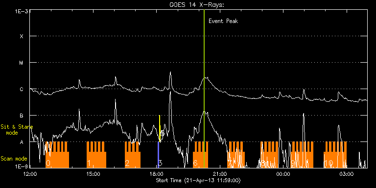 EIS Observation timeline overlay to GOES-Xray curve Code 1" 2" 40" 266" EIS Observations list for this event: STUDY ACRONYM ID DATE OBSERVED DESCRIPTION NOAA# TARGET 0 IUU_SCAN_STEPS_002 | 33093 | 2013/04/21 12:45:13 | AR 11723 Raster Scan Obs | | Active Region TIMELINE ID DATE OBSERVED FITS FILE XCEN (+W/-E) YCEN (+N/-S) DUR ----------------------------------------------------------------------------------------------------------------- 33093 | 2013/04/21 12:45:13.000 | eis_l0_20130421_124513.fits.gz | 678.45 | -261.44 | 5m23s 33093 | 2013/04/21 12:50:40.000 | eis_l0_20130421_125040.fits.gz | 678.91 | -261.44 | 5m23s 33093 | 2013/04/21 12:56:07.000 | eis_l0_20130421_125607.fits.gz | 679.46 | -261.60 | 5m23s 33093 | 2013/04/21 13:01:33.000 | eis_l0_20130421_130133.fits.gz | 679.92 | -261.60 | 5m24s 33093 | 2013/04/21 13:07:00.000 | eis_l0_20130421_130700.fits.gz | 680.46 | -261.75 | 5m24s 33093 | 2013/04/21 13:12:27.000 | eis_l0_20130421_131227.fits.gz | 680.92 | -261.83 | 5m23s 33093 | 2013/04/21 13:17:54.000 | eis_l0_20130421_131754.fits.gz | 681.39 | -261.98 | 5m23s 33093 | 2013/04/21 13:23:20.000 | eis_l0_20130421_132320.fits.gz | 681.93 | -262.06 | 5m24s 33093 | 2013/04/21 13:28:47.000 | eis_l0_20130421_132847.fits.gz | 682.24 | -261.98 | 5m24s 33093 | 2013/04/21 13:34:14.000 | eis_l0_20130421_133414.fits.gz | 682.78 | -262.14 | 5m23s 33093 | 2013/04/21 13:39:41.000 | eis_l0_20130421_133941.fits.gz | 683.16 | -262.06 | 5m23s 33093 | 2013/04/21 13:45:08.000 | eis_l0_20130421_134508.fits.gz | 683.70 | -262.21 | 5m23s 1 IUU_SCAN_STEPS_002 | 33097 | 2013/04/21 14:41:43 | AR 11723 Raster Scan Obs | | Active Region TIMELINE ID DATE OBSERVED FITS FILE XCEN (+W/-E) YCEN (+N/-S) DUR ----------------------------------------------------------------------------------------------------------------- 33097 | 2013/04/21 14:41:43.000 | eis_l0_20130421_144143.fits.gz | 696.48 | -262.68 | 5m24s 33097 | 2013/04/21 14:47:10.000 | eis_l0_20130421_144710.fits.gz | 697.02 | -262.91 | 5m24s 33097 | 2013/04/21 14:52:37.000 | eis_l0_20130421_145237.fits.gz | 697.48 | -263.07 | 5m23s 33097 | 2013/04/21 14:58:04.000 | eis_l0_20130421_145804.fits.gz | 697.87 | -262.99 | 5m23s 33097 | 2013/04/21 15:03:31.000 | eis_l0_20130421_150331.fits.gz | 698.41 | -262.99 | 5m23s 33097 | 2013/04/21 15:08:58.000 | eis_l0_20130421_150858.fits.gz | 698.80 | -262.99 | 5m23s 33097 | 2013/04/21 15:14:24.000 | eis_l0_20130421_151424.fits.gz | 699.26 | -263.22 | 5m24s 33097 | 2013/04/21 15:19:51.000 | eis_l0_20130421_151951.fits.gz | 699.80 | -263.14 | 5m24s 33097 | 2013/04/21 15:25:18.000 | eis_l0_20130421_152518.fits.gz | 700.19 | -263.30 | 5m23s 33097 | 2013/04/21 15:30:44.000 | eis_l0_20130421_153044.fits.gz | 700.65 | -263.30 | 5m24s 2 IUU_SCAN_STEPS_002 | 33098 | 2013/04/21 16:29:43 | AR 11723 Raster Scan Obs | | Active Region TIMELINE ID DATE OBSERVED FITS FILE XCEN (+W/-E) YCEN (+N/-S) DUR ----------------------------------------------------------------------------------------------------------------- 33098 | 2013/04/21 16:29:43.000 | eis_l0_20130421_162943.fits.gz | 705.60 | -263.91 | 5m24s 33098 | 2013/04/21 16:35:10.000 | eis_l0_20130421_163510.fits.gz | 705.98 | -264.15 | 5m24s 33098 | 2013/04/21 16:40:37.000 | eis_l0_20130421_164037.fits.gz | 706.45 | -263.91 | 5m23s 33098 | 2013/04/21 16:46:04.000 | eis_l0_20130421_164604.fits.gz | 706.91 | -264.07 | 5m23s 33098 | 2013/04/21 16:51:31.000 | eis_l0_20130421_165131.fits.gz | 707.37 | -264.15 | 5m23s 33098 | 2013/04/21 16:56:58.000 | eis_l0_20130421_165658.fits.gz | 707.84 | -264.22 | 5m23s 33098 | 2013/04/21 17:02:25.000 | eis_l0_20130421_170225.fits.gz | 708.30 | -264.38 | 5m23s 33098 | 2013/04/21 17:07:52.000 | eis_l0_20130421_170752.fits.gz | 708.84 | -264.53 | 5m23s 3 PRY_slot_contextLITE | 33083 | 2013/04/21 18:03:20 | EIS AIA alignment | | Active Region TIMELINE ID DATE OBSERVED FITS FILE XCEN (+W/-E) YCEN (+N/-S) DUR ----------------------------------------------------------------------------------------------------------------- 33083 | 2013/04/21 18:03:20.000 | eis_l0_20130421_180320.fits.gz | -15.29 | -0.35 | 2m56s 4 Alignment_266 | 33084 | 2013/04/21 18:07:06 | EIS AIA alignment | | Quiet Sun TIMELINE ID DATE OBSERVED FITS FILE XCEN (+W/-E) YCEN (+N/-S) DUR ----------------------------------------------------------------------------------------------------------------- 33084 | 2013/04/21 18:07:06.000 | eis_l0_20130421_180706.fits.gz | -132.64 | -0.42 | 1m22s 5 XRT_synop_AIA | 33085 | 2013/04/21 18:10:03 | EIS AIA alignment | | Quiet Sun TIMELINE ID DATE OBSERVED FITS FILE XCEN (+W/-E) YCEN (+N/-S) DUR ----------------------------------------------------------------------------------------------------------------- 33085 | 2013/04/21 18:10:03.000 | eis_l0_20130421_181003.fits.gz | -132.49 | -0.58 | 10s 6 HH_Flare+AR_180x152 | 33104 | 2013/04/21 19:43:19 | AR 11723 Raster Scan Obs | 1723 | Flare TIMELINE ID DATE OBSERVED FITS FILE XCEN (+W/-E) YCEN (+N/-S) DUR ----------------------------------------------------------------------------------------------------------------- 33104 | 2013/04/21 19:43:19.000 | eis_l0_20130421_194319.fits.gz | 720.28 | -266.08 | 5m19s 33104 | 2013/04/21 19:48:41.000 | eis_l0_20130421_194841.fits.gz | 720.66 | -266.00 | 5m18s 33104 | 2013/04/21 19:54:01.000 | eis_l0_20130421_195401.fits.gz | 721.05 | -266.15 | 5m19s 33104 | 2013/04/21 19:59:23.000 | eis_l0_20130421_195923.fits.gz | 721.52 | -266.15 | 5m18s 33104 | 2013/04/21 20:04:44.000 | eis_l0_20130421_200444.fits.gz | 721.90 | -266.39 | 5m17s 33104 | 2013/04/21 20:10:04.000 | eis_l0_20130421_201004.fits.gz | 722.44 | -266.39 | 5m18s 33104 | 2013/04/21 20:15:24.000 | eis_l0_20130421_201524.fits.gz | 722.75 | -266.23 | 5m19s 33104 | 2013/04/21 20:20:45.000 | eis_l0_20130421_202045.fits.gz | 723.14 | -266.62 | 5m18s 7 HH_Flare+AR_180x152 | 33103 | 2013/04/21 21:21:10 | AR 11723 Raster Scan Obs | 1723 | Flare TIMELINE ID DATE OBSERVED FITS FILE XCEN (+W/-E) YCEN (+N/-S) DUR ---------------