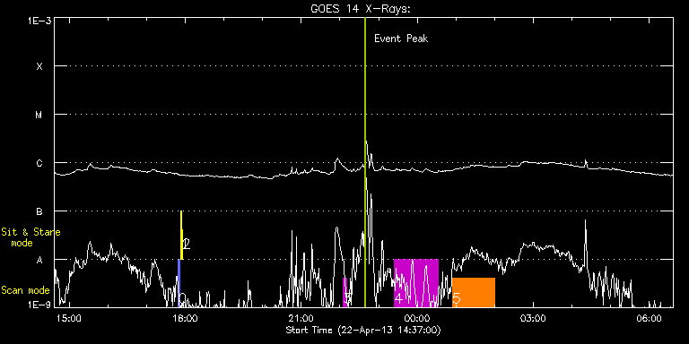 EIS Observation timeline overlay to GOES-Xray curve Code 1" 2" 40" 266" EIS Observations list for this event: STUDY ACRONYM ID DATE OBSERVED DESCRIPTION NOAA# TARGET 0 PRY_slot_contextLITE | 33086 | 2013/04/22 17:49:19 | EIS AIA alignment | | Active Region TIMELINE ID DATE OBSERVED FITS FILE XCEN (+W/-E) YCEN (+N/-S) DUR ----------------------------------------------------------------------------------------------------------------- 33086 | 2013/04/22 17:49:19.000 | eis_l0_20130422_174919.fits.gz | -15.29 | -0.35 | 2m56s 1 Alignment_266 | 33087 | 2013/04/22 17:53:06 | EIS AIA alignment | | Quiet Sun TIMELINE ID DATE OBSERVED FITS FILE XCEN (+W/-E) YCEN (+N/-S) DUR ----------------------------------------------------------------------------------------------------------------- 33087 | 2013/04/22 17:53:06.000 | eis_l0_20130422_175306.fits.gz | -132.64 | -0.50 | 1m22s 2 XRT_synop_AIA | 33088 | 2013/04/22 17:55:35 | EIS AIA alignment | | Quiet Sun TIMELINE ID DATE OBSERVED FITS FILE XCEN (+W/-E) YCEN (+N/-S) DUR ----------------------------------------------------------------------------------------------------------------- 33088 | 2013/04/22 17:55:35.000 | eis_l0_20130422_175535.fits.gz | -132.41 | -0.58 | 11s 3 VHH_SlowAR_5m_V2 | 33092 | 2013/04/22 22:05:33 | Active Region Studies - returning AR ( | | Active Region TIMELINE ID DATE OBSERVED FITS FILE XCEN (+W/-E) YCEN (+N/-S) DUR ----------------------------------------------------------------------------------------------------------------- 33092 | 2013/04/22 22:05:33.000 | eis_l0_20130422_220533.fits.gz | -559.42 | 341.78 | 4m43s 4 VHH_SlowAR_1h12_V2 | 33091 | 2013/04/22 23:24:12 | Active Region Studies - returning AR ( | | Active Region TIMELINE ID DATE OBSERVED FITS FILE XCEN (+W/-E) YCEN (+N/-S) DUR ----------------------------------------------------------------------------------------------------------------- 33091 | 2013/04/22 23:24:12.000 | eis_l0_20130422_232412.fits.gz | -535.25 | 342.17 | 1h8m5s 5 DHB_006 | 33090 | 2013/04/23 00:54:26 | Active Region Studies - returning AR ( | | Active Region TIMELINE ID DATE OBSERVED FITS FILE XCEN (+W/-E) YCEN (+N/-S) DUR ----------------------------------------------------------------------------------------------------------------- 33090 | 2013/04/23 00:54:26.000 | eis_l0_20130423_005426.fits.gz | -525.25 | 342.87 | 1h5m22s : Check study information : Download file : View thumbnails For this event, also check for: