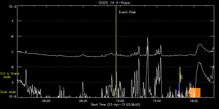 EIS Observation timeline overlay to GOES-Xray curve Code 1" 2" 40" 266" EIS Observations list for this event: STUDY ACRONYM ID DATE OBSERVED DESCRIPTION NOAA# TARGET 0 PRY_slot_contextLITE | 33117 | 2013/04/23 16:47:20 | EIS AIA alignment | 1729 | Active Region TIMELINE ID DATE OBSERVED FITS FILE XCEN (+W/-E) YCEN (+N/-S) DUR ----------------------------------------------------------------------------------------------------------------- 33117 | 2013/04/23 16:47:20.000 | eis_l0_20130423_164720.fits.gz | -15.21 | -0.50 | 2m56s 1 Alignment_266 | 33118 | 2013/04/23 16:51:07 | EIS AIA alignment | | Quiet Sun TIMELINE ID DATE OBSERVED FITS FILE XCEN (+W/-E) YCEN (+N/-S) DUR ----------------------------------------------------------------------------------------------------------------- 33118 | 2013/04/23 16:51:07.000 | eis_l0_20130423_165107.fits.gz | -132.57 | -0.35 | 1m22s 2 XRT_synop_AIA | 33119 | 2013/04/23 16:54:03 | EIS AIA alignment | | Quiet Sun TIMELINE ID DATE OBSERVED FITS FILE XCEN (+W/-E) YCEN (+N/-S) DUR ----------------------------------------------------------------------------------------------------------------- 33119 | 2013/04/23 16:54:03.000 | eis_l0_20130423_165403.fits.gz | -132.49 | -0.42 | 11s 3 EUNIS_EIS_CrossCal | 33120 | 2013/04/23 17:37:50 | EUNIS/EIS Coordinated observations | 1726 | Quiet Sun TIMELINE ID DATE OBSERVED FITS FILE XCEN (+W/-E) YCEN (+N/-S) DUR ----------------------------------------------------------------------------------------------------------------- 33120 | 2013/04/23 17:37:50.000 | eis_l0_20130423_173750.fits.gz | 671.54 | 235.88 | 52m45s : Check study information : Download file : View thumbnails For this event, also check for: