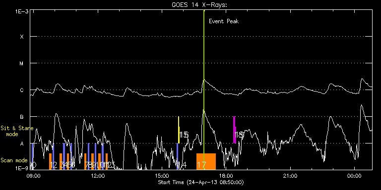 EIS Observation timeline overlay to GOES-Xray curve Code 1" 2" 40" 266" EIS Observations list for this event: STUDY ACRONYM ID DATE OBSERVED DESCRIPTION NOAA# TARGET 0 PRY_slot_contextLITE | 33135 | 2013/04/24 08:55:19 | HOP 79 - Synoptic SOT Irradiance Scans | 1729 | Active Region TIMELINE ID DATE OBSERVED FITS FILE XCEN (+W/-E) YCEN (+N/-S) DUR ----------------------------------------------------------------------------------------------------------------- 33135 | 2013/04/24 08:55:19.000 | eis_l0_20130424_085519.fits.gz | 475.77 | -20.51 | 2m57s 1 SK_DEEP_10x512_SLIT2 | 33136 | 2013/04/24 09:44:03 | HOP 79 - Synoptic SOT Irradiance Scans | | Quiet Sun TIMELINE ID DATE OBSERVED FITS FILE XCEN (+W/-E) YCEN (+N/-S) DUR ----------------------------------------------------------------------------------------------------------------- 33136 | 2013/04/24 09:44:03.000 | eis_l0_20130424_094403.fits.gz | 689.66 | -20.66 | 5m8s 2 PRY_slot_contextLITE | 33137 | 2013/04/24 09:53:49 | HOP 79 - Synoptic SOT Irradiance Scans | | Active Region TIMELINE ID DATE OBSERVED FITS FILE XCEN (+W/-E) YCEN (+N/-S) DUR ----------------------------------------------------------------------------------------------------------------- 33137 | 2013/04/24 09:53:49.000 | eis_l0_20130424_095349.fits.gz | 873.75 | -20.58 | 2m57s 3 SK_DEEP_10x512_SLIT2 | 33138 | 2013/04/24 10:14:03 | HOP 79 - Synoptic SOT Irradiance Scans | | Quiet Sun TIMELINE ID DATE OBSERVED FITS FILE XCEN (+W/-E) YCEN (+N/-S) DUR ----------------------------------------------------------------------------------------------------------------- 33138 | 2013/04/24 10:14:03.000 | eis_l0_20130424_101403.fits.gz | -9869.95 | -9963.20 | 5m8s 4 PRY_slot_contextLITE | 33139 | 2013/04/24 10:23:50 | HOP 79 - Synoptic SOT Irradiance Scans | 1728 | Active Region TIMELINE ID DATE OBSERVED FITS FILE XCEN (+W/-E) YCEN (+N/-S) DUR ----------------------------------------------------------------------------------------------------------------- 33139 | 2013/04/24 10:23:50.000 | eis_l0_20130424_102350.fits.gz | -752.16 | 275.82 | 2m56s 5 SK_DEEP_10x512_SLIT2 | 33140 | 2013/04/24 10:34:03 | HOP 79 - Synoptic SOT Irradiance Scans | | Quiet Sun TIMELINE ID DATE OBSERVED FITS FILE XCEN (+W/-E) YCEN (+N/-S) DUR ----------------------------------------------------------------------------------------------------------------- 33140 | 2013/04/24 10:34:03.000 | eis_l0_20130424_103403.fits.gz | -553.41 | 290.65 | 5m8s 6 PRY_slot_contextLITE | 33141 | 2013/04/24 10:43:49 | HOP 79 - Synoptic SOT Irradiance Scans | | Active Region TIMELINE ID DATE OBSERVED FITS FILE XCEN (+W/-E) YCEN (+N/-S) DUR ----------------------------------------------------------------------------------------------------------------- 33141 | 2013/04/24 10:43:49.000 | eis_l0_20130424_104349.fits.gz | -380.21 | 299.38 | 2m57s 7 SK_DEEP_10x512_SLIT2 | 33142 | 2013/04/24 11:22:33 | HOP 79 - Synoptic SOT Irradiance Scans | | Quiet Sun TIMELINE ID DATE OBSERVED FITS FILE XCEN (+W/-E) YCEN (+N/-S) DUR ----------------------------------------------------------------------------------------------------------------- 33142 | 2013/04/24 11:22:33.000 | eis_l0_20130424_112233.fits.gz | -174.28 | 304.32 | 5m8s 8 PRY_slot_contextLITE | 33143 | 2013/04/24 11:32:19 | HOP 79 - Synoptic SOT Irradiance Scans | 1727 | Active Region TIMELINE ID DATE OBSERVED FITS FILE XCEN (+W/-E) YCEN (+N/-S) DUR ----------------------------------------------------------------------------------------------------------------- 33143 | 2013/04/24 11:32:19.000 | eis_l0_20130424_113219.fits.gz | 4.95 | 305.55 | 2m57s 9 SK_DEEP_10x512_SLIT2 | 33144 | 2013/04/24 11:42:33 | HOP 79 - Synoptic SOT Irradiance Scans | | Quiet Sun TIMELINE ID DATE OBSERVED FITS FILE XCEN (+W/-E) YCEN (+N/-S) DUR ----------------------------------------------------------------------------------------------------------------- 33144 | 2013/04/24 11:42:33.000 | eis_l0_20130424_114233.fits.gz | 143.44 | 304.40 | 5m8s 10 PRY_slot_contextLITE | 33145 | 2013/04/24 11:52:19 | HOP 79 - Synoptic SOT Irradiance Scans | 1727 | Active Region TIMELINE ID DATE OBSERVED FITS FILE XCEN (+W/-E) YCEN (+N/-S) DUR ----------------------------------------------------------------------------------------------------------------- 33145 | 2013/04/24 11:52:19.000 | eis_l0_20130424_115219.fits.gz | 319.96 | 299.30 | 2m57s 11 SK_DEEP_10x512_SLIT2 | 33146 | 2013/04/24 12:02:33 | HOP 79 - Synoptic SOT Irradiance Scans | | Quiet Sun TIMELINE ID DATE OBSERVED FITS FILE XCEN (+W/-E) YCEN (+N/-S) DUR ----------------------------------------------------------------------------------------------------------------- 33146 | 2013/04/24 12:02:33.000 | eis_l0_20130424_120233.fits.gz | 522.57 | 290.42 | 5m8s 12 PRY_slot_contextLITE | 33147 | 2013/04/24 12:12:19 | HOP 79 - Synoptic SOT Irradiance Scans | 1726 | Active Region TIMELINE ID DATE OBSERVED FITS FILE XCEN (+W/-E) YCEN (+N/-S) DUR ----------------------------------------------------------------------------------------------------------------- 33147 | 2013/04/24 12:12:19.000 | eis_l0_20130424_121219.fits.gz | 691.84 | 275.58 | 2m57s 13 SK_DEEP_10x512_SLIT2 | 33148 | 2013/04/24 12:22:33 | HOP 79 - Synoptic SOT Irradiance Scans | | Quiet Sun TIMELINE ID DATE OBSERVED FITS FILE XCEN (+W/-E) YCEN (+N/-S) DUR ----------------------------------------------------------------------------------------------------------------- 33148 | 2013/04/24 12:22:33.000 | eis_l0_20130424_122233.fits.gz | 895.52 | 214.40 | 5m8s 14 PRY_slot_contextLITE | 33152 | 2013/04/24 15:42:19 | EIS AIA alignment | 1729 | Active Region TIMELINE ID DATE OBSERVED FITS FILE XCEN (+W/-E) YCEN (+N/-S) DUR ----------------------------------------------------------------------------------------------------------------- 33152 | 2013/04/24 15:42:19.000 | eis_l0_20130424_154219.fits.gz | -15.29 | -0.50 | 2m57s 15 Alignment_266 | 33153 | 2013/04/24 15:46:06 | EIS AIA alignment | | Quiet Sun TIMELINE ID DATE OBSERVE