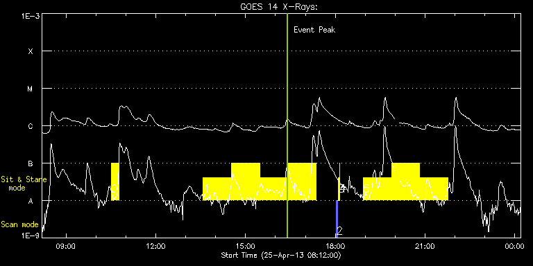 EIS Observation timeline overlay to GOES-Xray curve Code 1" 2" 40" 266" EIS Observations list for this event: STUDY ACRONYM ID DATE OBSERVED DESCRIPTION NOAA# TARGET 0 FLARE266_TEST2 | 33190 | 2013/04/25 10:30:34 | XRT Flare Trigger obs (AR 11726) | | Active Region TIMELINE ID DATE OBSERVED FITS FILE XCEN (+W/-E) YCEN (+N/-S) DUR ----------------------------------------------------------------------------------------------------------------- 33190 | 2013/04/25 10:30:34.000 | eis_l0_20130425_103034.fits.gz | 678.92 | 235.26 | 16m11s 1 FLARE266_TEST2 | 33191 | 2013/04/25 13:35:27 | XRT Flare Trigger obs (AR 11726) | 1726 | Active Region TIMELINE ID DATE OBSERVED FITS FILE XCEN (+W/-E) YCEN (+N/-S) DUR ----------------------------------------------------------------------------------------------------------------- 33191 | 2013/04/25 13:35:27.000 | eis_l0_20130425_133527.fits.gz | 692.21 | 233.10 | 56m 33191 | 2013/04/25 14:32:19.000 | eis_l0_20130425_143219.fits.gz | 696.22 | 232.17 | 56m 33191 | 2013/04/25 15:29:10.000 | eis_l0_20130425_152910.fits.gz | 700.01 | 231.71 | 56m1s 33191 | 2013/04/25 16:26:02.000 | eis_l0_20130425_162602.fits.gz | 703.87 | 231.01 | 56m 2 PRY_slot_contextLITE | 33155 | 2013/04/25 18:01:57 | EIS AIA alignment | | Active Region TIMELINE ID DATE OBSERVED FITS FILE XCEN (+W/-E) YCEN (+N/-S) DUR ----------------------------------------------------------------------------------------------------------------- 33155 | 2013/04/25 18:01:57.000 | eis_l0_20130425_180157.fits.gz | -15.29 | -0.50 | 2m56s 3 Alignment_266 | 33156 | 2013/04/25 18:05:37 | EIS AIA alignment | | Quiet Sun TIMELINE ID DATE OBSERVED FITS FILE XCEN (+W/-E) YCEN (+N/-S) DUR ----------------------------------------------------------------------------------------------------------------- 33156 | 2013/04/25 18:05:37.000 | eis_l0_20130425_180537.fits.gz | -132.49 | -0.50 | 1m22s 4 XRT_synop_AIA | 33157 | 2013/04/25 18:08:34 | EIS AIA alignment | | Quiet Sun TIMELINE ID DATE OBSERVED FITS FILE XCEN (+W/-E) YCEN (+N/-S) DUR ----------------------------------------------------------------------------------------------------------------- 33157 | 2013/04/25 18:08:34.000 | eis_l0_20130425_180834.fits.gz | -132.49 | -0.50 | 10s 5 FLARE266_TEST2 | 33192 | 2013/04/25 18:55:44 | XRT Flare Trigger obs (AR 11726) | 1726 | Active Region TIMELINE ID DATE OBSERVED FITS FILE XCEN (+W/-E) YCEN (+N/-S) DUR ----------------------------------------------------------------------------------------------------------------- 33192 | 2013/04/25 18:55:44.000 | eis_l0_20130425_185544.fits.gz | 713.53 | 229.16 | 56m 33192 | 2013/04/25 19:52:36.000 | eis_l0_20130425_195236.fits.gz | 717.16 | 228.54 | 55m59s 33192 | 2013/04/25 20:49:27.000 | eis_l0_20130425_204927.fits.gz | 720.64 | 227.84 | 56m1s : Check study information : Download file : View thumbnails For this event, also check for: