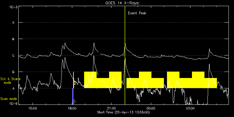 EIS Observation timeline overlay to GOES-Xray curve Code 1" 2" 40" 266" EIS Observations list for this event: STUDY ACRONYM ID DATE OBSERVED DESCRIPTION NOAA# TARGET 0 PRY_slot_contextLITE | 33155 | 2013/04/25 18:01:57 | EIS AIA alignment | | Active Region TIMELINE ID DATE OBSERVED FITS FILE XCEN (+W/-E) YCEN (+N/-S) DUR ----------------------------------------------------------------------------------------------------------------- 33155 | 2013/04/25 18:01:57.000 | eis_l0_20130425_180157.fits.gz | -15.29 | -0.50 | 2m56s 1 Alignment_266 | 33156 | 2013/04/25 18:05:37 | EIS AIA alignment | | Quiet Sun TIMELINE ID DATE OBSERVED FITS FILE XCEN (+W/-E) YCEN (+N/-S) DUR ----------------------------------------------------------------------------------------------------------------- 33156 | 2013/04/25 18:05:37.000 | eis_l0_20130425_180537.fits.gz | -132.49 | -0.50 | 1m22s 2 XRT_synop_AIA | 33157 | 2013/04/25 18:08:34 | EIS AIA alignment | | Quiet Sun TIMELINE ID DATE OBSERVED FITS FILE XCEN (+W/-E) YCEN (+N/-S) DUR ----------------------------------------------------------------------------------------------------------------- 33157 | 2013/04/25 18:08:34.000 | eis_l0_20130425_180834.fits.gz | -132.49 | -0.50 | 10s 3 FLARE266_TEST2 | 33192 | 2013/04/25 18:55:44 | XRT Flare Trigger obs (AR 11726) | 1726 | Active Region TIMELINE ID DATE OBSERVED FITS FILE XCEN (+W/-E) YCEN (+N/-S) DUR ----------------------------------------------------------------------------------------------------------------- 33192 | 2013/04/25 18:55:44.000 | eis_l0_20130425_185544.fits.gz | 713.53 | 229.16 | 56m 33192 | 2013/04/25 19:52:36.000 | eis_l0_20130425_195236.fits.gz | 717.16 | 228.54 | 55m59s 33192 | 2013/04/25 20:49:27.000 | eis_l0_20130425_204927.fits.gz | 720.64 | 227.84 | 56m1s 4 FLARE266_TEST2 | 33193 | 2013/04/25 22:09:14 | XRT Flare Trigger obs (AR 11726) | 1726 | Active Region TIMELINE ID DATE OBSERVED FITS FILE XCEN (+W/-E) YCEN (+N/-S) DUR ----------------------------------------------------------------------------------------------------------------- 33193 | 2013/04/25 22:09:14.000 | eis_l0_20130425_220914.fits.gz | 761.42 | 209.23 | 56m 33193 | 2013/04/25 23:06:06.000 | eis_l0_20130425_230606.fits.gz | 761.27 | 209.38 | 56m 33193 | 2013/04/26 00:02:57.000 | eis_l0_20130426_000257.fits.gz | 761.34 | 209.30 | 56m1s 5 FLARE266_TEST2 | 33194 | 2013/04/26 01:14:13 | XRT Flare Trigger obs (AR 11726) | | Active Region TIMELINE ID DATE OBSERVED FITS FILE XCEN (+W/-E) YCEN (+N/-S) DUR ----------------------------------------------------------------------------------------------------------------- 33194 | 2013/04/26 01:14:13.000 | eis_l0_20130426_011413.fits.gz | 761.34 | 209.38 | 56m1s 33194 | 2013/04/26 02:11:06.000 | eis_l0_20130426_021106.fits.gz | 761.34 | 209.38 | 56m 33194 | 2013/04/26 03:07:58.000 | eis_l0_20130426_030758.fits.gz | 761.27 | 209.30 | 56m 33194 | 2013/04/26 04:04:50.000 | eis_l0_20130426_040450.fits.gz | 761.27 | 209.38 | 56m : Check study information : Download file : View thumbnails For this event, also check for: