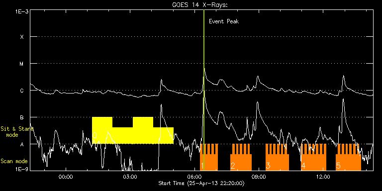 EIS Observation timeline overlay to GOES-Xray curve Code 1" 2" 40" 266" EIS Observations list for this event: STUDY ACRONYM ID DATE OBSERVED DESCRIPTION NOAA# TARGET 0 FLARE266_TEST2 | 33194 | 2013/04/26 01:14:13 | XRT Flare Trigger obs (AR 11726) | | Active Region TIMELINE ID DATE OBSERVED FITS FILE XCEN (+W/-E) YCEN (+N/-S) DUR ----------------------------------------------------------------------------------------------------------------- 33194 | 2013/04/26 01:14:13.000 | eis_l0_20130426_011413.fits.gz | 761.34 | 209.38 | 56m1s 33194 | 2013/04/26 02:11:06.000 | eis_l0_20130426_021106.fits.gz | 761.34 | 209.38 | 56m 33194 | 2013/04/26 03:07:58.000 | eis_l0_20130426_030758.fits.gz | 761.27 | 209.30 | 56m 33194 | 2013/04/26 04:04:50.000 | eis_l0_20130426_040450.fits.gz | 761.27 | 209.38 | 56m 1 HH_Flare+AR_180x152 | 33182 | 2013/04/26 06:15:50 | AR 11726 Raster Scan Obs | 1726 | Flare TIMELINE ID DATE OBSERVED FITS FILE XCEN (+W/-E) YCEN (+N/-S) DUR ----------------------------------------------------------------------------------------------------------------- 33182 | 2013/04/26 06:15:50.000 | eis_l0_20130426_061550.fits.gz | 891.77 | 209.46 | 5m18s 33182 | 2013/04/26 06:21:10.000 | eis_l0_20130426_062110.fits.gz | 891.61 | 209.38 | 5m18s 33182 | 2013/04/26 06:26:30.000 | eis_l0_20130426_062630.fits.gz | 891.61 | 209.38 | 5m19s 33182 | 2013/04/26 06:31:51.000 | eis_l0_20130426_063151.fits.gz | 891.53 | 209.46 | 5m19s 33182 | 2013/04/26 06:37:12.000 | eis_l0_20130426_063712.fits.gz | 891.53 | 209.46 | 5m19s 33182 | 2013/04/26 06:42:33.000 | eis_l0_20130426_064233.fits.gz | 891.53 | 209.38 | 5m18s 33182 | 2013/04/26 06:47:54.000 | eis_l0_20130426_064754.fits.gz | 891.53 | 209.46 | 5m18s 33182 | 2013/04/26 06:53:15.000 | eis_l0_20130426_065315.fits.gz | 891.61 | 209.38 | 5m17s 33182 | 2013/04/26 06:58:35.000 | eis_l0_20130426_065835.fits.gz | 891.53 | 209.46 | 5m19s 2 HH_Flare+AR_180x152 | 33183 | 2013/04/26 07:40:43 | AR 11726 Raster Scan Obs | 1726 | Flare TIMELINE ID DATE OBSERVED FITS FILE XCEN (+W/-E) YCEN (+N/-S) DUR ----------------------------------------------------------------------------------------------------------------- 33183 | 2013/04/26 07:40:43.000 | eis_l0_20130426_074043.fits.gz | 891.53 | 209.46 | 5m18s 33183 | 2013/04/26 07:46:04.000 | eis_l0_20130426_074604.fits.gz | 891.53 | 209.30 | 5m18s 33183 | 2013/04/26 07:51:25.000 | eis_l0_20130426_075125.fits.gz | 891.61 | 209.38 | 5m19s 33183 | 2013/04/26 07:56:46.000 | eis_l0_20130426_075646.fits.gz | 891.69 | 209.30 | 5m18s 33183 | 2013/04/26 08:02:07.000 | eis_l0_20130426_080207.fits.gz | 891.53 | 209.38 | 5m18s 33183 | 2013/04/26 08:07:28.000 | eis_l0_20130426_080728.fits.gz | 891.53 | 209.30 | 5m17s 33183 | 2013/04/26 08:12:48.000 | eis_l0_20130426_081248.fits.gz | 891.53 | 209.38 | 5m17s 33183 | 2013/04/26 08:18:08.000 | eis_l0_20130426_081808.fits.gz | 891.61 | 209.38 | 5m18s 33183 | 2013/04/26 08:23:29.000 | eis_l0_20130426_082329.fits.gz | 891.69 | 209.38 | 5m18s 33183 | 2013/04/26 08:28:50.000 | eis_l0_20130426_082850.fits.gz | 891.61 | 209.38 | 5m17s 33183 | 2013/04/26 08:34:10.000 | eis_l0_20130426_083410.fits.gz | 891.61 | 209.46 | 5m18s 3 HH_Flare+AR_180x152 | 33184 | 2013/04/26 09:19:13 | AR 11726 Raster Scan Obs | 1726 | Flare TIMELINE ID DATE OBSERVED FITS FILE XCEN (+W/-E) YCEN (+N/-S) DUR ----------------------------------------------------------------------------------------------------------------- 33184 | 2013/04/26 09:19:13.000 | eis_l0_20130426_091913.fits.gz | 891.61 | 209.23 | 5m19s 33184 | 2013/04/26 09:24:34.000 | eis_l0_20130426_092434.fits.gz | 891.53 | 209.30 | 5m18s 33184 | 2013/04/26 09:29:55.000 | eis_l0_20130426_092955.fits.gz | 891.61 | 209.38 | 5m17s 33184 | 2013/04/26 09:35:15.000 | eis_l0_20130426_093515.fits.gz | 891.61 | 209.30 | 5m18s 33184 | 2013/04/26 09:40:36.000 | eis_l0_20130426_094036.fits.gz | 891.61 | 209.30 | 5m18s 33184 | 2013/04/26 09:45:57.000 | eis_l0_20130426_094557.fits.gz | 891.61 | 209.30 | 5m18s 33184 | 2013/04/26 09:51:18.000 | eis_l0_20130426_095118.fits.gz | 891.46 | 209.38 | 5m19s 33184 | 2013/04/26 09:56:39.000 | eis_l0_20130426_095639.fits.gz | 891.53 | 209.46 | 5m18s 33184 | 2013/04/26 10:02:00.000 | eis_l0_20130426_100200.fits.gz | 891.53 | 209.46 | 5m18s 33184 | 2013/04/26 10:07:21.000 | eis_l0_20130426_100721.fits.gz | 891.61 | 209.38 | 5m17s 33184 | 2013/04/26 10:12:41.000 | eis_l0_20130426_101241.fits.gz | 891.61 | 209.38 | 5m18s 33184 | 2013/04/26 10:18:02.000 | eis_l0_20130426_101802.fits.gz | 891.69 | 209.38 | 5m19s 4 HH_Flare+AR_180x152 | 33185 | 2013/04/26 10:57:43 | AR 11726 Raster Scan Obs | 1726 | Flare TIMELINE ID DATE OBSERVED FITS FILE XCEN (+W/-E) YCEN (+N/-S) DUR ----------------------------------------------------------------------------------------------------------------- 33185 | 2013/04/26 10:57:43.000 | eis_l0_20130426_105743.fits.gz | 891.53 | 209.30 | 5m18s 33185 | 2013/04/26 11:03:04.000 | eis_l0_20130426_110304.fits.gz | 891.53 | 209.38 | 5m18s 33185 | 2013/04/26 11:08:25.000 | eis_l0_20130426_110825.fits.gz | 891.69 | 209.38 | 5m17s 33185 | 2013/04/26 11:13:45.000 | eis_l0_20130426_111345.fits.gz | 891.53 | 209.46 | 5m18s 33185 | 2013/04/26 11:19:06.000 | eis_l0_20130426_111906.fits.gz | 891.61 | 209.23 | 5m18s 33185 | 2013/04/26 11:24:27.000 | eis_l0_20130426_112427.fits.gz | 891.53 | 209.54 | 5m17s 33185 | 2013/04/26 11:29:47.000 | eis_l0_20130426_112947.fits.gz | 891.53 | 209.38 | 5m18s 33185 | 2013/04/26 11:35:08.000 | eis_l0_20130426_113508.fits.gz | 891.61 | 209.38 | 5m19s 33185 | 2013/04/26 11:40:30.000 | eis_l0_20130426_114030.fits.gz | 891.61 | 209.46 | 5m17s 33185 | 2013/04/26 11:45:50.000 | eis_l0_20130426_114550.fits.gz | 891.61 | 209.46 | 5m18s 33185 | 2013/04/26 11:51:11.000 | eis_l0_20130426_115111.fits.gz | 891.61 | 209.38 | 5m17s 33185 | 2013/04/26 11:56:31.000 | eis_l0_20130426_115631.fits.gz | 891.61 | 209.46 | 5m18s 33185 | 2013/04/26 12:01:51.000 | eis_l0_20130426_120151.fits.gz | 891.61 | 209.30 | 5m18s 5 HH_