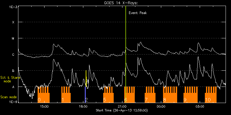 EIS Observation timeline overlay to GOES-Xray curve Code 1" 2" 40" 266" EIS Observations list for this event: STUDY ACRONYM ID DATE OBSERVED DESCRIPTION NOAA# TARGET 0 HH_Flare+AR_180x152 | 33174 | 2013/04/26 14:29:43 | AR 11726 Raster Scan Obs | 1726 | Flare TIMELINE ID DATE OBSERVED FITS FILE XCEN (+W/-E) YCEN (+N/-S) DUR ----------------------------------------------------------------------------------------------------------------- 33174 | 2013/04/26 14:29:43.000 | eis_l0_20130426_142943.fits.gz | 891.69 | 209.30 | 5m18s 33174 | 2013/04/26 14:35:04.000 | eis_l0_20130426_143504.fits.gz | 891.61 | 209.46 | 5m18s 33174 | 2013/04/26 14:40:24.000 | eis_l0_20130426_144024.fits.gz | 891.61 | 209.46 | 5m18s 33174 | 2013/04/26 14:45:45.000 | eis_l0_20130426_144545.fits.gz | 891.53 | 209.30 | 5m18s 33174 | 2013/04/26 14:51:05.000 | eis_l0_20130426_145105.fits.gz | 891.53 | 209.38 | 5m19s 33174 | 2013/04/26 14:56:27.000 | eis_l0_20130426_145627.fits.gz | 891.61 | 209.30 | 5m18s 33174 | 2013/04/26 15:01:48.000 | eis_l0_20130426_150148.fits.gz | 891.61 | 209.30 | 5m18s 33174 | 2013/04/26 15:07:09.000 | eis_l0_20130426_150709.fits.gz | 891.69 | 209.38 | 5m18s 33174 | 2013/04/26 15:12:30.000 | eis_l0_20130426_151230.fits.gz | 891.61 | 209.46 | 5m17s 33174 | 2013/04/26 15:17:50.000 | eis_l0_20130426_151750.fits.gz | 891.61 | 209.38 | 5m18s 1 HH_Flare+AR_180x152 | 33173 | 2013/04/26 16:18:43 | AR 11726 Raster Scan Obs | 1726 | Flare TIMELINE ID DATE OBSERVED FITS FILE XCEN (+W/-E) YCEN (+N/-S) DUR ----------------------------------------------------------------------------------------------------------------- 33173 | 2013/04/26 16:18:43.000 | eis_l0_20130426_161843.fits.gz | 891.61 | 209.30 | 5m18s 33173 | 2013/04/26 16:24:04.000 | eis_l0_20130426_162404.fits.gz | 891.53 | 209.30 | 5m18s 33173 | 2013/04/26 16:29:25.000 | eis_l0_20130426_162925.fits.gz | 891.61 | 209.38 | 5m18s 33173 | 2013/04/26 16:34:46.000 | eis_l0_20130426_163446.fits.gz | 891.61 | 209.38 | 5m19s 33173 | 2013/04/26 16:40:07.000 | eis_l0_20130426_164007.fits.gz | 891.53 | 209.54 | 5m18s 33173 | 2013/04/26 16:45:28.000 | eis_l0_20130426_164528.fits.gz | 891.61 | 209.38 | 5m18s 33173 | 2013/04/26 16:50:49.000 | eis_l0_20130426_165049.fits.gz | 891.61 | 209.38 | 5m18s 33173 | 2013/04/26 16:56:10.000 | eis_l0_20130426_165610.fits.gz | 891.61 | 209.46 | 5m18s 2 PRY_slot_contextLITE | 33158 | 2013/04/26 18:08:20 | EIS AIA alignment | | Active Region TIMELINE ID DATE OBSERVED FITS FILE XCEN (+W/-E) YCEN (+N/-S) DUR ----------------------------------------------------------------------------------------------------------------- 33158 | 2013/04/26 18:08:20.000 | eis_l0_20130426_180820.fits.gz | -15.29 | -0.50 | 2m56s 3 Alignment_266 | 33159 | 2013/04/26 18:12:06 | EIS AIA alignment | | Quiet Sun TIMELINE ID DATE OBSERVED FITS FILE XCEN (+W/-E) YCEN (+N/-S) DUR ----------------------------------------------------------------------------------------------------------------- 33159 | 2013/04/26 18:12:06.000 | eis_l0_20130426_181206.fits.gz | -132.49 | -0.65 | 1m22s 4 XRT_synop_AIA | 33160 | 2013/04/26 18:14:36 | EIS AIA alignment | | Quiet Sun TIMELINE ID DATE OBSERVED FITS FILE XCEN (+W/-E) YCEN (+N/-S) DUR ----------------------------------------------------------------------------------------------------------------- 33160 | 2013/04/26 18:14:36.000 | eis_l0_20130426_181436.fits.gz | -132.57 | -0.50 | 10s 5 HH_Flare+AR_180x152 | 33169 | 2013/04/26 19:32:20 | AR 11726 Raster Scan Obs | 1726 | Flare TIMELINE ID DATE OBSERVED FITS FILE XCEN (+W/-E) YCEN (+N/-S) DUR ----------------------------------------------------------------------------------------------------------------- 33169 | 2013/04/26 19:32:20.000 | eis_l0_20130426_193220.fits.gz | 891.61 | 209.30 | 5m17s 33169 | 2013/04/26 19:37:40.000 | eis_l0_20130426_193740.fits.gz | 891.53 | 209.46 | 5m18s 33169 | 2013/04/26 19:43:01.000 | eis_l0_20130426_194301.fits.gz | 891.61 | 209.46 | 5m17s 33169 | 2013/04/26 19:48:21.000 | eis_l0_20130426_194821.fits.gz | 891.53 | 209.46 | 5m18s 33169 | 2013/04/26 19:53:41.000 | eis_l0_20130426_195341.fits.gz | 891.53 | 209.38 | 5m19s 33169 | 2013/04/26 19:59:03.000 | eis_l0_20130426_195903.fits.gz | 891.46 | 209.38 | 5m18s 33169 | 2013/04/26 20:04:24.000 | eis_l0_20130426_200424.fits.gz | 891.53 | 209.38 | 5m18s 33169 | 2013/04/26 20:09:45.000 | eis_l0_20130426_200945.fits.gz | 891.69 | 209.30 | 5m18s 33169 | 2013/04/26 20:15:06.000 | eis_l0_20130426_201506.fits.gz | 891.61 | 209.30 | 5m17s 6 HH_Flare+AR_180x152 | 33170 | 2013/04/26 21:09:40 | AR 11726 Raster Scan Obs | 1726 | Flare TIMELINE ID DATE OBSERVED FITS FILE XCEN (+W/-E) YCEN (+N/-S) DUR ----------------------------------------------------------------------------------------------------------------- 33170 | 2013/04/26 21:09:40.000 | eis_l0_20130426_210940.fits.gz | 891.61 | 209.38 | 5m19s 33170 | 2013/04/26 21:15:02.000 | eis_l0_20130426_211502.fits.gz | 891.61 | 209.38 | 5m17s 33170 | 2013/04/26 21:20:22.000 | eis_l0_20130426_212022.fits.gz | 891.61 | 209.38 | 5m17s 33170 | 2013/04/26 21:25:42.000 | eis_l0_20130426_212542.fits.gz | 891.61 | 209.46 | 5m18s 33170 | 2013/04/26 21:31:03.000 | eis_l0_20130426_213103.fits.gz | 891.61 | 209.38 | 5m17s 33170 | 2013/04/26 21:36:23.000 | eis_l0_20130426_213623.fits.gz | 891.61 | 209.38 | 5m17s 33170 | 2013/04/26 21:41:43.000 | eis_l0_20130426_214143.fits.gz | 891.61 | 209.23 | 5m18s 33170 | 2013/04/26 21:47:04.000 | eis_l0_20130426_214704.fits.gz | 891.61 | 209.46 | 5m18s 33170 | 2013/04/26 21:52:25.000 | eis_l0_20130426_215225.fits.gz | 891.53 | 209.61 | 5m18s 7 HH_Flare+AR_180x152 | 33171 | 2013/04/26 22:44:43 | AR 11726 Raster Scan Obs | 1726 | Flare TIMELINE ID DATE OBSERVED FITS FILE XCEN (+W/-E) YCEN (+N/-S) DUR ----------------------------------------------------------------------------------------------------------------- 33171 | 2013/04/26 22:44:43.000 | eis_l0_20130426_224443.fits.gz | 891.53 | 209.54 | 5m18s 33171 | 2013/04/26 22:50:04.000 | ei