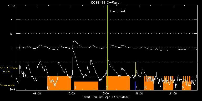 EIS Observation timeline overlay to GOES-Xray curve Code 1" 2" 40" 266" EIS Observations list for this event: STUDY ACRONYM ID DATE OBSERVED DESCRIPTION NOAA# TARGET 0 cam_ar_limb_lite_v2 | 33197 | 2013/04/27 09:53:17 | AR 11726 (temperature diagnostic) | 1726 | Active Region TIMELINE ID DATE OBSERVED FITS FILE XCEN (+W/-E) YCEN (+N/-S) DUR ----------------------------------------------------------------------------------------------------------------- 33197 | 2013/04/27 09:53:17.000 | eis_l0_20130427_095317.fits.gz | 999.69 | 269.30 | 2h6m1s 1 cam_ar_limb_lite_v2 | 33241 | 2013/04/27 12:15:55 | AR 11726 (temperature diagnostic) | 1726 | Active Region TIMELINE ID DATE OBSERVED FITS FILE XCEN (+W/-E) YCEN (+N/-S) DUR ----------------------------------------------------------------------------------------------------------------- 33241 | 2013/04/27 12:15:55.000 | eis_l0_20130427_121555.fits.gz | 999.69 | 269.30 | 2h6m1s 2 cam_ar_limb_lite_v2 | 33252 | 2013/04/27 15:05:04 | AR 11726 (temperature diagnostic) | 1726 | Active Region TIMELINE ID DATE OBSERVED FITS FILE XCEN (+W/-E) YCEN (+N/-S) DUR ----------------------------------------------------------------------------------------------------------------- 33252 | 2013/04/27 15:05:04.000 | eis_l0_20130427_150504.fits.gz | 999.69 | 269.38 | 2h6m1s 3 PRY_slot_contextLITE | 33254 | 2013/04/27 17:36:58 | EIS AIA alignment | 1730 | Active Region TIMELINE ID DATE OBSERVED FITS FILE XCEN (+W/-E) YCEN (+N/-S) DUR ----------------------------------------------------------------------------------------------------------------- 33254 | 2013/04/27 17:36:58.000 | eis_l0_20130427_173658.fits.gz | -15.29 | -0.65 | 2m56s 4 Alignment_266 | 33255 | 2013/04/27 17:40:55 | EIS AIA alignment | 1730 | Quiet Sun TIMELINE ID DATE OBSERVED FITS FILE XCEN (+W/-E) YCEN (+N/-S) DUR ----------------------------------------------------------------------------------------------------------------- 33255 | 2013/04/27 17:40:55.000 | eis_l0_20130427_174055.fits.gz | -132.57 | -0.58 | 1m22s 5 XRT_synop_AIA | 33256 | 2013/04/27 17:43:25 | EIS AIA alignment | 1730 | Quiet Sun TIMELINE ID DATE OBSERVED FITS FILE XCEN (+W/-E) YCEN (+N/-S) DUR ----------------------------------------------------------------------------------------------------------------- 33256 | 2013/04/27 17:43:25.000 | eis_l0_20130427_174325.fits.gz | -132.49 | -0.50 | 10s 6 HH_Flare+AR_180x152 | 33239 | 2013/04/27 18:27:32 | Flare obs. (AR 11726) | 1726 | Flare TIMELINE ID DATE OBSERVED FITS FILE XCEN (+W/-E) YCEN (+N/-S) DUR ----------------------------------------------------------------------------------------------------------------- 33239 | 2013/04/27 18:27:32.000 | eis_l0_20130427_182732.fits.gz | 977.72 | 219.46 | 5m17s 33239 | 2013/04/27 18:32:52.000 | eis_l0_20130427_183252.fits.gz | 977.72 | 219.30 | 5m18s 33239 | 2013/04/27 18:38:13.000 | eis_l0_20130427_183813.fits.gz | 977.72 | 219.38 | 5m18s 33239 | 2013/04/27 18:43:34.000 | eis_l0_20130427_184334.fits.gz | 977.80 | 219.23 | 5m18s 33239 | 2013/04/27 18:48:55.000 | eis_l0_20130427_184855.fits.gz | 977.72 | 219.30 | 5m18s 33239 | 2013/04/27 18:54:16.000 | eis_l0_20130427_185416.fits.gz | 977.65 | 219.46 | 5m18s 33239 | 2013/04/27 18:59:37.000 | eis_l0_20130427_185937.fits.gz | 977.65 | 219.54 | 5m18s 33239 | 2013/04/27 19:04:58.000 | eis_l0_20130427_190458.fits.gz | 977.72 | 219.38 | 5m18s 33239 | 2013/04/27 19:10:18.000 | eis_l0_20130427_191018.fits.gz | 977.72 | 219.54 | 5m19s 7 HH_Flare+AR_180x152 | 33240 | 2013/04/27 20:06:56 | Flare obs. (AR 11726) | 1726 | Flare TIMELINE ID DATE OBSERVED FITS FILE XCEN (+W/-E) YCEN (+N/-S) DUR ----------------------------------------------------------------------------------------------------------------- 33240 | 2013/04/27 20:06:56.000 | eis_l0_20130427_200656.fits.gz | 977.72 | 219.30 | 5m19s 33240 | 2013/04/27 20:12:17.000 | eis_l0_20130427_201217.fits.gz | 977.65 | 219.38 | 5m18s 33240 | 2013/04/27 20:17:38.000 | eis_l0_20130427_201738.fits.gz | 977.65 | 219.38 | 5m19s 33240 | 2013/04/27 20:23:00.000 | eis_l0_20130427_202300.fits.gz | 977.72 | 219.38 | 5m17s 33240 | 2013/04/27 20:28:20.000 | eis_l0_20130427_202820.fits.gz | 977.72 | 219.46 | 5m17s 33240 | 2013/04/27 20:33:40.000 | eis_l0_20130427_203340.fits.gz | 977.65 | 219.23 | 5m18s 33240 | 2013/04/27 20:39:01.000 | eis_l0_20130427_203901.fits.gz | 977.65 | 219.30 | 5m18s 33240 | 2013/04/27 20:44:21.000 | eis_l0_20130427_204421.fits.gz | 977.72 | 219.46 | 5m18s 33240 | 2013/04/27 20:49:42.000 | eis_l0_20130427_204942.fits.gz | 977.72 | 219.46 | 5m17s 33240 | 2013/04/27 20:55:02.000 | eis_l0_20130427_205502.fits.gz | 977.65 | 219.38 | 5m18s 8 HH_Flare+AR_180x152 | 33243 | 2013/04/27 21:46:27 | Flare obs. (AR 11726) | 1726 | Flare TIMELINE ID DATE OBSERVED FITS FILE XCEN (+W/-E) YCEN (+N/-S) DUR ----------------------------------------------------------------------------------------------------------------- 33243 | 2013/04/27 21:46:27.000 | eis_l0_20130427_214627.fits.gz | 977.65 | 219.38 | 5m19s 33243 | 2013/04/27 21:51:48.000 | eis_l0_20130427_215148.fits.gz | 977.72 | 219.23 | 5m18s 33243 | 2013/04/27 21:57:09.000 | eis_l0_20130427_215709.fits.gz | 977.72 | 219.38 | 5m18s 33243 | 2013/04/27 22:02:30.000 | eis_l0_20130427_220230.fits.gz | 977.72 | 219.46 | 5m18s 33243 | 2013/04/27 22:07:51.000 | eis_l0_20130427_220751.fits.gz | 977.72 | 219.30 | 5m18s 33243 | 2013/04/27 22:13:11.000 | eis_l0_20130427_221311.fits.gz | 977.65 | 219.38 | 5m18s 33243 | 2013/04/27 22:18:32.000 | eis_l0_20130427_221832.fits.gz | 977.65 | 219.54 | 5m18s 33243 | 2013/04/27 22:23:53.000 | eis_l0_20130427_222353.fits.gz | 977.72 | 219.46 | 5m18s 33243 | 2013/04/27 22:29:14.000 | eis_l0_20130427_222914.fits.gz | 977.80 | 219.38 | 5m18s : Check study information : Download file : View thumbnails For this event, also check for: