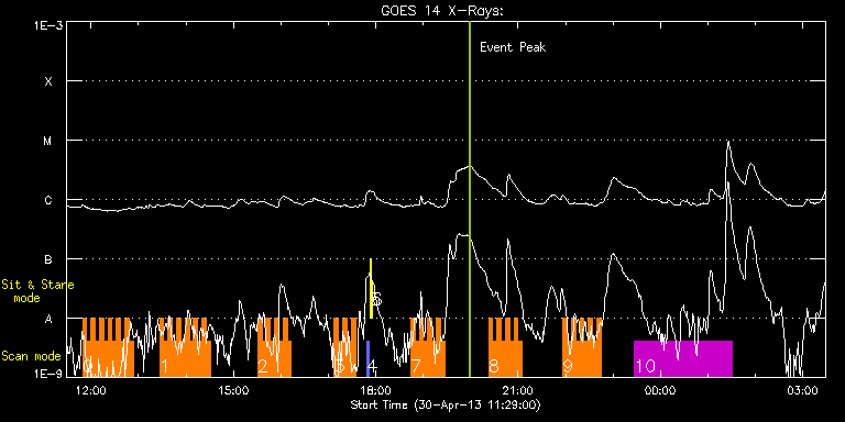 EIS Observation timeline overlay to GOES-Xray curve Code 1" 2" 40" 266" EIS Observations list for this event: STUDY ACRONYM ID DATE OBSERVED DESCRIPTION NOAA# TARGET 0 HH_Flare+AR_180x152H | 33265 | 2013/04/30 11:49:18 | AR11731 obs (flare) | 1731 | Flare TIMELINE ID DATE OBSERVED FITS FILE XCEN (+W/-E) YCEN (+N/-S) DUR ----------------------------------------------------------------------------------------------------------------- 33265 | 2013/04/30 11:49:18.000 | eis_l0_20130430_114918.fits.gz | -122.01 | 245.55 | 5m17s 33265 | 2013/04/30 11:54:38.000 | eis_l0_20130430_115438.fits.gz | -121.31 | 245.79 | 5m18s 33265 | 2013/04/30 11:59:59.000 | eis_l0_20130430_115959.fits.gz | -120.39 | 245.63 | 5m19s 33265 | 2013/04/30 12:05:21.000 | eis_l0_20130430_120521.fits.gz | -119.54 | 245.55 | 5m17s 33265 | 2013/04/30 12:10:41.000 | eis_l0_20130430_121041.fits.gz | -118.84 | 245.63 | 5m17s 33265 | 2013/04/30 12:16:01.000 | eis_l0_20130430_121601.fits.gz | -117.99 | 245.55 | 5m18s 33265 | 2013/04/30 12:21:22.000 | eis_l0_20130430_122122.fits.gz | -117.14 | 245.40 | 5m18s 33265 | 2013/04/30 12:26:42.000 | eis_l0_20130430_122642.fits.gz | -116.37 | 245.55 | 5m18s 33265 | 2013/04/30 12:32:03.000 | eis_l0_20130430_123203.fits.gz | -115.52 | 245.55 | 5m19s 33265 | 2013/04/30 12:37:25.000 | eis_l0_20130430_123725.fits.gz | -114.67 | 245.48 | 5m18s 33265 | 2013/04/30 12:42:45.000 | eis_l0_20130430_124245.fits.gz | -113.98 | 245.55 | 5m18s 33265 | 2013/04/30 12:48:06.000 | eis_l0_20130430_124806.fits.gz | -113.13 | 245.63 | 5m18s 1 HH_Flare+AR_180x152H | 33266 | 2013/04/30 13:26:49 | AR11731 obs (flare) | 1731 | Flare TIMELINE ID DATE OBSERVED FITS FILE XCEN (+W/-E) YCEN (+N/-S) DUR ----------------------------------------------------------------------------------------------------------------- 33266 | 2013/04/30 13:26:49.000 | eis_l0_20130430_132649.fits.gz | -107.18 | 245.55 | 5m18s 33266 | 2013/04/30 13:32:10.000 | eis_l0_20130430_133210.fits.gz | -106.33 | 245.63 | 5m18s 33266 | 2013/04/30 13:37:31.000 | eis_l0_20130430_133731.fits.gz | -105.56 | 245.55 | 5m18s 33266 | 2013/04/30 13:42:51.000 | eis_l0_20130430_134251.fits.gz | -104.71 | 245.63 | 5m18s 33266 | 2013/04/30 13:48:12.000 | eis_l0_20130430_134812.fits.gz | -104.01 | 245.55 | 5m18s 33266 | 2013/04/30 13:53:33.000 | eis_l0_20130430_135333.fits.gz | -103.08 | 245.40 | 5m18s 33266 | 2013/04/30 13:58:54.000 | eis_l0_20130430_135854.fits.gz | -102.31 | 245.40 | 5m18s 33266 | 2013/04/30 14:04:14.000 | eis_l0_20130430_140414.fits.gz | -101.46 | 245.40 | 5m19s 33266 | 2013/04/30 14:09:35.000 | eis_l0_20130430_140935.fits.gz | -100.61 | 245.40 | 5m18s 33266 | 2013/04/30 14:14:56.000 | eis_l0_20130430_141456.fits.gz | -99.92 | 245.32 | 5m18s 33266 | 2013/04/30 14:20:17.000 | eis_l0_20130430_142017.fits.gz | -98.99 | 245.48 | 5m17s 33266 | 2013/04/30 14:25:37.000 | eis_l0_20130430_142537.fits.gz | -98.22 | 245.55 | 5m18s 2 HH_Flare+AR_180x152H | 33267 | 2013/04/30 15:30:44 | AR11731 obs (flare) | | Flare TIMELINE ID DATE OBSERVED FITS FILE XCEN (+W/-E) YCEN (+N/-S) DUR ----------------------------------------------------------------------------------------------------------------- 33267 | 2013/04/30 15:30:44.000 | eis_l0_20130430_153044.fits.gz | -88.25 | 245.32 | 5m18s 33267 | 2013/04/30 15:36:05.000 | eis_l0_20130430_153605.fits.gz | -87.33 | 245.48 | 5m22s 33267 | 2013/04/30 15:41:30.000 | eis_l0_20130430_154130.fits.gz | -86.63 | 245.48 | 5m17s 33267 | 2013/04/30 15:46:50.000 | eis_l0_20130430_154650.fits.gz | -85.78 | 245.55 | 5m17s 33267 | 2013/04/30 15:52:10.000 | eis_l0_20130430_155210.fits.gz | -85.01 | 245.55 | 5m18s 33267 | 2013/04/30 15:57:31.000 | eis_l0_20130430_155731.fits.gz | -84.08 | 245.40 | 5m18s 33267 | 2013/04/30 16:02:51.000 | eis_l0_20130430_160251.fits.gz | -83.31 | 245.32 | 5m18s 33267 | 2013/04/30 16:08:12.000 | eis_l0_20130430_160812.fits.gz | -82.46 | 245.17 | 5m18s 3 HH_Flare+AR_180x152H | 33268 | 2013/04/30 17:07:44 | AR11731 obs (flare) | | Flare TIMELINE ID DATE OBSERVED FITS FILE XCEN (+W/-E) YCEN (+N/-S) DUR ----------------------------------------------------------------------------------------------------------------- 33268 | 2013/04/30 17:07:44.000 | eis_l0_20130430_170744.fits.gz | -73.34 | 245.40 | 5m17s 33268 | 2013/04/30 17:13:04.000 | eis_l0_20130430_171304.fits.gz | -72.57 | 245.40 | 5m18s 33268 | 2013/04/30 17:18:25.000 | eis_l0_20130430_171825.fits.gz | -71.80 | 245.32 | 5m19s 33268 | 2013/04/30 17:23:46.000 | eis_l0_20130430_172346.fits.gz | -71.03 | 245.32 | 5m18s 33268 | 2013/04/30 17:29:06.000 | eis_l0_20130430_172906.fits.gz | -70.10 | 245.40 | 5m19s 4 PRY_slot_contextLITE | 33314 | 2013/04/30 17:49:20 | EIS AIA alignment | 1731 | Active Region TIMELINE ID DATE OBSERVED FITS FILE XCEN (+W/-E) YCEN (+N/-S) DUR ----------------------------------------------------------------------------------------------------------------- 33314 | 2013/04/30 17:49:20.000 | eis_l0_20130430_174920.fits.gz | -15.21 | -0.50 | 2m57s 5 Alignment_266 | 33315 | 2013/04/30 17:53:07 | EIS AIA alignment | 1731 | Quiet Sun TIMELINE ID DATE OBSERVED FITS FILE XCEN (+W/-E) YCEN (+N/-S) DUR ----------------------------------------------------------------------------------------------------------------- 33315 | 2013/04/30 17:53:07.000 | eis_l0_20130430_175307.fits.gz | -132.49 | -0.50 | 1m22s 6 XRT_synop_AIA | 33316 | 2013/04/30 17:55:37 | EIS AIA alignment | 1731 | Quiet Sun TIMELINE ID DATE OBSERVED FITS FILE XCEN (+W/-E) YCEN (+N/-S) DUR ----------------------------------------------------------------------------------------------------------------- 33316 | 2013/04/30 17:55:37.000 | eis_l0_20130430_175537.fits.gz | -132.49 | -0.50 | 10s 7 HH_Flare+AR_180x152H | 33301 | 2013/04/30 18:44:20 | AR11731 obs (flare) | | Flare TIMELINE ID DATE OBSERVED FITS FILE XCEN (+W/-E) YCEN (+N/-S) DUR ----------------------------------------------------------------------------------------------------------------- 33301 | 2013/04/30 18:44:20.000 | e