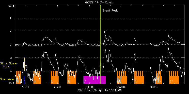 EIS Observation timeline overlay to GOES-Xray curve Code 1" 2" 40" 266" EIS Observations list for this event: STUDY ACRONYM ID DATE OBSERVED DESCRIPTION NOAA# TARGET 0 HH_Flare+AR_180x152H | 33268 | 2013/04/30 17:07:44 | AR11731 obs (flare) | | Flare TIMELINE ID DATE OBSERVED FITS FILE XCEN (+W/-E) YCEN (+N/-S) DUR ----------------------------------------------------------------------------------------------------------------- 33268 | 2013/04/30 17:07:44.000 | eis_l0_20130430_170744.fits.gz | -73.34 | 245.40 | 5m17s 33268 | 2013/04/30 17:13:04.000 | eis_l0_20130430_171304.fits.gz | -72.57 | 245.40 | 5m18s 33268 | 2013/04/30 17:18:25.000 | eis_l0_20130430_171825.fits.gz | -71.80 | 245.32 | 5m19s 33268 | 2013/04/30 17:23:46.000 | eis_l0_20130430_172346.fits.gz | -71.03 | 245.32 | 5m18s 33268 | 2013/04/30 17:29:06.000 | eis_l0_20130430_172906.fits.gz | -70.10 | 245.40 | 5m19s 1 PRY_slot_contextLITE | 33314 | 2013/04/30 17:49:20 | EIS AIA alignment | 1731 | Active Region TIMELINE ID DATE OBSERVED FITS FILE XCEN (+W/-E) YCEN (+N/-S) DUR ----------------------------------------------------------------------------------------------------------------- 33314 | 2013/04/30 17:49:20.000 | eis_l0_20130430_174920.fits.gz | -15.21 | -0.50 | 2m57s 2 Alignment_266 | 33315 | 2013/04/30 17:53:07 | EIS AIA alignment | 1731 | Quiet Sun TIMELINE ID DATE OBSERVED FITS FILE XCEN (+W/-E) YCEN (+N/-S) DUR ----------------------------------------------------------------------------------------------------------------- 33315 | 2013/04/30 17:53:07.000 | eis_l0_20130430_175307.fits.gz | -132.49 | -0.50 | 1m22s 3 XRT_synop_AIA | 33316 | 2013/04/30 17:55:37 | EIS AIA alignment | 1731 | Quiet Sun TIMELINE ID DATE OBSERVED FITS FILE XCEN (+W/-E) YCEN (+N/-S) DUR ----------------------------------------------------------------------------------------------------------------- 33316 | 2013/04/30 17:55:37.000 | eis_l0_20130430_175537.fits.gz | -132.49 | -0.50 | 10s 4 HH_Flare+AR_180x152H | 33301 | 2013/04/30 18:44:20 | AR11731 obs (flare) | | Flare TIMELINE ID DATE OBSERVED FITS FILE XCEN (+W/-E) YCEN (+N/-S) DUR ----------------------------------------------------------------------------------------------------------------- 33301 | 2013/04/30 18:44:20.000 | eis_l0_20130430_184420.fits.gz | -58.67 | 245.32 | 5m19s 33301 | 2013/04/30 18:49:41.000 | eis_l0_20130430_184941.fits.gz | -57.82 | 245.24 | 5m18s 33301 | 2013/04/30 18:55:02.000 | eis_l0_20130430_185502.fits.gz | -56.97 | 245.32 | 5m18s 33301 | 2013/04/30 19:00:22.000 | eis_l0_20130430_190022.fits.gz | -56.19 | 245.24 | 5m18s 33301 | 2013/04/30 19:05:43.000 | eis_l0_20130430_190543.fits.gz | -55.34 | 245.17 | 5m18s 33301 | 2013/04/30 19:11:03.000 | eis_l0_20130430_191103.fits.gz | -54.57 | 245.32 | 5m19s 33301 | 2013/04/30 19:16:25.000 | eis_l0_20130430_191625.fits.gz | -53.65 | 245.32 | 5m18s 33301 | 2013/04/30 19:21:45.000 | eis_l0_20130430_192145.fits.gz | -52.87 | 245.17 | 5m18s 5 HH_Flare+AR_180x152H | 33302 | 2013/04/30 20:22:38 | AR11731 obs (flare) | | Flare TIMELINE ID DATE OBSERVED FITS FILE XCEN (+W/-E) YCEN (+N/-S) DUR ----------------------------------------------------------------------------------------------------------------- 33302 | 2013/04/30 20:22:38.000 | eis_l0_20130430_202238.fits.gz | -63.49 | 244.94 | 5m17s 33302 | 2013/04/30 20:27:58.000 | eis_l0_20130430_202758.fits.gz | -62.72 | 245.17 | 5m19s 33302 | 2013/04/30 20:33:20.000 | eis_l0_20130430_203320.fits.gz | -61.95 | 245.01 | 5m17s 33302 | 2013/04/30 20:38:40.000 | eis_l0_20130430_203840.fits.gz | -61.02 | 245.01 | 5m18s 33302 | 2013/04/30 20:44:01.000 | eis_l0_20130430_204401.fits.gz | -60.25 | 245.01 | 5m19s 33302 | 2013/04/30 20:49:23.000 | eis_l0_20130430_204923.fits.gz | -59.48 | 245.01 | 5m17s 33302 | 2013/04/30 20:54:43.000 | eis_l0_20130430_205443.fits.gz | -58.63 | 245.17 | 5m18s 33302 | 2013/04/30 21:00:04.000 | eis_l0_20130430_210004.fits.gz | -57.85 | 245.01 | 5m18s 6 HH_Flare+AR_180x152H | 33303 | 2013/04/30 21:56:44 | AR11731 obs (flare) | 1731 | Flare TIMELINE ID DATE OBSERVED FITS FILE XCEN (+W/-E) YCEN (+N/-S) DUR ----------------------------------------------------------------------------------------------------------------- 33303 | 2013/04/30 21:56:44.000 | eis_l0_20130430_215644.fits.gz | -37.82 | 234.94 | 5m17s 33303 | 2013/04/30 22:02:04.000 | eis_l0_20130430_220204.fits.gz | -37.12 | 234.94 | 5m19s 33303 | 2013/04/30 22:07:25.000 | eis_l0_20130430_220725.fits.gz | -36.35 | 235.01 | 5m18s 33303 | 2013/04/30 22:12:46.000 | eis_l0_20130430_221246.fits.gz | -35.58 | 235.01 | 5m17s 33303 | 2013/04/30 22:18:06.000 | eis_l0_20130430_221806.fits.gz | -34.73 | 235.01 | 5m18s 33303 | 2013/04/30 22:23:27.000 | eis_l0_20130430_222327.fits.gz | -33.80 | 234.78 | 5m17s 33303 | 2013/04/30 22:28:47.000 | eis_l0_20130430_222847.fits.gz | -33.10 | 235.01 | 5m18s 33303 | 2013/04/30 22:34:08.000 | eis_l0_20130430_223408.fits.gz | -32.18 | 234.94 | 5m18s 33303 | 2013/04/30 22:39:29.000 | eis_l0_20130430_223929.fits.gz | -31.41 | 234.94 | 5m18s 7 HPW021_VEL_240x512v1 | 33269 | 2013/04/30 23:27:02 | AR11731 rater scan obs | 1731 | Active Region TIMELINE ID DATE OBSERVED FITS FILE XCEN (+W/-E) YCEN (+N/-S) DUR ----------------------------------------------------------------------------------------------------------------- 33269 | 2013/04/30 23:27:02.000 | eis_l0_20130430_232702.fits.gz | -29.65 | 244.86 | 2h3m48s 8 HH_Flare+AR_180x152 | 33304 | 2013/05/01 02:37:15 | AR11731 obs (flare) | 1731 | Flare TIMELINE ID DATE OBSERVED FITS FILE XCEN (+W/-E) YCEN (+N/-S) DUR ----------------------------------------------------------------------------------------------------------------- 33304 | 2013/05/01 02:37:15.000 | eis_l0_20130501_023715.fits.gz | 13.56 | 244.55 | 5m17s 33304 | 2013/05/01 02:42:35.000 | eis_l0_20130501_024235.fits.gz | 14.49 | 244.47 | 5m18s 33304 | 2013/05/01 02:47:56.000 | eis_l0_20130501_024756.fits.gz | 15.26 | 244.63 | 5m18s 33304 | 2013/05/01 02:53:16.000 | eis_l0_20130501_