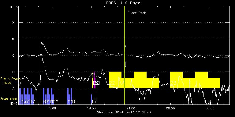 EIS Observation timeline overlay to GOES-Xray curve Code 1" 2" 40" 266" EIS Observations list for this event: STUDY ACRONYM ID DATE OBSERVED DESCRIPTION NOAA# TARGET 0 full_sun_slot_scan_2 | 33279 | 2013/05/01 12:33:23 | HOP 130 (5B/15) | | Quiet Sun TIMELINE ID DATE OBSERVED FITS FILE XCEN (+W/-E) YCEN (+N/-S) DUR ----------------------------------------------------------------------------------------------------------------- 33279 | 2013/05/01 12:33:23.000 | eis_l0_20130501_123323.fits.gz | -9884.69 | -10249.20 | 5m27s 1 full_sun_slot_scan_2 | 33280 | 2013/05/01 12:42:13 | HOP 130 (6T/15) | | Quiet Sun TIMELINE ID DATE OBSERVED FITS FILE XCEN (+W/-E) YCEN (+N/-S) DUR ----------------------------------------------------------------------------------------------------------------- 33280 | 2013/05/01 12:42:13.000 | eis_l0_20130501_124213.fits.gz | 731.46 | 655.47 | 5m27s 2 full_sun_slot_scan_2 | 33281 | 2013/05/01 12:52:13 | HOP 130 (7T/15) | | Quiet Sun TIMELINE ID DATE OBSERVED FITS FILE XCEN (+W/-E) YCEN (+N/-S) DUR ----------------------------------------------------------------------------------------------------------------- 33281 | 2013/05/01 12:52:13.000 | eis_l0_20130501_125213.fits.gz | 395.90 | 1032.67 | 5m27s 3 full_sun_slot_scan_2 | 33282 | 2013/05/01 12:59:23 | HOP 130 (7B/15) | 1728 | Quiet Sun TIMELINE ID DATE OBSERVED FITS FILE XCEN (+W/-E) YCEN (+N/-S) DUR ----------------------------------------------------------------------------------------------------------------- 33282 | 2013/05/01 12:59:23.000 | eis_l0_20130501_125923.fits.gz | 395.82 | 560.60 | 5m27s 4 full_sun_slot_scan_2 | 33283 | 2013/05/01 13:08:13 | HOP 130 (8T/15) | | Quiet Sun TIMELINE ID DATE OBSERVED FITS FILE XCEN (+W/-E) YCEN (+N/-S) DUR ----------------------------------------------------------------------------------------------------------------- 33283 | 2013/05/01 13:08:13.000 | eis_l0_20130501_130813.fits.gz | -15.29 | 1126.45 | 5m27s 5 full_sun_slot_scan_2 | 33284 | 2013/05/01 13:15:23 | HOP 130 (8B/15) | | Quiet Sun TIMELINE ID DATE OBSERVED FITS FILE XCEN (+W/-E) YCEN (+N/-S) DUR ----------------------------------------------------------------------------------------------------------------- 33284 | 2013/05/01 13:15:23.000 | eis_l0_20130501_131523.fits.gz | -15.21 | 654.53 | 5m27s 6 full_sun_slot_scan_2 | 33285 | 2013/05/01 13:24:13 | HOP 130 (9T/15) | | Quiet Sun TIMELINE ID DATE OBSERVED FITS FILE XCEN (+W/-E) YCEN (+N/-S) DUR ----------------------------------------------------------------------------------------------------------------- 33285 | 2013/05/01 13:24:13.000 | eis_l0_20130501_132413.fits.gz | -426.15 | 1032.52 | 5m27s 7 full_sun_slot_scan_2 | 33286 | 2013/05/01 13:31:23 | HOP 130 (9B/15) | | Quiet Sun TIMELINE ID DATE OBSERVED FITS FILE XCEN (+W/-E) YCEN (+N/-S) DUR ----------------------------------------------------------------------------------------------------------------- 33286 | 2013/05/01 13:31:23.000 | eis_l0_20130501_133123.fits.gz | -426.00 | 560.60 | 5m27s 8 full_sun_slot_scan_2 | 33287 | 2013/05/01 14:20:13 | HOP 130 (10T/15) | | Quiet Sun TIMELINE ID DATE OBSERVED FITS FILE XCEN (+W/-E) YCEN (+N/-S) DUR ----------------------------------------------------------------------------------------------------------------- 33287 | 2013/05/01 14:20:13.000 | eis_l0_20130501_142013.fits.gz | -830.08 | 655.63 | 5m28s 9 full_sun_slot_scan_2 | 33288 | 2013/05/01 14:30:13 | HOP 130 (11B/15) | | Quiet Sun TIMELINE ID DATE OBSERVED FITS FILE XCEN (+W/-E) YCEN (+N/-S) DUR ----------------------------------------------------------------------------------------------------------------- 33288 | 2013/05/01 14:30:13.000 | eis_l0_20130501_143013.fits.gz | 799.05 | -757.17 | 5m27s 10 full_sun_slot_scan_2 | 33289 | 2013/05/01 14:40:13 | HOP 130 (12T/15) | | Quiet Sun TIMELINE ID DATE OBSERVED FITS FILE XCEN (+W/-E) YCEN (+N/-S) DUR ----------------------------------------------------------------------------------------------------------------- 33289 | 2013/05/01 14:40:13.000 | eis_l0_20130501_144013.fits.gz | 395.90 | -661.75 | 5m27s 11 full_sun_slot_scan_2 | 33290 | 2013/05/01 14:47:23 | HOP 130 (12B/15) | | Quiet Sun TIMELINE ID DATE OBSERVED FITS FILE XCEN (+W/-E) YCEN (+N/-S) DUR ----------------------------------------------------------------------------------------------------------------- 33290 | 2013/05/01 14:47:23.000 | eis_l0_20130501_144723.fits.gz | 395.82 | -1133.44 | 5m27s 12 full_sun_slot_scan_2 | 33291 | 2013/05/01 14:56:13 | HOP 130 (13T/15) | | Quiet Sun TIMELINE ID DATE OBSERVED FITS FILE XCEN (+W/-E) YCEN (+N/-S) DUR ----------------------------------------------------------------------------------------------------------------- 33291 | 2013/05/01 14:56:13.000 | eis_l0_20130501_145613.fits.gz | -15.29 | -755.53 | 5m28s 13 full_sun_slot_scan_2 | 33292 | 2013/05/01 15:03:23 | HOP 130 (13B/15) | | Quiet Sun TIMELINE ID DATE OBSERVED FITS FILE XCEN (+W/-E) YCEN (+N/-S) DUR ----------------------------------------------------------------------------------------------------------------- 33292 | 2013/05/01 15:03:23.000 | eis_l0_20130501_150323.fits.gz | -15.29 | -1227.38 | 5m27s 14 full_sun_slot_scan_2 | 33293 | 2013/05/01 16:10:13 | HOP 130 (14T/15) | | Quiet Sun TIMELINE ID DATE OBSERVED FITS FILE XCEN (+W/-E) YCEN (+N/-S) DUR ----------------------------------------------------------------------------------------------------------------- 33293 | 2013/05/01 16:10:13.000 | eis_l0_20130501_161013.fits.gz | -426.15 | -661.37 | 5m27s 15 full_sun_slot_scan_2 | 33294 | 2013/05/01 16:17:23 | HOP 130 (14B/15) | | Quiet Sun TIMELINE ID DATE OBSERVED FITS FILE XCEN (+W/-E) YCEN (+N/-S) DUR ----------------------------------------------------------------------------------------------------------------- 33294 | 2013/05/01 16:17:23.000 | eis_l0_20130501_161723.fits.gz | -426.23 | -1133.37 | 5m27s 16 full_sun_slot_scan_2 | 33295 | 2013/05/01 16:26:13 | HOP 130 (15B/15) | | Quiet Sun TIMELINE 