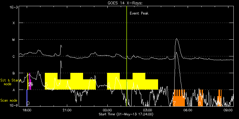 EIS Observation timeline overlay to GOES-Xray curve Code 1" 2" 40" 266" EIS Observations list for this event: STUDY ACRONYM ID DATE OBSERVED DESCRIPTION NOAA# TARGET 0 PRY_slot_contextLITE | 33317 | 2013/05/01 17:58:43 | EIS AIA alignment | 1731 | Active Region TIMELINE ID DATE OBSERVED FITS FILE XCEN (+W/-E) YCEN (+N/-S) DUR ----------------------------------------------------------------------------------------------------------------- 33317 | 2013/05/01 17:58:43.000 | eis_l0_20130501_175843.fits.gz | -15.29 | -0.58 | 2m56s 1 Alignment_266 | 33318 | 2013/05/01 18:02:36 | EIS AIA alignment | 1732 | Quiet Sun TIMELINE ID DATE OBSERVED FITS FILE XCEN (+W/-E) YCEN (+N/-S) DUR ----------------------------------------------------------------------------------------------------------------- 33318 | 2013/05/01 18:02:36.000 | eis_l0_20130501_180236.fits.gz | -132.49 | -0.50 | 1m22s 2 XRT_synop_AIA | 33319 | 2013/05/01 18:05:06 | EIS AIA alignment | 1732 | Quiet Sun TIMELINE ID DATE OBSERVED FITS FILE XCEN (+W/-E) YCEN (+N/-S) DUR ----------------------------------------------------------------------------------------------------------------- 33319 | 2013/05/01 18:05:06.000 | eis_l0_20130501_180506.fits.gz | -132.57 | -0.50 | 10s 3 regcal071 | 33296 | 2013/05/01 18:10:45 | Dark exposures, CCD bottom rows (100s | | Engineering TIMELINE ID DATE OBSERVED FITS FILE XCEN (+W/-E) YCEN (+N/-S) DUR ----------------------------------------------------------------------------------------------------------------- 33296 | 2013/05/01 18:10:45.000 | eis_l0_20130501_181045.fits.gz | 231.42 | -113.23 | 3m21s 4 regcal072 | 33297 | 2013/05/01 18:15:21 | Dark exposures, top CCD rows (100s exp | | Engineering TIMELINE ID DATE OBSERVED FITS FILE XCEN (+W/-E) YCEN (+N/-S) DUR ----------------------------------------------------------------------------------------------------------------- 33297 | 2013/05/01 18:15:21.000 | eis_l0_20130501_181521.fits.gz | 232.20 | 397.61 | 3m22s 5 FLARE266_TEST2 | 33299 | 2013/05/01 19:20:43 | | 1731 | Active Region TIMELINE ID DATE OBSERVED FITS FILE XCEN (+W/-E) YCEN (+N/-S) DUR ----------------------------------------------------------------------------------------------------------------- 33299 | 2013/05/01 19:20:43.000 | eis_l0_20130501_192043.fits.gz | 94.77 | 191.38 | 56m 33299 | 2013/05/01 20:17:35.000 | eis_l0_20130501_201735.fits.gz | 103.19 | 191.07 | 56m 33299 | 2013/05/01 21:14:27.000 | eis_l0_20130501_211427.fits.gz | 111.54 | 191.15 | 56m 33299 | 2013/05/01 22:11:19.000 | eis_l0_20130501_221119.fits.gz | 119.96 | 190.92 | 56m 6 FLARE266_TEST2 | 33300 | 2013/05/01 23:59:07 | | 1731 | Active Region TIMELINE ID DATE OBSERVED FITS FILE XCEN (+W/-E) YCEN (+N/-S) DUR ----------------------------------------------------------------------------------------------------------------- 33300 | 2013/05/01 23:59:07.000 | eis_l0_20130501_235907.fits.gz | 135.79 | 190.38 | 56m1s 33300 | 2013/05/02 00:55:59.000 | eis_l0_20130502_005559.fits.gz | 144.21 | 190.07 | 56m 33300 | 2013/05/02 01:52:51.000 | eis_l0_20130502_015251.fits.gz | 152.40 | 189.99 | 56m 33300 | 2013/05/02 02:49:43.000 | eis_l0_20130502_024943.fits.gz | 160.67 | 189.53 | 56m 7 HH_Flare+AR_180x152 | 33309 | 2013/05/02 04:52:47 | AR11731 obs (flare) | 1731 | Flare TIMELINE ID DATE OBSERVED FITS FILE XCEN (+W/-E) YCEN (+N/-S) DUR ----------------------------------------------------------------------------------------------------------------- 33309 | 2013/05/02 04:52:47.000 | eis_l0_20130502_045247.fits.gz | 260.86 | 239.07 | 5m19s 33309 | 2013/05/02 04:58:09.000 | eis_l0_20130502_045809.fits.gz | 261.55 | 239.07 | 5m17s 33309 | 2013/05/02 05:03:29.000 | eis_l0_20130502_050329.fits.gz | 262.32 | 239.07 | 5m18s 33309 | 2013/05/02 05:08:50.000 | eis_l0_20130502_050850.fits.gz | 263.17 | 238.99 | 5m18s 33309 | 2013/05/02 05:14:10.000 | eis_l0_20130502_051410.fits.gz | 263.95 | 238.83 | 5m18s 33309 | 2013/05/02 05:19:31.000 | eis_l0_20130502_051931.fits.gz | 264.72 | 238.83 | 5m18s 33309 | 2013/05/02 05:24:52.000 | eis_l0_20130502_052452.fits.gz | 265.49 | 238.76 | 5m17s 33309 | 2013/05/02 05:30:12.000 | eis_l0_20130502_053012.fits.gz | 266.18 | 238.76 | 5m18s 33309 | 2013/05/02 05:35:33.000 | eis_l0_20130502_053533.fits.gz | 267.04 | 238.83 | 5m18s 33309 | 2013/05/02 05:40:53.000 | eis_l0_20130502_054053.fits.gz | 267.73 | 238.83 | 5m18s 8 HH_Flare+AR_180x152 | 33312 | 2013/05/02 06:45:28 | AR11731 obs (flare) | 1731 | Flare TIMELINE ID DATE OBSERVED FITS FILE XCEN (+W/-E) YCEN (+N/-S) DUR ----------------------------------------------------------------------------------------------------------------- 33312 | 2013/05/02 06:45:28.000 | eis_l0_20130502_064528.fits.gz | 277.00 | 238.52 | 5m17s 33312 | 2013/05/02 06:50:48.000 | eis_l0_20130502_065048.fits.gz | 277.85 | 238.37 | 5m18s 33312 | 2013/05/02 06:56:09.000 | eis_l0_20130502_065609.fits.gz | 278.55 | 238.52 | 5m17s 33312 | 2013/05/02 07:01:29.000 | eis_l0_20130502_070129.fits.gz | 279.39 | 238.45 | 5m18s 9 HH_Flare+AR_180x152 | 33311 | 2013/05/02 08:11:43 | AR11731 obs (flare) | 1731 | Flare TIMELINE ID DATE OBSERVED FITS FILE XCEN (+W/-E) YCEN (+N/-S) DUR ----------------------------------------------------------------------------------------------------------------- 33311 | 2013/05/02 08:11:43.000 | eis_l0_20130502_081143.fits.gz | 289.36 | 238.06 | 5m18s 33311 | 2013/05/02 08:17:04.000 | eis_l0_20130502_081704.fits.gz | 290.13 | 238.06 | 5m18s 33311 | 2013/05/02 08:22:25.000 | eis_l0_20130502_082225.fits.gz | 290.98 | 237.98 | 5m18s 33311 | 2013/05/02 08:27:46.000 | eis_l0_20130502_082746.fits.gz | 291.68 | 238.06 | 1m56s : Check study information : Download file : View thumbnails For this event, also check for: