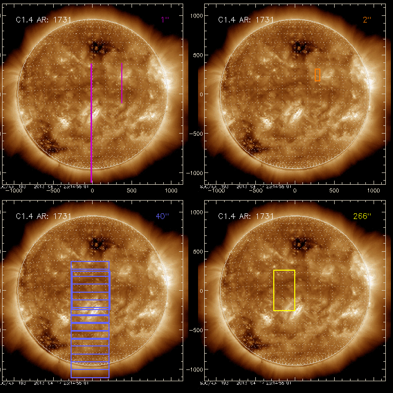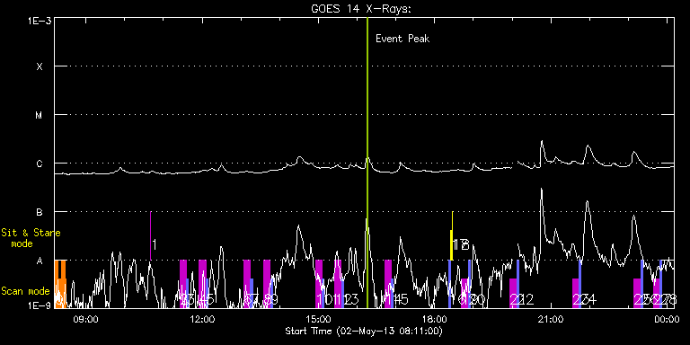 EIS Observation timeline overlay to GOES-Xray curve Code 1" 2" 40" 266" EIS Observations list for this event: STUDY ACRONYM ID DATE OBSERVED DESCRIPTION NOAA# TARGET 0 HH_Flare+AR_180x152 | 33311 | 2013/05/02 08:11:43 | AR11731 obs (flare) | 1731 | Flare TIMELINE ID DATE OBSERVED FITS FILE XCEN (+W/-E) YCEN (+N/-S) DUR ----------------------------------------------------------------------------------------------------------------- 33311 | 2013/05/02 08:11:43.000 | eis_l0_20130502_081143.fits.gz | 289.36 | 238.06 | 5m18s 33311 | 2013/05/02 08:17:04.000 | eis_l0_20130502_081704.fits.gz | 290.13 | 238.06 | 5m18s 33311 | 2013/05/02 08:22:25.000 | eis_l0_20130502_082225.fits.gz | 290.98 | 237.98 | 5m18s 33311 | 2013/05/02 08:27:46.000 | eis_l0_20130502_082746.fits.gz | 291.68 | 238.06 | 1m56s 1 regcal077 | 33369 | 2013/05/02 10:39:58 | Flatfield, 2 exposures, led 80ms, full | | Engineering TIMELINE ID DATE OBSERVED FITS FILE XCEN (+W/-E) YCEN (+N/-S) DUR ----------------------------------------------------------------------------------------------------------------- 33369 | 2013/05/02 10:39:58.000 | eis_l0_20130502_103958.fits.gz | 375.18 | 137.21 | 4s 2 SK_DEEP_5x512_SLIT1 | 33324 | 2013/05/02 11:25:27 | Support HOP 79 | | Quiet Sun TIMELINE ID DATE OBSERVED FITS FILE XCEN (+W/-E) YCEN (+N/-S) DUR ----------------------------------------------------------------------------------------------------------------- 33324 | 2013/05/02 11:25:27.000 | eis_l0_20130502_112527.fits.gz | -9869.46 | -9963.20 | 10m8s 3 PRY_slot_contextLITE | 33395 | 2013/05/02 11:36:00 | Support HOP 79 | | Active Region TIMELINE ID DATE OBSERVED FITS FILE XCEN (+W/-E) YCEN (+N/-S) DUR ----------------------------------------------------------------------------------------------------------------- 33395 | 2013/05/02 11:36:00.000 | eis_l0_20130502_113600.fits.gz | -9884.69 | -9963.20 | 2m57s 4 SK_DEEP_5x512_SLIT1 | 33396 | 2013/05/02 11:55:20 | Support HOP 79 | | Quiet Sun TIMELINE ID DATE OBSERVED FITS FILE XCEN (+W/-E) YCEN (+N/-S) DUR ----------------------------------------------------------------------------------------------------------------- 33396 | 2013/05/02 11:55:20.000 | eis_l0_20130502_115520.fits.gz | -15.28 | -865.52 | 10m8s 5 PRY_slot_contextLITE | 33397 | 2013/05/02 12:05:53 | Support HOP 79 | | Active Region TIMELINE ID DATE OBSERVED FITS FILE XCEN (+W/-E) YCEN (+N/-S) DUR ----------------------------------------------------------------------------------------------------------------- 33397 | 2013/05/02 12:05:53.000 | eis_l0_20130502_120553.fits.gz | -30.35 | -865.52 | 2m57s 6 SK_DEEP_5x512_SLIT1 | 33398 | 2013/05/02 13:04:20 | Support HOP 79 | | Quiet Sun TIMELINE ID DATE OBSERVED FITS FILE XCEN (+W/-E) YCEN (+N/-S) DUR ----------------------------------------------------------------------------------------------------------------- 33398 | 2013/05/02 13:04:20.000 | eis_l0_20130502_130420.fits.gz | -15.13 | -765.25 | 10m8s 7 PRY_slot_contextLITE | 33399 | 2013/05/02 13:14:53 | Support HOP 79 | | Active Region TIMELINE ID DATE OBSERVED FITS FILE XCEN (+W/-E) YCEN (+N/-S) DUR ----------------------------------------------------------------------------------------------------------------- 33399 | 2013/05/02 13:14:53.000 | eis_l0_20130502_131453.fits.gz | -30.35 | -765.33 | 2m56s 8 SK_DEEP_5x512_SLIT1 | 33400 | 2013/05/02 13:35:20 | Support HOP 79 | | Quiet Sun TIMELINE ID DATE OBSERVED FITS FILE XCEN (+W/-E) YCEN (+N/-S) DUR ----------------------------------------------------------------------------------------------------------------- 33400 | 2013/05/02 13:35:20.000 | eis_l0_20130502_133520.fits.gz | -15.13 | -665.29 | 10m8s 9 PRY_slot_contextLITE | 33401 | 2013/05/02 13:45:54 | Support HOP 79 | | Active Region TIMELINE ID DATE OBSERVED FITS FILE XCEN (+W/-E) YCEN (+N/-S) DUR ----------------------------------------------------------------------------------------------------------------- 33401 | 2013/05/02 13:45:54.000 | eis_l0_20130502_134554.fits.gz | -30.28 | -665.37 | 2m56s 10 SK_DEEP_5x512_SLIT1 | 33402 | 2013/05/02 14:55:20 | Support HOP 79 | | Quiet Sun TIMELINE ID DATE OBSERVED FITS FILE XCEN (+W/-E) YCEN (+N/-S) DUR ----------------------------------------------------------------------------------------------------------------- 33402 | 2013/05/02 14:55:20.000 | eis_l0_20130502_145520.fits.gz | -15.13 | -565.18 | 10m8s 11 PRY_slot_contextLITE | 33403 | 2013/05/02 15:05:54 | Support HOP 79 | | Active Region TIMELINE ID DATE OBSERVED FITS FILE XCEN (+W/-E) YCEN (+N/-S) DUR ----------------------------------------------------------------------------------------------------------------- 33403 | 2013/05/02 15:05:54.000 | eis_l0_20130502_150554.fits.gz | -30.35 | -565.34 | 2m56s 12 SK_DEEP_5x512_SLIT1 | 33404 | 2013/05/02 15:25:20 | Support HOP 79 | | Quiet Sun TIMELINE ID DATE OBSERVED FITS FILE XCEN (+W/-E) YCEN (+N/-S) DUR ----------------------------------------------------------------------------------------------------------------- 33404 | 2013/05/02 15:25:20.000 | eis_l0_20130502_152520.fits.gz | -15.13 | -465.53 | 10m8s 13 PRY_slot_contextLITE | 33405 | 2013/05/02 15:35:54 | Support HOP 79 | | Active Region TIMELINE ID DATE OBSERVED FITS FILE XCEN (+W/-E) YCEN (+N/-S) DUR ----------------------------------------------------------------------------------------------------------------- 33405 | 2013/05/02 15:35:54.000 | eis_l0_20130502_153554.fits.gz | -30.43 | -465.53 | 2m56s 14 SK_DEEP_5x512_SLIT1 | 33406 | 2013/05/02 16:42:20 | Support HOP 79 | | Quiet Sun TIMELINE ID DATE OBSERVED FITS FILE XCEN (+W/-E) YCEN (+N/-S) DUR ----------------------------------------------------------------------------------------------------------------- 33406 | 2013/05/02 16:42:20.000 | eis_l0_20130502_164220.fits.gz | -15.20 | -365.26 | 10m8s 15 PRY_slot_contextLITE | 33407 | 2013/05/02 16:52:54 | Support HOP 79 | 1732 | Active Region TIMELINE ID DATE OBSERVED FITS FILE XCEN (+W/-E) YCEN (+N/-S) DUR ------------------