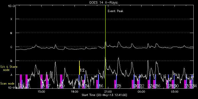 EIS Observation timeline overlay to GOES-Xray curve Code 1" 2" 40" 266" EIS Observations list for this event: STUDY ACRONYM ID DATE OBSERVED DESCRIPTION NOAA# TARGET 0 SK_DEEP_5x512_SLIT1 | 33398 | 2013/05/02 13:04:20 | Support HOP 79 | | Quiet Sun TIMELINE ID DATE OBSERVED FITS FILE XCEN (+W/-E) YCEN (+N/-S) DUR ----------------------------------------------------------------------------------------------------------------- 33398 | 2013/05/02 13:04:20.000 | eis_l0_20130502_130420.fits.gz | -15.13 | -765.25 | 10m8s 1 PRY_slot_contextLITE | 33399 | 2013/05/02 13:14:53 | Support HOP 79 | | Active Region TIMELINE ID DATE OBSERVED FITS FILE XCEN (+W/-E) YCEN (+N/-S) DUR ----------------------------------------------------------------------------------------------------------------- 33399 | 2013/05/02 13:14:53.000 | eis_l0_20130502_131453.fits.gz | -30.35 | -765.33 | 2m56s 2 SK_DEEP_5x512_SLIT1 | 33400 | 2013/05/02 13:35:20 | Support HOP 79 | | Quiet Sun TIMELINE ID DATE OBSERVED FITS FILE XCEN (+W/-E) YCEN (+N/-S) DUR ----------------------------------------------------------------------------------------------------------------- 33400 | 2013/05/02 13:35:20.000 | eis_l0_20130502_133520.fits.gz | -15.13 | -665.29 | 10m8s 3 PRY_slot_contextLITE | 33401 | 2013/05/02 13:45:54 | Support HOP 79 | | Active Region TIMELINE ID DATE OBSERVED FITS FILE XCEN (+W/-E) YCEN (+N/-S) DUR ----------------------------------------------------------------------------------------------------------------- 33401 | 2013/05/02 13:45:54.000 | eis_l0_20130502_134554.fits.gz | -30.28 | -665.37 | 2m56s 4 SK_DEEP_5x512_SLIT1 | 33402 | 2013/05/02 14:55:20 | Support HOP 79 | | Quiet Sun TIMELINE ID DATE OBSERVED FITS FILE XCEN (+W/-E) YCEN (+N/-S) DUR ----------------------------------------------------------------------------------------------------------------- 33402 | 2013/05/02 14:55:20.000 | eis_l0_20130502_145520.fits.gz | -15.13 | -565.18 | 10m8s 5 PRY_slot_contextLITE | 33403 | 2013/05/02 15:05:54 | Support HOP 79 | | Active Region TIMELINE ID DATE OBSERVED FITS FILE XCEN (+W/-E) YCEN (+N/-S) DUR ----------------------------------------------------------------------------------------------------------------- 33403 | 2013/05/02 15:05:54.000 | eis_l0_20130502_150554.fits.gz | -30.35 | -565.34 | 2m56s 6 SK_DEEP_5x512_SLIT1 | 33404 | 2013/05/02 15:25:20 | Support HOP 79 | | Quiet Sun TIMELINE ID DATE OBSERVED FITS FILE XCEN (+W/-E) YCEN (+N/-S) DUR ----------------------------------------------------------------------------------------------------------------- 33404 | 2013/05/02 15:25:20.000 | eis_l0_20130502_152520.fits.gz | -15.13 | -465.53 | 10m8s 7 PRY_slot_contextLITE | 33405 | 2013/05/02 15:35:54 | Support HOP 79 | | Active Region TIMELINE ID DATE OBSERVED FITS FILE XCEN (+W/-E) YCEN (+N/-S) DUR ----------------------------------------------------------------------------------------------------------------- 33405 | 2013/05/02 15:35:54.000 | eis_l0_20130502_153554.fits.gz | -30.43 | -465.53 | 2m56s 8 SK_DEEP_5x512_SLIT1 | 33406 | 2013/05/02 16:42:20 | Support HOP 79 | | Quiet Sun TIMELINE ID DATE OBSERVED FITS FILE XCEN (+W/-E) YCEN (+N/-S) DUR ----------------------------------------------------------------------------------------------------------------- 33406 | 2013/05/02 16:42:20.000 | eis_l0_20130502_164220.fits.gz | -15.20 | -365.26 | 10m8s 9 PRY_slot_contextLITE | 33407 | 2013/05/02 16:52:54 | Support HOP 79 | 1732 | Active Region TIMELINE ID DATE OBSERVED FITS FILE XCEN (+W/-E) YCEN (+N/-S) DUR ----------------------------------------------------------------------------------------------------------------- 33407 | 2013/05/02 16:52:54.000 | eis_l0_20130502_165254.fits.gz | -30.35 | -365.49 | 2m56s 10 PRY_slot_contextLITE | 33454 | 2013/05/02 18:21:11 | EIS-AIA alignment | 1732 | Active Region TIMELINE ID DATE OBSERVED FITS FILE XCEN (+W/-E) YCEN (+N/-S) DUR ----------------------------------------------------------------------------------------------------------------- 33454 | 2013/05/02 18:21:11.000 | eis_l0_20130502_182111.fits.gz | -15.21 | -0.42 | 2m56s 11 Alignment_266 | 33455 | 2013/05/02 18:24:37 | EIS-AIA alignment | 1732 | Quiet Sun TIMELINE ID DATE OBSERVED FITS FILE XCEN (+W/-E) YCEN (+N/-S) DUR ----------------------------------------------------------------------------------------------------------------- 33455 | 2013/05/02 18:24:37.000 | eis_l0_20130502_182437.fits.gz | -132.49 | -0.50 | 1m22s 12 XRT_synop_AIA | 33456 | 2013/05/02 18:27:08 | EIS-AIA alignment | 1732 | Quiet Sun TIMELINE ID DATE OBSERVED FITS FILE XCEN (+W/-E) YCEN (+N/-S) DUR ----------------------------------------------------------------------------------------------------------------- 33456 | 2013/05/02 18:27:08.000 | eis_l0_20130502_182708.fits.gz | -132.57 | -0.42 | 10s 13 SK_DEEP_5x512_SLIT1 | 33411 | 2013/05/02 18:41:21 | Support HOP 79 | | Quiet Sun TIMELINE ID DATE OBSERVED FITS FILE XCEN (+W/-E) YCEN (+N/-S) DUR ----------------------------------------------------------------------------------------------------------------- 33411 | 2013/05/02 18:41:21.000 | eis_l0_20130502_184121.fits.gz | -15.20 | -265.38 | 10m8s 14 PRY_slot_contextLITE | 33412 | 2013/05/02 18:51:54 | Support HOP 79 | 1732 | Active Region TIMELINE ID DATE OBSERVED FITS FILE XCEN (+W/-E) YCEN (+N/-S) DUR ----------------------------------------------------------------------------------------------------------------- 33412 | 2013/05/02 18:51:54.000 | eis_l0_20130502_185154.fits.gz | -30.43 | -265.46 | 2m57s 15 SK_DEEP_5x512_SLIT1 | 33413 | 2013/05/02 19:56:20 | Support HOP 79 | | Quiet Sun TIMELINE ID DATE OBSERVED FITS FILE XCEN (+W/-E) YCEN (+N/-S) DUR ----------------------------------------------------------------------------------------------------------------- 33413 | 2013/05/02 19:56:20.000 | eis_l0_20130502_195620.fits.gz | -15.05 | -165.12 | 10m8s 16 PRY_slot_contextLITE | 33414 | 2013/05/02 20:06:54 | Support HOP 79 | 1732 | Active Region TIM