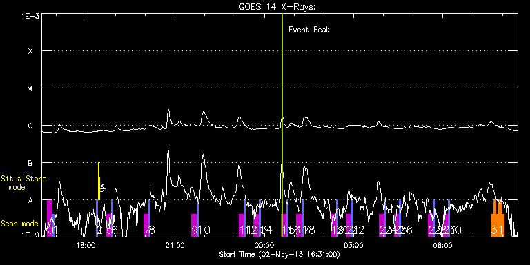 EIS Observation timeline overlay to GOES-Xray curve Code 1" 2" 40" 266" EIS Observations list for this event: STUDY ACRONYM ID DATE OBSERVED DESCRIPTION NOAA# TARGET 0 SK_DEEP_5x512_SLIT1 | 33406 | 2013/05/02 16:42:20 | Support HOP 79 | | Quiet Sun TIMELINE ID DATE OBSERVED FITS FILE XCEN (+W/-E) YCEN (+N/-S) DUR ----------------------------------------------------------------------------------------------------------------- 33406 | 2013/05/02 16:42:20.000 | eis_l0_20130502_164220.fits.gz | -15.20 | -365.26 | 10m8s 1 PRY_slot_contextLITE | 33407 | 2013/05/02 16:52:54 | Support HOP 79 | 1732 | Active Region TIMELINE ID DATE OBSERVED FITS FILE XCEN (+W/-E) YCEN (+N/-S) DUR ----------------------------------------------------------------------------------------------------------------- 33407 | 2013/05/02 16:52:54.000 | eis_l0_20130502_165254.fits.gz | -30.35 | -365.49 | 2m56s 2 PRY_slot_contextLITE | 33454 | 2013/05/02 18:21:11 | EIS-AIA alignment | 1732 | Active Region TIMELINE ID DATE OBSERVED FITS FILE XCEN (+W/-E) YCEN (+N/-S) DUR ----------------------------------------------------------------------------------------------------------------- 33454 | 2013/05/02 18:21:11.000 | eis_l0_20130502_182111.fits.gz | -15.21 | -0.42 | 2m56s 3 Alignment_266 | 33455 | 2013/05/02 18:24:37 | EIS-AIA alignment | 1732 | Quiet Sun TIMELINE ID DATE OBSERVED FITS FILE XCEN (+W/-E) YCEN (+N/-S) DUR ----------------------------------------------------------------------------------------------------------------- 33455 | 2013/05/02 18:24:37.000 | eis_l0_20130502_182437.fits.gz | -132.49 | -0.50 | 1m22s 4 XRT_synop_AIA | 33456 | 2013/05/02 18:27:08 | EIS-AIA alignment | 1732 | Quiet Sun TIMELINE ID DATE OBSERVED FITS FILE XCEN (+W/-E) YCEN (+N/-S) DUR ----------------------------------------------------------------------------------------------------------------- 33456 | 2013/05/02 18:27:08.000 | eis_l0_20130502_182708.fits.gz | -132.57 | -0.42 | 10s 5 SK_DEEP_5x512_SLIT1 | 33411 | 2013/05/02 18:41:21 | Support HOP 79 | | Quiet Sun TIMELINE ID DATE OBSERVED FITS FILE XCEN (+W/-E) YCEN (+N/-S) DUR ----------------------------------------------------------------------------------------------------------------- 33411 | 2013/05/02 18:41:21.000 | eis_l0_20130502_184121.fits.gz | -15.20 | -265.38 | 10m8s 6 PRY_slot_contextLITE | 33412 | 2013/05/02 18:51:54 | Support HOP 79 | 1732 | Active Region TIMELINE ID DATE OBSERVED FITS FILE XCEN (+W/-E) YCEN (+N/-S) DUR ----------------------------------------------------------------------------------------------------------------- 33412 | 2013/05/02 18:51:54.000 | eis_l0_20130502_185154.fits.gz | -30.43 | -265.46 | 2m57s 7 SK_DEEP_5x512_SLIT1 | 33413 | 2013/05/02 19:56:20 | Support HOP 79 | | Quiet Sun TIMELINE ID DATE OBSERVED FITS FILE XCEN (+W/-E) YCEN (+N/-S) DUR ----------------------------------------------------------------------------------------------------------------- 33413 | 2013/05/02 19:56:20.000 | eis_l0_20130502_195620.fits.gz | -15.05 | -165.12 | 10m8s 8 PRY_slot_contextLITE | 33414 | 2013/05/02 20:06:54 | Support HOP 79 | 1732 | Active Region TIMELINE ID DATE OBSERVED FITS FILE XCEN (+W/-E) YCEN (+N/-S) DUR ----------------------------------------------------------------------------------------------------------------- 33414 | 2013/05/02 20:06:54.000 | eis_l0_20130502_200654.fits.gz | -30.35 | -165.19 | 2m56s 9 SK_DEEP_5x512_SLIT1 | 33415 | 2013/05/02 21:33:20 | Support HOP 79 | | Quiet Sun TIMELINE ID DATE OBSERVED FITS FILE XCEN (+W/-E) YCEN (+N/-S) DUR ----------------------------------------------------------------------------------------------------------------- 33415 | 2013/05/02 21:33:20.000 | eis_l0_20130502_213320.fits.gz | -15.13 | -65.47 | 10m8s 10 PRY_slot_contextLITE | 33416 | 2013/05/02 21:43:54 | Support HOP 79 | 1732 | Active Region TIMELINE ID DATE OBSERVED FITS FILE XCEN (+W/-E) YCEN (+N/-S) DUR ----------------------------------------------------------------------------------------------------------------- 33416 | 2013/05/02 21:43:54.000 | eis_l0_20130502_214354.fits.gz | -30.51 | -65.47 | 2m56s 11 SK_DEEP_5x512_SLIT1 | 33417 | 2013/05/02 23:08:20 | Support HOP 79 | | Quiet Sun TIMELINE ID DATE OBSERVED FITS FILE XCEN (+W/-E) YCEN (+N/-S) DUR ----------------------------------------------------------------------------------------------------------------- 33417 | 2013/05/02 23:08:20.000 | eis_l0_20130502_230820.fits.gz | -15.05 | 24.53 | 10m8s 12 PRY_slot_contextLITE | 33418 | 2013/05/02 23:18:53 | Support HOP 79 | 1732 | Active Region TIMELINE ID DATE OBSERVED FITS FILE XCEN (+W/-E) YCEN (+N/-S) DUR ----------------------------------------------------------------------------------------------------------------- 33418 | 2013/05/02 23:18:53.000 | eis_l0_20130502_231853.fits.gz | -30.35 | 24.30 | 2m57s 13 SK_DEEP_5x512_SLIT1 | 33419 | 2013/05/02 23:38:20 | Support HOP 79 | | Quiet Sun TIMELINE ID DATE OBSERVED FITS FILE XCEN (+W/-E) YCEN (+N/-S) DUR ----------------------------------------------------------------------------------------------------------------- 33419 | 2013/05/02 23:38:20.000 | eis_l0_20130502_233820.fits.gz | -15.20 | 124.56 | 10m8s 14 PRY_slot_contextLITE | 33420 | 2013/05/02 23:48:53 | Support HOP 79 | | Active Region TIMELINE ID DATE OBSERVED FITS FILE XCEN (+W/-E) YCEN (+N/-S) DUR ----------------------------------------------------------------------------------------------------------------- 33420 | 2013/05/02 23:48:53.000 | eis_l0_20130502_234853.fits.gz | -30.43 | 124.56 | 2m57s 15 SK_DEEP_5x512_SLIT1 | 33421 | 2013/05/03 00:34:20 | Support HOP 79 | | Quiet Sun TIMELINE ID DATE OBSERVED FITS FILE XCEN (+W/-E) YCEN (+N/-S) DUR ----------------------------------------------------------------------------------------------------------------- 33421 | 2013/05/03 00:34:20.000 | eis_l0_20130503_003420.fits.gz | -15.13 | 224.68 | 10m8s 16 PRY_slot_contextLITE | 33422 | 2013/05/03 00:44:54 | Support HOP 79 | | Active Region TI
