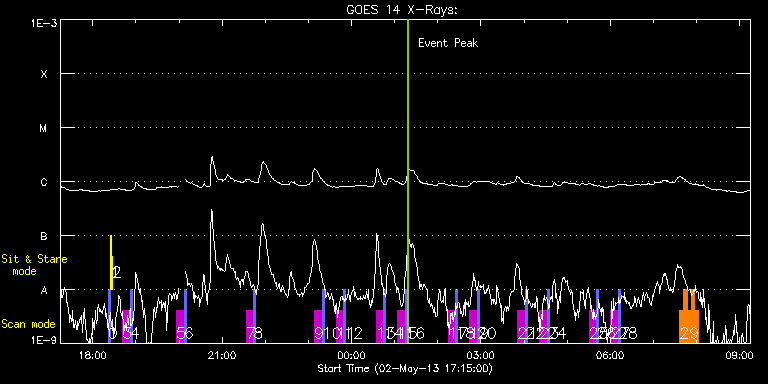 EIS Observation timeline overlay to GOES-Xray curve Code 1" 2" 40" 266" EIS Observations list for this event: STUDY ACRONYM ID DATE OBSERVED DESCRIPTION NOAA# TARGET 0 PRY_slot_contextLITE | 33454 | 2013/05/02 18:21:11 | EIS-AIA alignment | 1732 | Active Region TIMELINE ID DATE OBSERVED FITS FILE XCEN (+W/-E) YCEN (+N/-S) DUR ----------------------------------------------------------------------------------------------------------------- 33454 | 2013/05/02 18:21:11.000 | eis_l0_20130502_182111.fits.gz | -15.21 | -0.42 | 2m56s 1 Alignment_266 | 33455 | 2013/05/02 18:24:37 | EIS-AIA alignment | 1732 | Quiet Sun TIMELINE ID DATE OBSERVED FITS FILE XCEN (+W/-E) YCEN (+N/-S) DUR ----------------------------------------------------------------------------------------------------------------- 33455 | 2013/05/02 18:24:37.000 | eis_l0_20130502_182437.fits.gz | -132.49 | -0.50 | 1m22s 2 XRT_synop_AIA | 33456 | 2013/05/02 18:27:08 | EIS-AIA alignment | 1732 | Quiet Sun TIMELINE ID DATE OBSERVED FITS FILE XCEN (+W/-E) YCEN (+N/-S) DUR ----------------------------------------------------------------------------------------------------------------- 33456 | 2013/05/02 18:27:08.000 | eis_l0_20130502_182708.fits.gz | -132.57 | -0.42 | 10s 3 SK_DEEP_5x512_SLIT1 | 33411 | 2013/05/02 18:41:21 | Support HOP 79 | | Quiet Sun TIMELINE ID DATE OBSERVED FITS FILE XCEN (+W/-E) YCEN (+N/-S) DUR ----------------------------------------------------------------------------------------------------------------- 33411 | 2013/05/02 18:41:21.000 | eis_l0_20130502_184121.fits.gz | -15.20 | -265.38 | 10m8s 4 PRY_slot_contextLITE | 33412 | 2013/05/02 18:51:54 | Support HOP 79 | 1732 | Active Region TIMELINE ID DATE OBSERVED FITS FILE XCEN (+W/-E) YCEN (+N/-S) DUR ----------------------------------------------------------------------------------------------------------------- 33412 | 2013/05/02 18:51:54.000 | eis_l0_20130502_185154.fits.gz | -30.43 | -265.46 | 2m57s 5 SK_DEEP_5x512_SLIT1 | 33413 | 2013/05/02 19:56:20 | Support HOP 79 | | Quiet Sun TIMELINE ID DATE OBSERVED FITS FILE XCEN (+W/-E) YCEN (+N/-S) DUR ----------------------------------------------------------------------------------------------------------------- 33413 | 2013/05/02 19:56:20.000 | eis_l0_20130502_195620.fits.gz | -15.05 | -165.12 | 10m8s 6 PRY_slot_contextLITE | 33414 | 2013/05/02 20:06:54 | Support HOP 79 | 1732 | Active Region TIMELINE ID DATE OBSERVED FITS FILE XCEN (+W/-E) YCEN (+N/-S) DUR ----------------------------------------------------------------------------------------------------------------- 33414 | 2013/05/02 20:06:54.000 | eis_l0_20130502_200654.fits.gz | -30.35 | -165.19 | 2m56s 7 SK_DEEP_5x512_SLIT1 | 33415 | 2013/05/02 21:33:20 | Support HOP 79 | | Quiet Sun TIMELINE ID DATE OBSERVED FITS FILE XCEN (+W/-E) YCEN (+N/-S) DUR ----------------------------------------------------------------------------------------------------------------- 33415 | 2013/05/02 21:33:20.000 | eis_l0_20130502_213320.fits.gz | -15.13 | -65.47 | 10m8s 8 PRY_slot_contextLITE | 33416 | 2013/05/02 21:43:54 | Support HOP 79 | 1732 | Active Region TIMELINE ID DATE OBSERVED FITS FILE XCEN (+W/-E) YCEN (+N/-S) DUR ----------------------------------------------------------------------------------------------------------------- 33416 | 2013/05/02 21:43:54.000 | eis_l0_20130502_214354.fits.gz | -30.51 | -65.47 | 2m56s 9 SK_DEEP_5x512_SLIT1 | 33417 | 2013/05/02 23:08:20 | Support HOP 79 | | Quiet Sun TIMELINE ID DATE OBSERVED FITS FILE XCEN (+W/-E) YCEN (+N/-S) DUR ----------------------------------------------------------------------------------------------------------------- 33417 | 2013/05/02 23:08:20.000 | eis_l0_20130502_230820.fits.gz | -15.05 | 24.53 | 10m8s 10 PRY_slot_contextLITE | 33418 | 2013/05/02 23:18:53 | Support HOP 79 | 1732 | Active Region TIMELINE ID DATE OBSERVED FITS FILE XCEN (+W/-E) YCEN (+N/-S) DUR ----------------------------------------------------------------------------------------------------------------- 33418 | 2013/05/02 23:18:53.000 | eis_l0_20130502_231853.fits.gz | -30.35 | 24.30 | 2m57s 11 SK_DEEP_5x512_SLIT1 | 33419 | 2013/05/02 23:38:20 | Support HOP 79 | | Quiet Sun TIMELINE ID DATE OBSERVED FITS FILE XCEN (+W/-E) YCEN (+N/-S) DUR ----------------------------------------------------------------------------------------------------------------- 33419 | 2013/05/02 23:38:20.000 | eis_l0_20130502_233820.fits.gz | -15.20 | 124.56 | 10m8s 12 PRY_slot_contextLITE | 33420 | 2013/05/02 23:48:53 | Support HOP 79 | | Active Region TIMELINE ID DATE OBSERVED FITS FILE XCEN (+W/-E) YCEN (+N/-S) DUR ----------------------------------------------------------------------------------------------------------------- 33420 | 2013/05/02 23:48:53.000 | eis_l0_20130502_234853.fits.gz | -30.43 | 124.56 | 2m57s 13 SK_DEEP_5x512_SLIT1 | 33421 | 2013/05/03 00:34:20 | Support HOP 79 | | Quiet Sun TIMELINE ID DATE OBSERVED FITS FILE XCEN (+W/-E) YCEN (+N/-S) DUR ----------------------------------------------------------------------------------------------------------------- 33421 | 2013/05/03 00:34:20.000 | eis_l0_20130503_003420.fits.gz | -15.13 | 224.68 | 10m8s 14 PRY_slot_contextLITE | 33422 | 2013/05/03 00:44:54 | Support HOP 79 | | Active Region TIMELINE ID DATE OBSERVED FITS FILE XCEN (+W/-E) YCEN (+N/-S) DUR ----------------------------------------------------------------------------------------------------------------- 33422 | 2013/05/03 00:44:54.000 | eis_l0_20130503_004454.fits.gz | -30.35 | 224.45 | 2m56s 15 SK_DEEP_5x512_SLIT1 | 33423 | 2013/05/03 01:04:20 | Support HOP 79 | | Quiet Sun TIMELINE ID DATE OBSERVED FITS FILE XCEN (+W/-E) YCEN (+N/-S) DUR ----------------------------------------------------------------------------------------------------------------- 33423 | 2013/05/03 01:04:20.000 | eis_l0_20130503_010420.fits.gz | -15.05 | 324.71 | 10m8s 16 PRY_slot_contextLITE | 33424 | 2013/05/03 01:14:53 | Support HOP 79 | | Active Region TIMELINE 