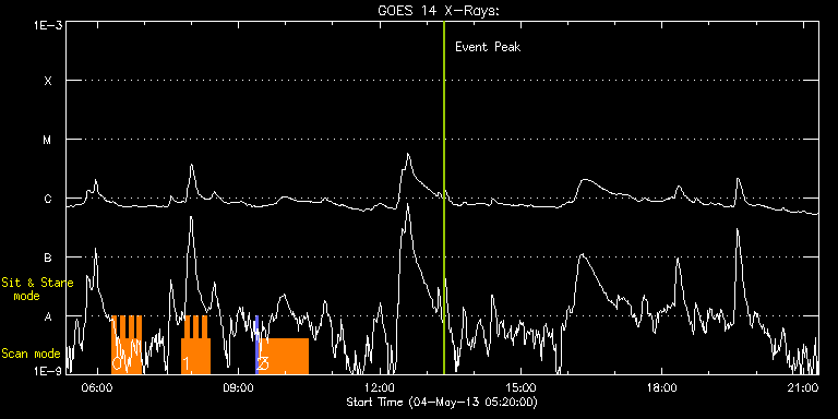 EIS Observation timeline overlay to GOES-Xray curve Code 1" 2" 40" 266" EIS Observations list for this event: STUDY ACRONYM ID DATE OBSERVED DESCRIPTION NOAA# TARGET 0 HH_Flare+AR_180x152H | 33453 | 2013/05/04 06:18:56 | AR 11731 | | Flare TIMELINE ID DATE OBSERVED FITS FILE XCEN (+W/-E) YCEN (+N/-S) DUR ----------------------------------------------------------------------------------------------------------------- 33453 | 2013/05/04 06:18:56.000 | eis_l0_20130504_061856.fits.gz | 596.79 | 94.14 | 5m18s 33453 | 2013/05/04 06:24:17.000 | eis_l0_20130504_062417.fits.gz | 597.41 | 93.83 | 5m18s 33453 | 2013/05/04 06:29:37.000 | eis_l0_20130504_062937.fits.gz | 597.95 | 93.98 | 5m18s 33453 | 2013/05/04 06:34:58.000 | eis_l0_20130504_063458.fits.gz | 598.49 | 93.60 | 5m17s 33453 | 2013/05/04 06:40:18.000 | eis_l0_20130504_064018.fits.gz | 599.03 | 93.67 | 5m18s 33453 | 2013/05/04 06:45:38.000 | eis_l0_20130504_064538.fits.gz | 599.65 | 93.83 | 5m19s 33453 | 2013/05/04 06:51:00.000 | eis_l0_20130504_065100.fits.gz | 600.03 | 93.60 | 5m17s 1 HH_Flare+AR_180x152H | 33391 | 2013/05/04 07:46:50 | AR 11731 | | Flare TIMELINE ID DATE OBSERVED FITS FILE XCEN (+W/-E) YCEN (+N/-S) DUR ----------------------------------------------------------------------------------------------------------------- 33391 | 2013/05/04 07:46:50.000 | eis_l0_20130504_074650.fits.gz | 715.98 | 113.05 | 5m17s 33391 | 2013/05/04 07:52:10.000 | eis_l0_20130504_075210.fits.gz | 716.52 | 113.13 | 5m18s 33391 | 2013/05/04 07:57:31.000 | eis_l0_20130504_075731.fits.gz | 717.06 | 113.13 | 5m18s 33391 | 2013/05/04 08:02:52.000 | eis_l0_20130504_080252.fits.gz | 717.60 | 113.05 | 5m18s 33391 | 2013/05/04 08:08:13.000 | eis_l0_20130504_080813.fits.gz | 718.22 | 112.98 | 5m18s 33391 | 2013/05/04 08:13:34.000 | eis_l0_20130504_081334.fits.gz | 718.68 | 112.90 | 5m18s 33391 | 2013/05/04 08:18:55.000 | eis_l0_20130504_081855.fits.gz | 719.22 | 112.98 | 5m17s 2 PRY_slot_context_v3 | 33457 | 2013/05/04 09:22:19 | EIS spectral atlas obs for QS | | Active Region TIMELINE ID DATE OBSERVED FITS FILE XCEN (+W/-E) YCEN (+N/-S) DUR ----------------------------------------------------------------------------------------------------------------- 33457 | 2013/05/04 09:22:19.000 | eis_l0_20130504_092219.fits.gz | 48.28 | 106.87 | 2m56s 3 Atlas_60 | 33458 | 2013/05/04 09:26:32 | EIS spectral atlas obs for QS | | Quiet Sun TIMELINE ID DATE OBSERVED FITS FILE XCEN (+W/-E) YCEN (+N/-S) DUR ----------------------------------------------------------------------------------------------------------------- 33458 | 2013/05/04 09:26:32.000 | eis_l0_20130504_092632.fits.gz | 63.80 | 107.03 | 1h1m39s : Check study information : Download file : View thumbnails For this event, also check for: