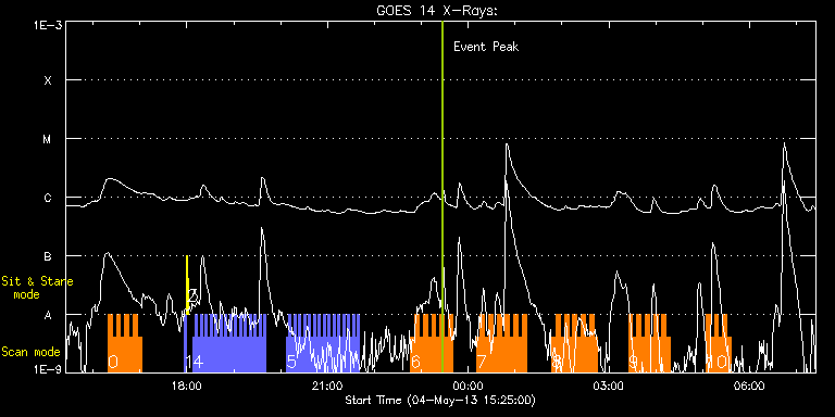 EIS Observation timeline overlay to GOES-Xray curve Code 1" 2" 40" 266" EIS Observations list for this event: STUDY ACRONYM ID DATE OBSERVED DESCRIPTION NOAA# TARGET 0 HH_Flare+AR_180x152H | 33478 | 2013/05/04 16:19:13 | Flare hunting. AR11731. | 1731 | Flare TIMELINE ID DATE OBSERVED FITS FILE XCEN (+W/-E) YCEN (+N/-S) DUR ----------------------------------------------------------------------------------------------------------------- 33478 | 2013/05/04 16:19:13.000 | eis_l0_20130504_161913.fits.gz | 737.48 | 194.65 | 5m18s 33478 | 2013/05/04 16:24:34.000 | eis_l0_20130504_162434.fits.gz | 738.03 | 194.65 | 5m18s 33478 | 2013/05/04 16:29:55.000 | eis_l0_20130504_162955.fits.gz | 738.57 | 194.50 | 5m18s 33478 | 2013/05/04 16:35:15.000 | eis_l0_20130504_163515.fits.gz | 738.95 | 194.42 | 5m18s 33478 | 2013/05/04 16:40:36.000 | eis_l0_20130504_164036.fits.gz | 739.41 | 194.50 | 5m18s 33478 | 2013/05/04 16:45:57.000 | eis_l0_20130504_164557.fits.gz | 740.03 | 194.34 | 5m17s 33478 | 2013/05/04 16:51:17.000 | eis_l0_20130504_165117.fits.gz | 740.57 | 194.50 | 5m17s 33478 | 2013/05/04 16:56:37.000 | eis_l0_20130504_165637.fits.gz | 741.04 | 194.34 | 5m18s 1 PRY_slot_contextLITE | 33507 | 2013/05/04 17:56:20 | EIS-AIA coalignment | 1734 | Active Region TIMELINE ID DATE OBSERVED FITS FILE XCEN (+W/-E) YCEN (+N/-S) DUR ----------------------------------------------------------------------------------------------------------------- 33507 | 2013/05/04 17:56:20.000 | eis_l0_20130504_175620.fits.gz | -15.29 | -0.50 | 2m56s 2 Alignment_266 | 33508 | 2013/05/04 17:59:34 | EIS-AIA coalignment | 1734 | Quiet Sun TIMELINE ID DATE OBSERVED FITS FILE XCEN (+W/-E) YCEN (+N/-S) DUR ----------------------------------------------------------------------------------------------------------------- 33508 | 2013/05/04 17:59:34.000 | eis_l0_20130504_175934.fits.gz | -132.49 | -0.58 | 1m23s 3 XRT_synop_AIA | 33509 | 2013/05/04 18:01:42 | EIS-AIA coalignment | 1734 | Quiet Sun TIMELINE ID DATE OBSERVED FITS FILE XCEN (+W/-E) YCEN (+N/-S) DUR ----------------------------------------------------------------------------------------------------------------- 33509 | 2013/05/04 18:01:42.000 | eis_l0_20130504_180142.fits.gz | -132.49 | -0.50 | 10s 4 Alignment_modify_v2 | 33461 | 2013/05/04 18:07:59 | Co-alingment. N-pole. | | Quiet Sun TIMELINE ID DATE OBSERVED FITS FILE XCEN (+W/-E) YCEN (+N/-S) DUR ----------------------------------------------------------------------------------------------------------------- 33461 | 2013/05/04 18:07:59.000 | eis_l0_20130504_180759.fits.gz | -9.55 | 944.47 | 2m34s 33461 | 2013/05/04 18:11:06.000 | eis_l0_20130504_181106.fits.gz | -9.55 | 944.62 | 2m34s 33461 | 2013/05/04 18:14:14.000 | eis_l0_20130504_181414.fits.gz | -9.55 | 944.39 | 2m34s 33461 | 2013/05/04 18:17:22.000 | eis_l0_20130504_181722.fits.gz | -9.47 | 944.32 | 2m33s 33461 | 2013/05/04 18:20:29.000 | eis_l0_20130504_182029.fits.gz | -9.55 | 944.39 | 2m34s 33461 | 2013/05/04 18:23:37.000 | eis_l0_20130504_182337.fits.gz | -9.63 | 944.62 | 2m34s 33461 | 2013/05/04 18:26:44.000 | eis_l0_20130504_182644.fits.gz | -9.47 | 944.47 | 2m34s 33461 | 2013/05/04 18:29:52.000 | eis_l0_20130504_182952.fits.gz | -9.47 | 944.47 | 2m34s 33461 | 2013/05/04 18:32:59.000 | eis_l0_20130504_183259.fits.gz | -9.47 | 944.55 | 2m34s 33461 | 2013/05/04 18:36:07.000 | eis_l0_20130504_183607.fits.gz | -9.47 | 944.62 | 2m34s 33461 | 2013/05/04 18:39:14.000 | eis_l0_20130504_183914.fits.gz | -9.47 | 944.55 | 2m34s 33461 | 2013/05/04 18:42:22.000 | eis_l0_20130504_184222.fits.gz | -9.47 | 944.55 | 2m34s 33461 | 2013/05/04 18:45:30.000 | eis_l0_20130504_184530.fits.gz | -9.47 | 944.62 | 2m33s 33461 | 2013/05/04 18:48:37.000 | eis_l0_20130504_184837.fits.gz | -9.47 | 944.47 | 2m34s 33461 | 2013/05/04 18:51:45.000 | eis_l0_20130504_185145.fits.gz | -9.47 | 944.47 | 2m34s 33461 | 2013/05/04 18:54:52.000 | eis_l0_20130504_185452.fits.gz | -9.55 | 944.55 | 2m34s 33461 | 2013/05/04 18:58:00.000 | eis_l0_20130504_185800.fits.gz | -9.63 | 944.62 | 2m34s 33461 | 2013/05/04 19:01:07.000 | eis_l0_20130504_190107.fits.gz | -9.55 | 944.47 | 2m34s 33461 | 2013/05/04 19:04:14.000 | eis_l0_20130504_190414.fits.gz | -9.55 | 944.47 | 2m34s 33461 | 2013/05/04 19:07:22.000 | eis_l0_20130504_190722.fits.gz | -9.47 | 944.55 | 2m34s 33461 | 2013/05/04 19:10:29.000 | eis_l0_20130504_191029.fits.gz | -9.47 | 944.70 | 2m34s 33461 | 2013/05/04 19:13:37.000 | eis_l0_20130504_191337.fits.gz | -9.39 | 944.47 | 2m34s 33461 | 2013/05/04 19:16:44.000 | eis_l0_20130504_191644.fits.gz | -9.55 | 944.39 | 2m34s 33461 | 2013/05/04 19:19:52.000 | eis_l0_20130504_191952.fits.gz | -9.55 | 944.39 | 2m34s 33461 | 2013/05/04 19:22:59.000 | eis_l0_20130504_192259.fits.gz | -9.47 | 944.55 | 2m35s 33461 | 2013/05/04 19:26:07.000 | eis_l0_20130504_192607.fits.gz | -9.39 | 944.55 | 2m34s 33461 | 2013/05/04 19:29:15.000 | eis_l0_20130504_192915.fits.gz | -9.47 | 944.47 | 2m33s 33461 | 2013/05/04 19:32:22.000 | eis_l0_20130504_193222.fits.gz | -9.55 | 944.55 | 2m34s 33461 | 2013/05/04 19:35:29.000 | eis_l0_20130504_193529.fits.gz | -9.55 | 944.62 | 2m34s 33461 | 2013/05/04 19:38:37.000 | eis_l0_20130504_193837.fits.gz | -9.55 | 944.62 | 2m34s 5 Alignment_modify_v2 | 33462 | 2013/05/04 20:07:45 | Co-alingment. E-limb. | | Quiet Sun TIMELINE ID DATE OBSERVED FITS FILE XCEN (+W/-E) YCEN (+N/-S) DUR ----------------------------------------------------------------------------------------------------------------- 33462 | 2013/05/04 20:07:45.000 | eis_l0_20130504_200745.fits.gz | -9893.92 | -9963.20 | 2m34s 33462 | 2013/05/04 20:10:53.000 | eis_l0_20130504_201053.fits.gz | -9893.92 | -9963.20 | 2m34s 33462 | 2013/05/04 20:14:00.000 | eis_l0_20130504_201400.fits.gz | -9893.92 | -9963.20 | 2m34s 33462 | 2013/05/04 20:17:08.000 | eis_l0_20130504_201708.fits.gz | -9893.92 | -9963.20 | 2m34s 33462 | 2013/05/04 20:20:15.000 | eis_l0_20130504_202015.fits.gz | -9893.92 | -9963.20 | 2m34s 33462 | 2013/05/04 20:23:23.000 | e