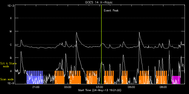 EIS Observation timeline overlay to GOES-Xray curve Code 1" 2" 40" 266" EIS Observations list for this event: STUDY ACRONYM ID DATE OBSERVED DESCRIPTION NOAA# TARGET 0 Alignment_modify_v2 | 33462 | 2013/05/04 20:07:45 | Co-alingment. E-limb. | | Quiet Sun TIMELINE ID DATE OBSERVED FITS FILE XCEN (+W/-E) YCEN (+N/-S) DUR ----------------------------------------------------------------------------------------------------------------- 33462 | 2013/05/04 20:07:45.000 | eis_l0_20130504_200745.fits.gz | -9893.92 | -9963.20 | 2m34s 33462 | 2013/05/04 20:10:53.000 | eis_l0_20130504_201053.fits.gz | -9893.92 | -9963.20 | 2m34s 33462 | 2013/05/04 20:14:00.000 | eis_l0_20130504_201400.fits.gz | -9893.92 | -9963.20 | 2m34s 33462 | 2013/05/04 20:17:08.000 | eis_l0_20130504_201708.fits.gz | -9893.92 | -9963.20 | 2m34s 33462 | 2013/05/04 20:20:15.000 | eis_l0_20130504_202015.fits.gz | -9893.92 | -9963.20 | 2m34s 33462 | 2013/05/04 20:23:23.000 | eis_l0_20130504_202323.fits.gz | -9893.92 | -9963.20 | 2m33s 33462 | 2013/05/04 20:26:30.000 | eis_l0_20130504_202630.fits.gz | -9893.92 | -9963.20 | 2m34s 33462 | 2013/05/04 20:29:38.000 | eis_l0_20130504_202938.fits.gz | -9893.92 | -9963.20 | 2m34s 33462 | 2013/05/04 20:32:45.000 | eis_l0_20130504_203245.fits.gz | -9893.92 | -9963.20 | 2m34s 33462 | 2013/05/04 20:35:53.000 | eis_l0_20130504_203553.fits.gz | -9893.92 | -9963.20 | 2m34s 33462 | 2013/05/04 20:39:00.000 | eis_l0_20130504_203900.fits.gz | -9893.92 | -9963.20 | 2m34s 33462 | 2013/05/04 20:42:08.000 | eis_l0_20130504_204208.fits.gz | -9893.92 | -9963.20 | 2m34s 33462 | 2013/05/04 20:45:15.000 | eis_l0_20130504_204515.fits.gz | -9893.92 | -9963.20 | 2m34s 33462 | 2013/05/04 20:48:23.000 | eis_l0_20130504_204823.fits.gz | -9893.92 | -9963.20 | 2m34s 33462 | 2013/05/04 20:51:31.000 | eis_l0_20130504_205131.fits.gz | -9893.92 | -9963.20 | 2m33s 33462 | 2013/05/04 20:54:38.000 | eis_l0_20130504_205438.fits.gz | -9893.92 | -9963.20 | 2m34s 33462 | 2013/05/04 20:57:45.000 | eis_l0_20130504_205745.fits.gz | -9893.92 | -9963.20 | 2m34s 33462 | 2013/05/04 21:00:53.000 | eis_l0_20130504_210053.fits.gz | -9893.92 | -9963.20 | 2m34s 33462 | 2013/05/04 21:04:00.000 | eis_l0_20130504_210400.fits.gz | -9893.92 | -9963.20 | 2m34s 33462 | 2013/05/04 21:07:08.000 | eis_l0_20130504_210708.fits.gz | -9893.92 | -9963.20 | 2m34s 33462 | 2013/05/04 21:10:16.000 | eis_l0_20130504_211016.fits.gz | -9893.92 | -9963.20 | 2m34s 33462 | 2013/05/04 21:13:23.000 | eis_l0_20130504_211323.fits.gz | -9893.92 | -9963.20 | 2m34s 33462 | 2013/05/04 21:16:31.000 | eis_l0_20130504_211631.fits.gz | -9893.92 | -9963.20 | 2m34s 33462 | 2013/05/04 21:19:38.000 | eis_l0_20130504_211938.fits.gz | -9893.92 | -9963.20 | 2m34s 33462 | 2013/05/04 21:22:46.000 | eis_l0_20130504_212246.fits.gz | -9893.92 | -9963.20 | 2m34s 33462 | 2013/05/04 21:25:54.000 | eis_l0_20130504_212554.fits.gz | -9893.92 | -9963.20 | 2m34s 33462 | 2013/05/04 21:29:01.000 | eis_l0_20130504_212901.fits.gz | -9893.92 | -9963.20 | 2m34s 33462 | 2013/05/04 21:32:09.000 | eis_l0_20130504_213209.fits.gz | -9893.92 | -9963.20 | 2m34s 33462 | 2013/05/04 21:35:16.000 | eis_l0_20130504_213516.fits.gz | -9893.92 | -9963.20 | 2m34s 33462 | 2013/05/04 21:38:23.000 | eis_l0_20130504_213823.fits.gz | -9893.92 | -9963.20 | 2m34s 1 HH_Flare+AR_180x152H | 33479 | 2013/05/04 22:46:33 | Flare hunting. AR11731. | 1731 | Flare TIMELINE ID DATE OBSERVED FITS FILE XCEN (+W/-E) YCEN (+N/-S) DUR ----------------------------------------------------------------------------------------------------------------- 33479 | 2013/05/04 22:46:33.000 | eis_l0_20130504_224633.fits.gz | 772.17 | 191.10 | 5m18s 33479 | 2013/05/04 22:51:54.000 | eis_l0_20130504_225154.fits.gz | 772.55 | 191.10 | 5m18s 33479 | 2013/05/04 22:57:15.000 | eis_l0_20130504_225715.fits.gz | 773.09 | 190.94 | 5m17s 33479 | 2013/05/04 23:02:35.000 | eis_l0_20130504_230235.fits.gz | 773.40 | 191.02 | 5m19s 33479 | 2013/05/04 23:07:57.000 | eis_l0_20130504_230757.fits.gz | 773.87 | 190.94 | 5m18s 33479 | 2013/05/04 23:13:17.000 | eis_l0_20130504_231317.fits.gz | 774.33 | 190.87 | 5m18s 33479 | 2013/05/04 23:18:38.000 | eis_l0_20130504_231838.fits.gz | 774.72 | 190.94 | 5m18s 33479 | 2013/05/04 23:23:59.000 | eis_l0_20130504_232359.fits.gz | 775.26 | 190.94 | 5m17s 33479 | 2013/05/04 23:29:19.000 | eis_l0_20130504_232919.fits.gz | 775.64 | 190.87 | 5m18s 33479 | 2013/05/04 23:34:40.000 | eis_l0_20130504_233440.fits.gz | 776.18 | 190.71 | 5m18s 2 HH_Flare+AR_180x152H | 33480 | 2013/05/05 00:10:14 | Flare hunting. AR11731. | 1731 | Flare TIMELINE ID DATE OBSERVED FITS FILE XCEN (+W/-E) YCEN (+N/-S) DUR ----------------------------------------------------------------------------------------------------------------- 33480 | 2013/05/05 00:10:14.000 | eis_l0_20130505_001014.fits.gz | 779.12 | 190.48 | 5m18s 33480 | 2013/05/05 00:15:35.000 | eis_l0_20130505_001535.fits.gz | 779.51 | 190.40 | 5m18s 33480 | 2013/05/05 00:20:55.000 | eis_l0_20130505_002055.fits.gz | 780.05 | 190.25 | 5m18s 33480 | 2013/05/05 00:26:16.000 | eis_l0_20130505_002616.fits.gz | 780.51 | 190.32 | 5m18s 33480 | 2013/05/05 00:31:37.000 | eis_l0_20130505_003137.fits.gz | 780.97 | 190.25 | 5m18s 33480 | 2013/05/05 00:36:58.000 | eis_l0_20130505_003658.fits.gz | 781.36 | 190.09 | 5m18s 33480 | 2013/05/05 00:42:19.000 | eis_l0_20130505_004219.fits.gz | 781.90 | 190.09 | 5m18s 33480 | 2013/05/05 00:47:40.000 | eis_l0_20130505_004740.fits.gz | 782.21 | 190.09 | 5m18s 33480 | 2013/05/05 00:53:00.000 | eis_l0_20130505_005300.fits.gz | 782.67 | 190.09 | 5m19s 33480 | 2013/05/05 00:58:21.000 | eis_l0_20130505_005821.fits.gz | 783.14 | 189.94 | 5m19s 33480 | 2013/05/05 01:03:42.000 | eis_l0_20130505_010342.fits.gz | 783.68 | 189.94 | 5m19s 33480 | 2013/05/05 01:09:03.000 | eis_l0_20130505_010903.fits.gz | 784.14 | 189.71 | 5m18s 3 HH_Flare+AR_180x152H | 33481 | 2013/05/05 01:47:13 | Flare hunting. AR11731. | 1731 | Flare TIMELINE ID DATE OBSERVED FITS FILE XCEN (+W/-E) YCEN (+N/-S) DUR ----